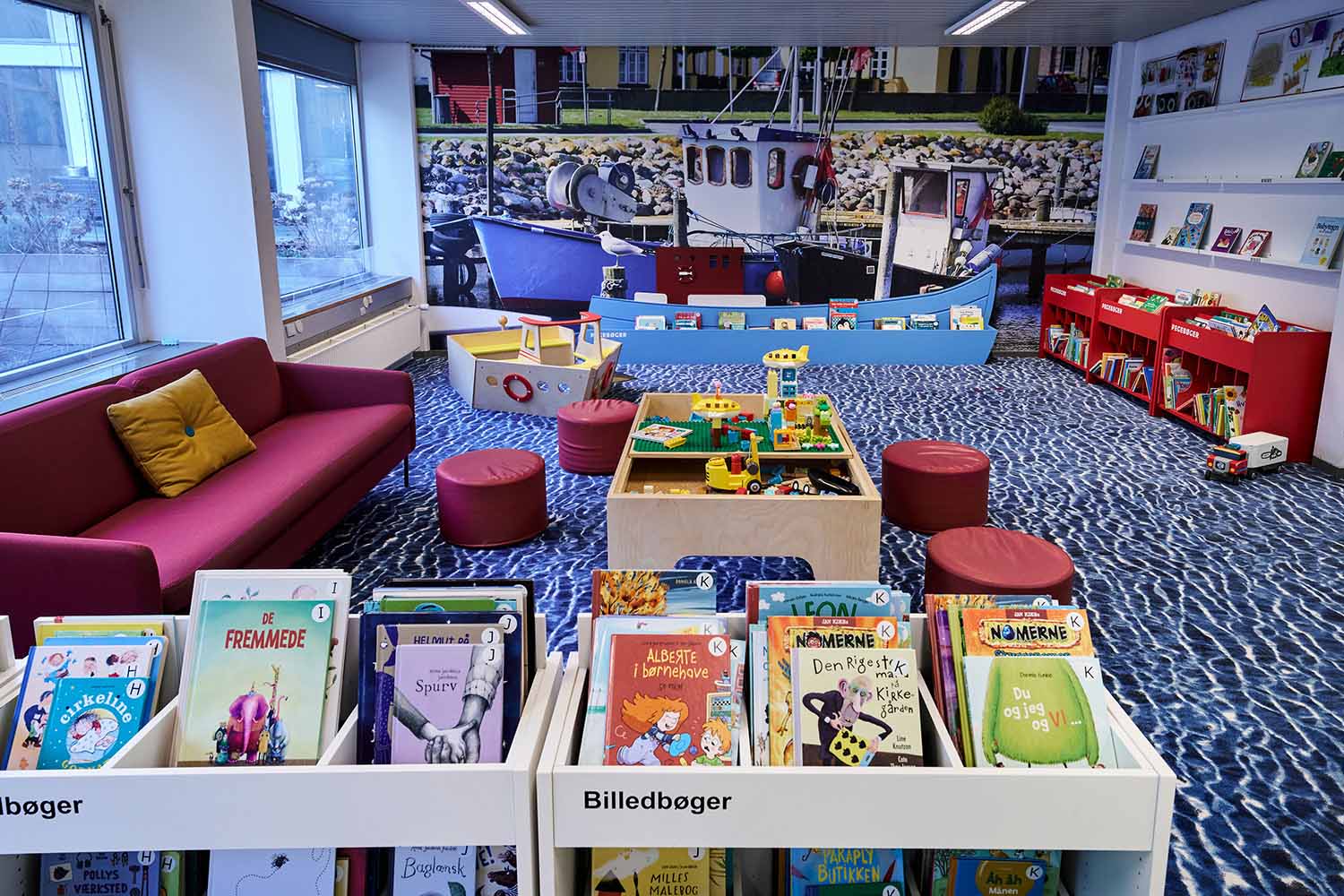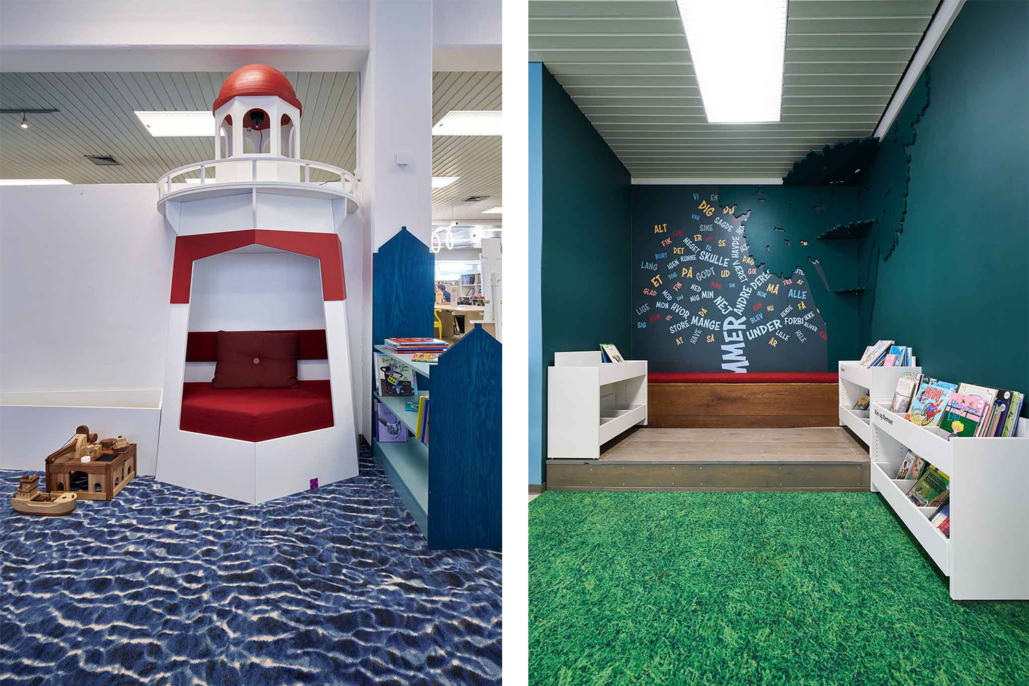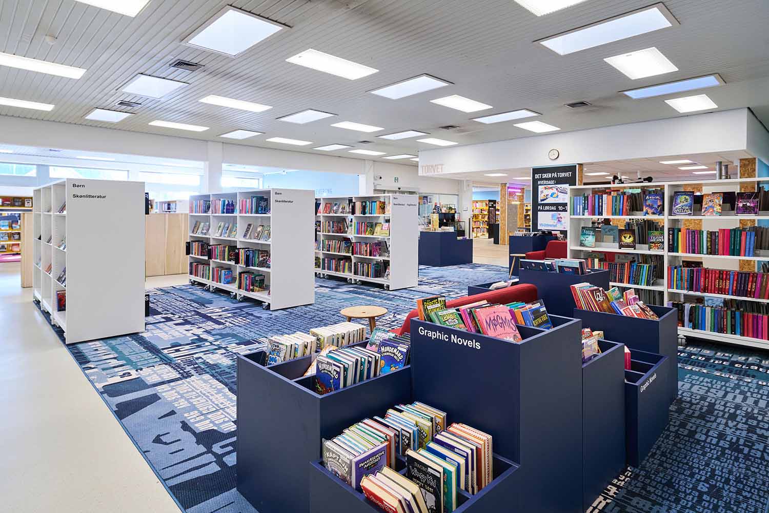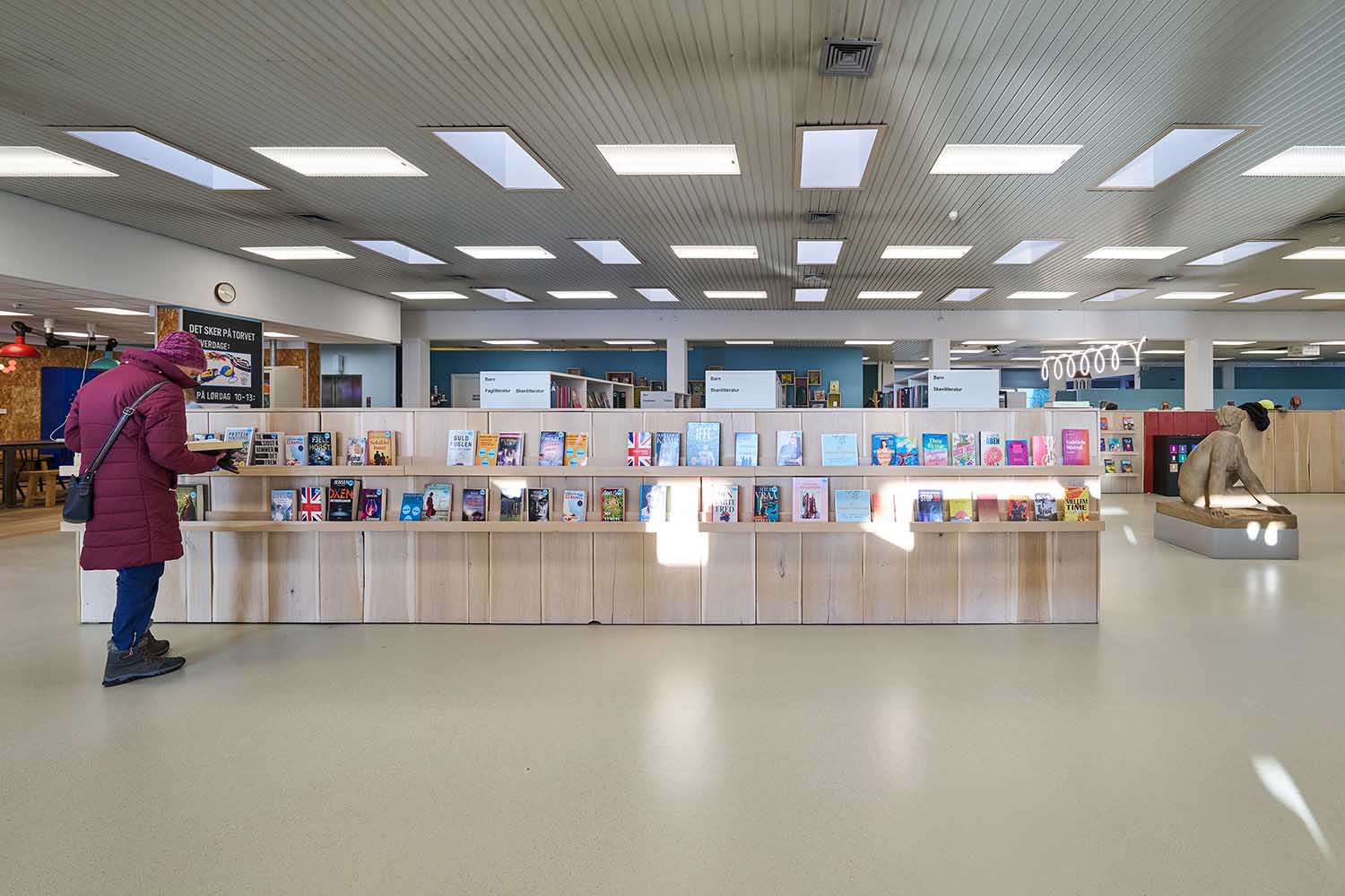 A key ambition of the project was to create “rooms within the room” in a single-room library, allowing target groups and functions to be understood intuitively. The children’s area has been expanded and designed as an engaging, experience-led environment with local references such as a lighthouse, a reading tree, and artistic installations, while the adult area presents a calmer atmosphere with taller shelving.