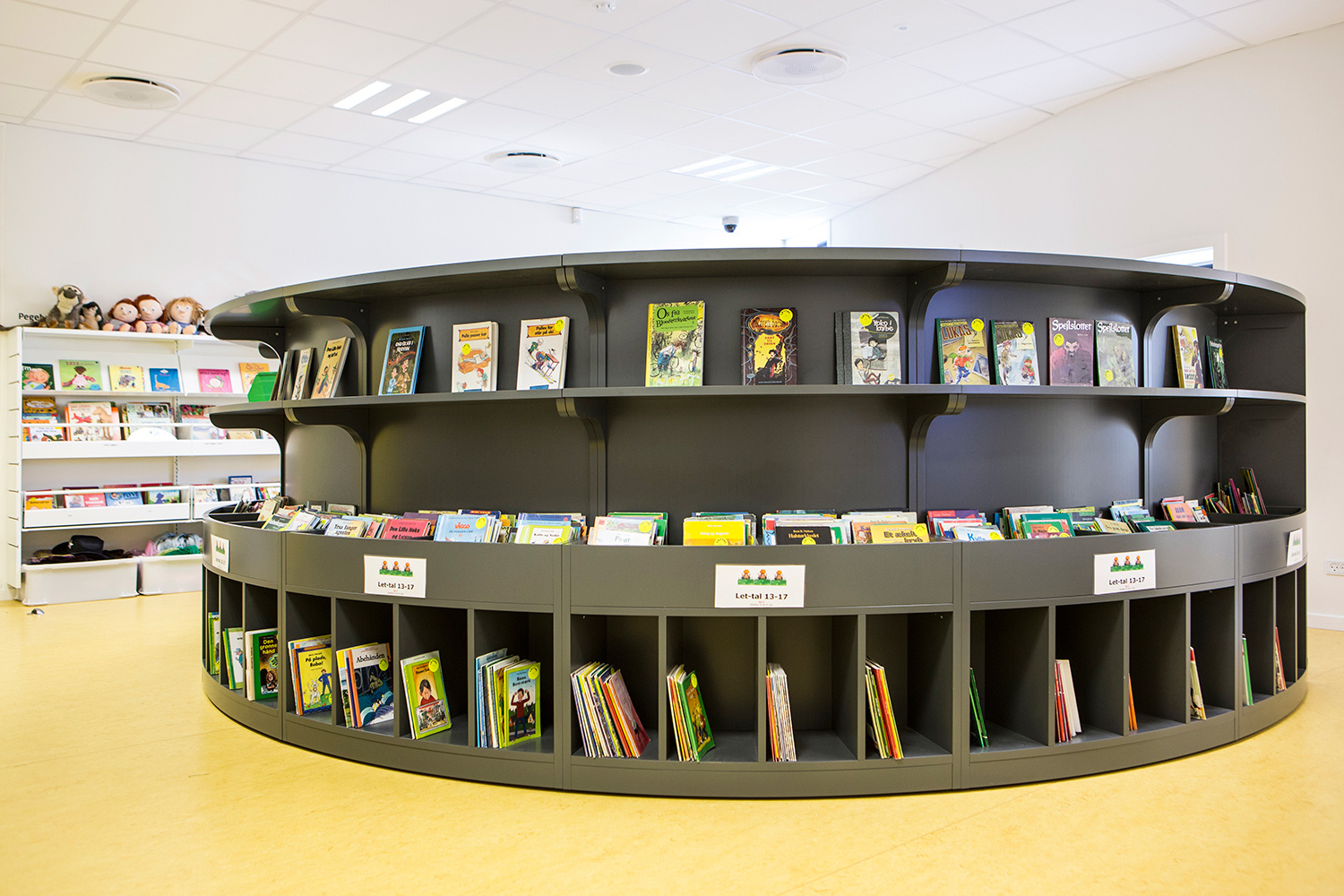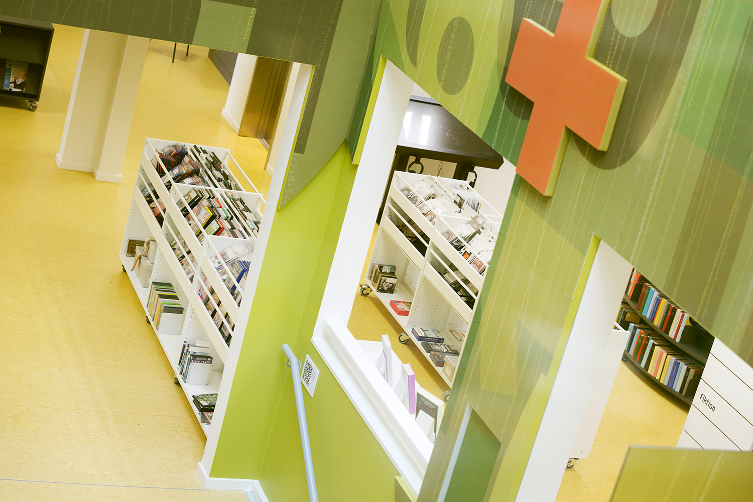 The interior designer Kirsten Brandt Jørgensen from Lammhults Biblioteksdesign A/S has among things been inspired by the decoration of staircases and walking areas by Peter Holst and the many linden trees in Christianfeld. There has among other things been made carpets shaped as the leaves of the linden tree. The ground floor is decorated with plenty of room for delivery, loan and reservation pick up as well as materials and place for small children and fiction for adults. In the children’s department, a round bookcase has been made with cribs both inside and outside with the opportunity for both storage and display of children books. A sensational storyteller chair creates a marvelous environment for both big and small.