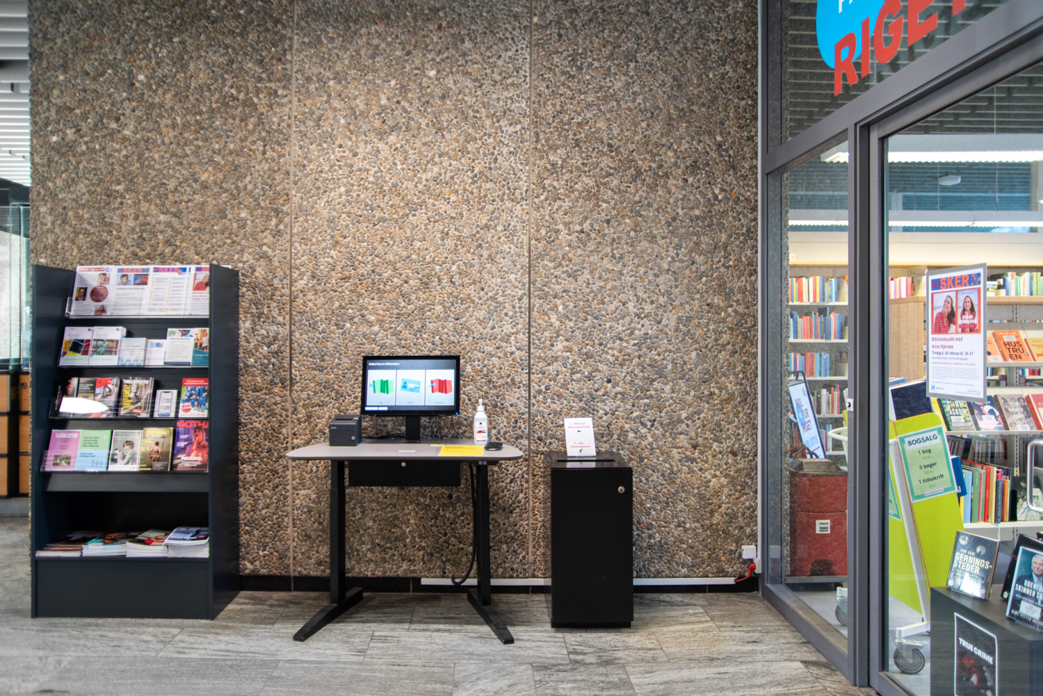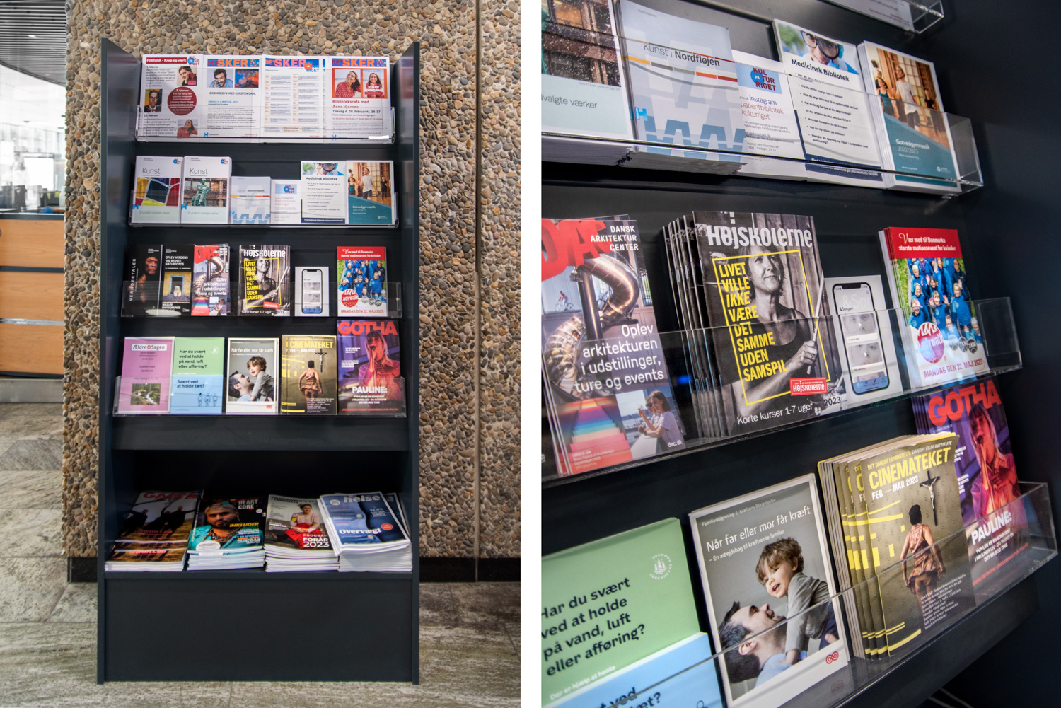 Beautiful display shelves can be seen on the end panels of the shelving systems with exciting reading. Furniture includes Hay and Andersen Furniture as well as customised newspaper and brochure racks.