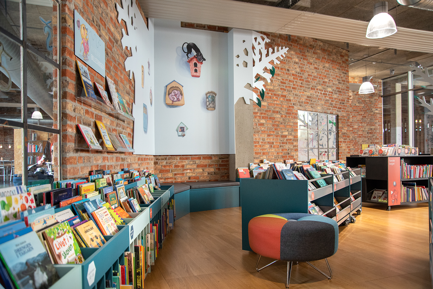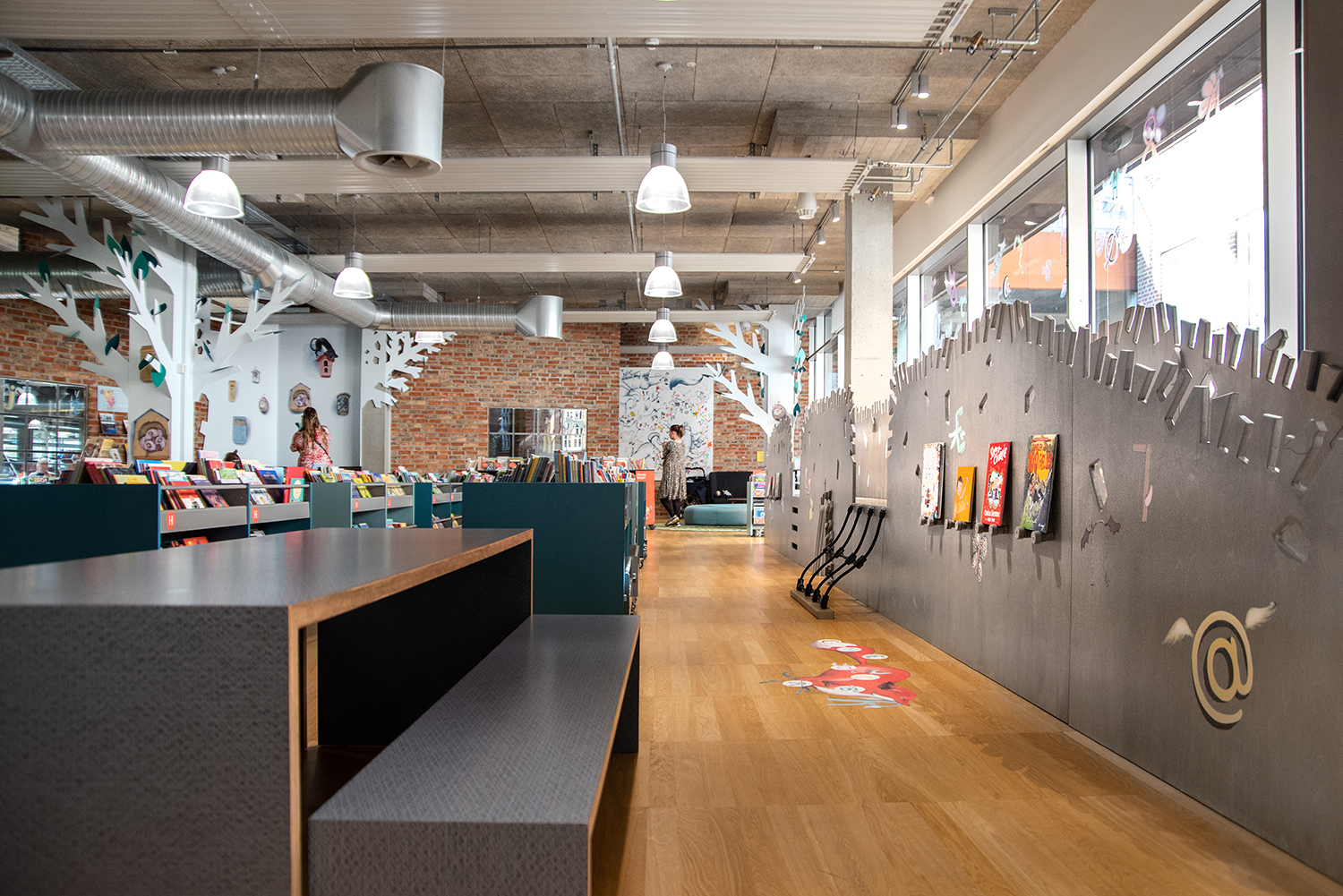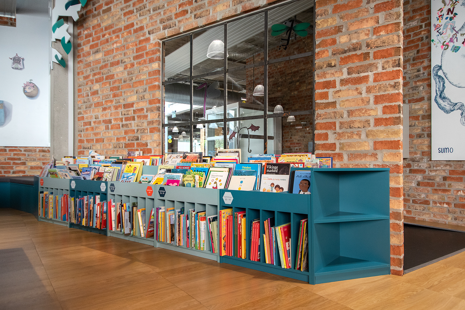 In 2021 the children's zone was renewed with browsers in beautiful pastel colours. The new soft look contrasts nicely with the existing rough new yorker environment.