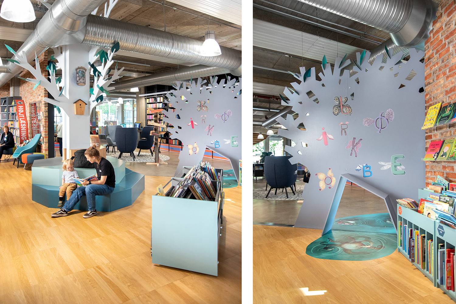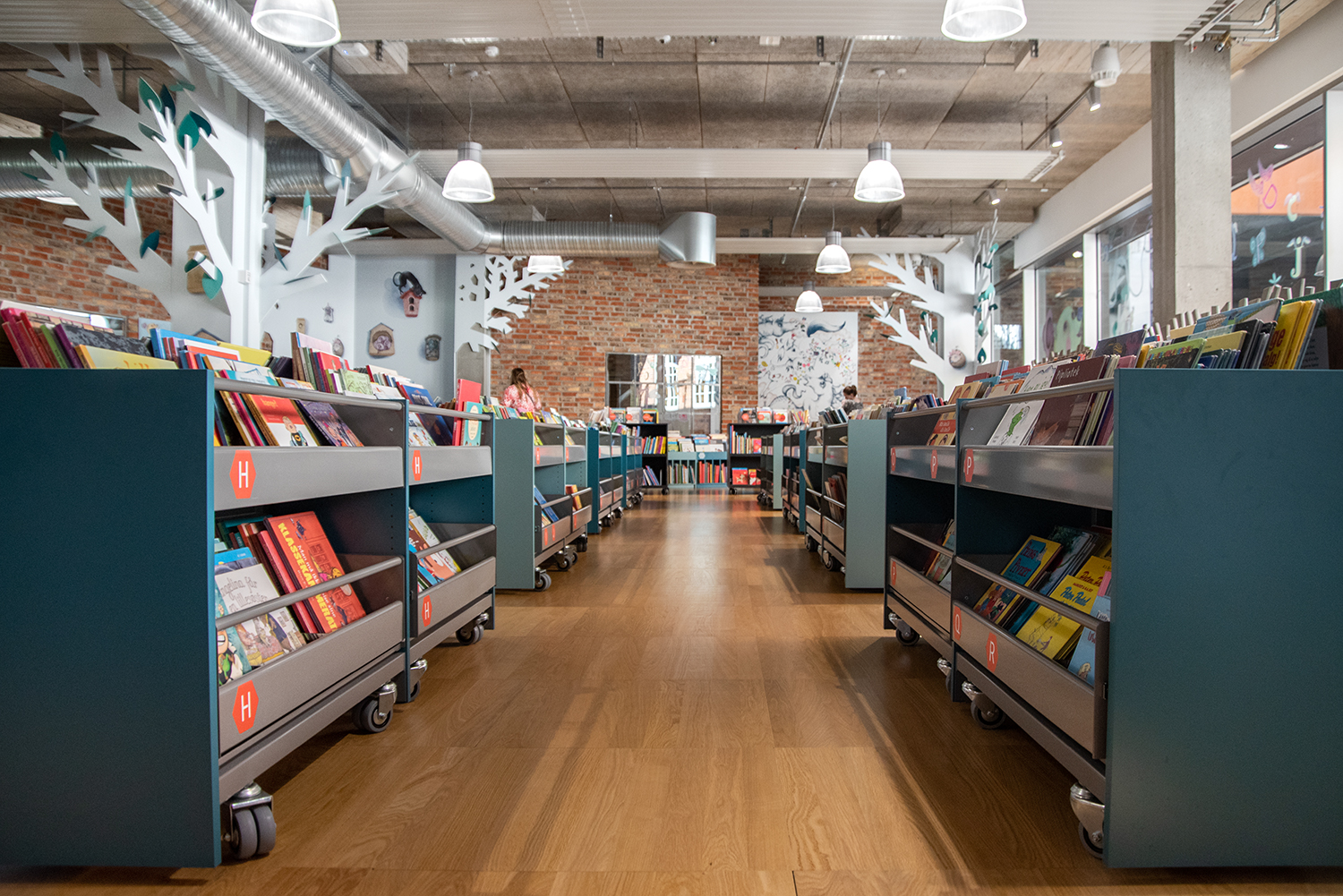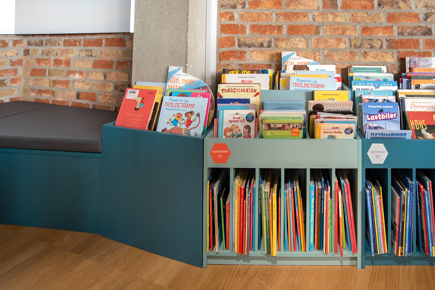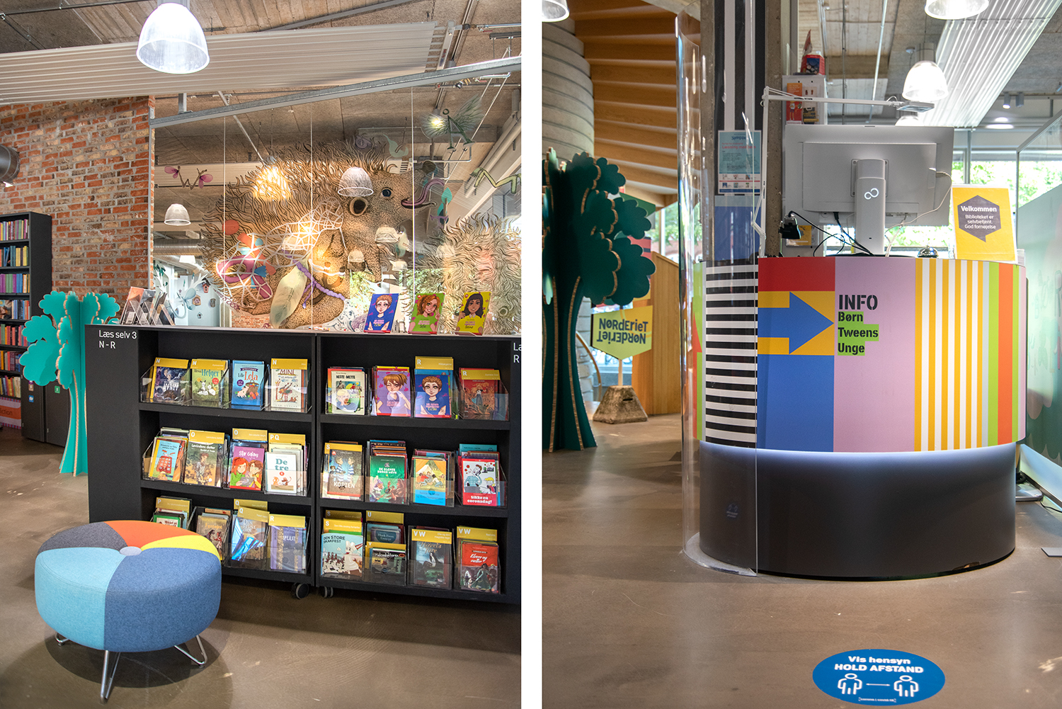 In 2021 the children's zone was renewed with browsers in beautiful pastel colours. The new soft look contrasts nicely with the existing rough new yorker environment.
