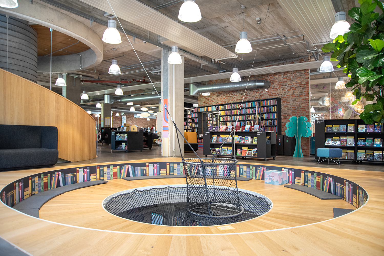 The building has four floors, the ground floor is the framework for the librarys primary services such as lending, culture, homework, scene, children's library and café. Meeting facilities and administration are located on the top two floors. The lower floor is called "The Deep", and here 90% of the library books are placed.