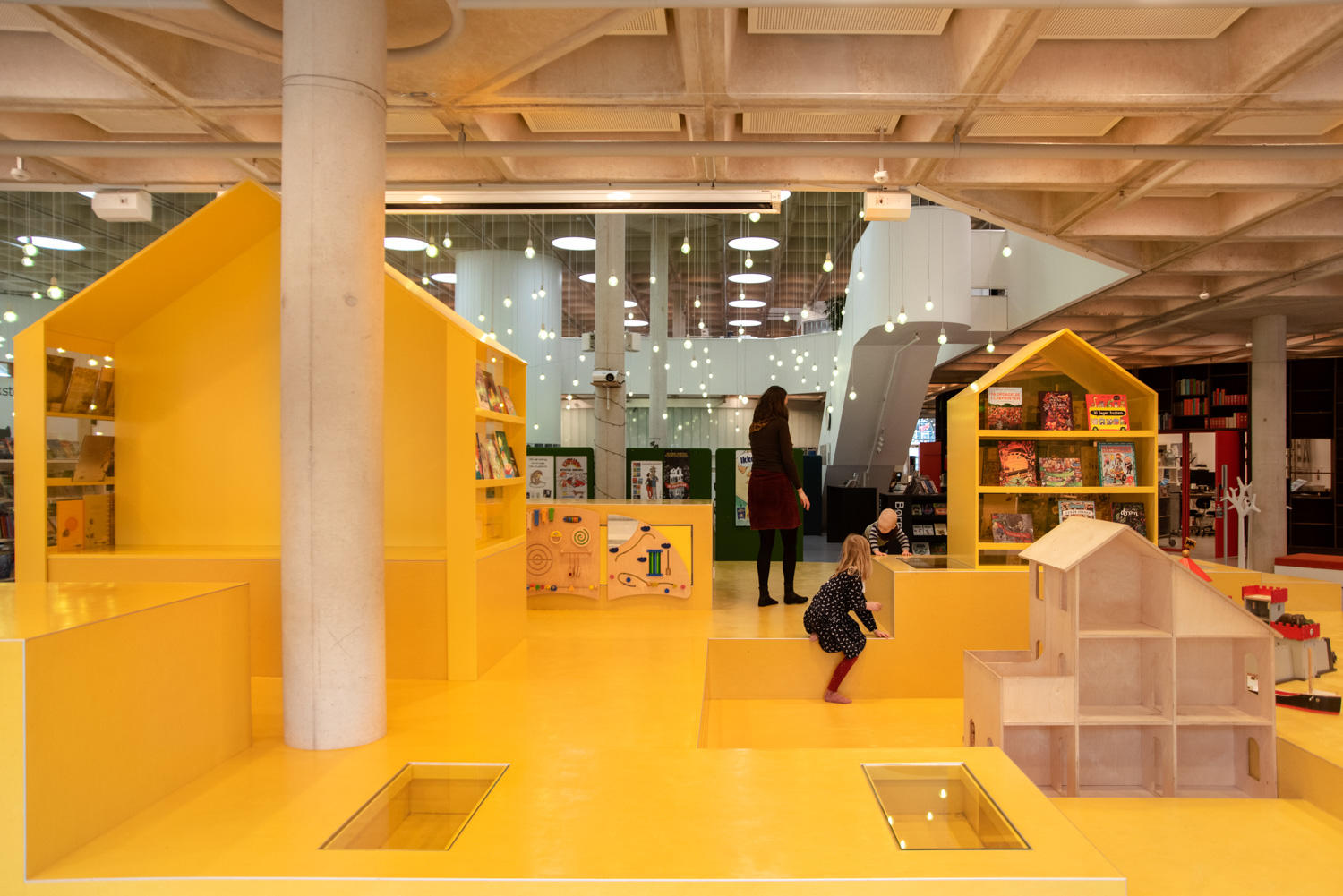 On top of the large yellow “cheese”, two large houses with reading caves and exhibition space have been added.