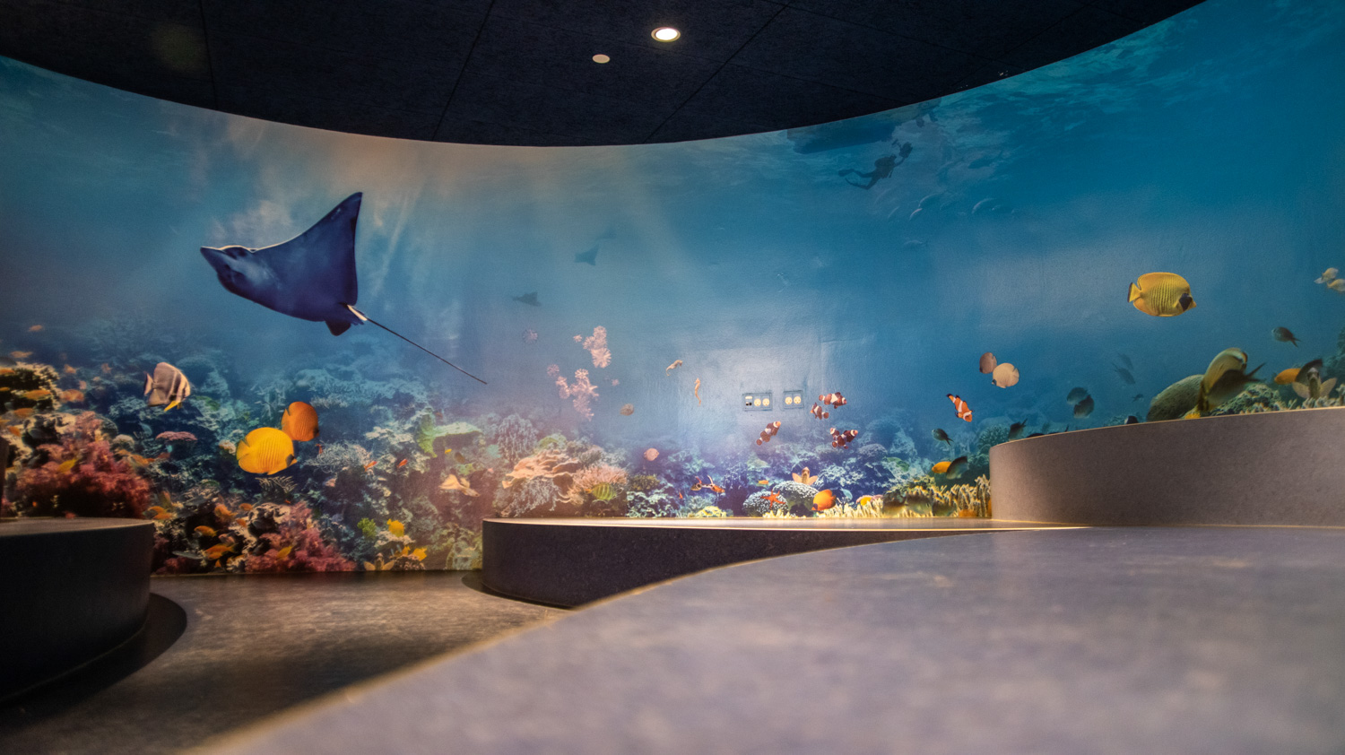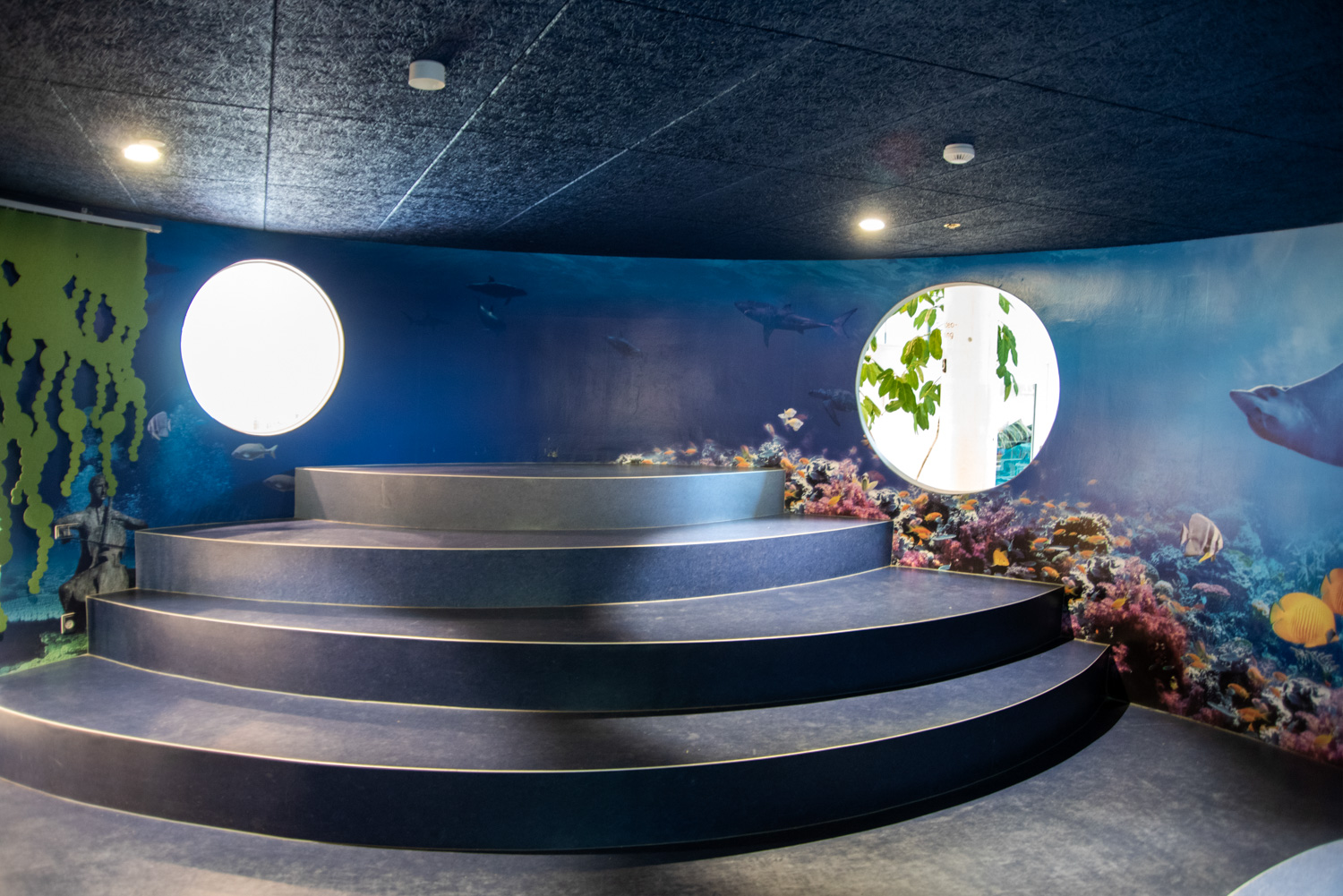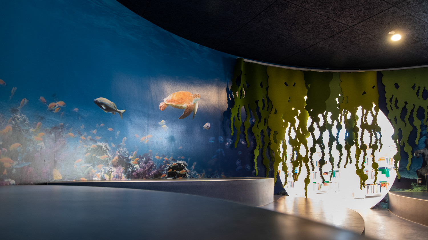 The round fairytale cave in the middle of the library has been transformed into the deep blue ocean, by adding a large wall foil with a specially designed motif and seaweed curtain, giving the impression of being under the sea. At the same time, children can look for seahorses or compete to find the young anemone.