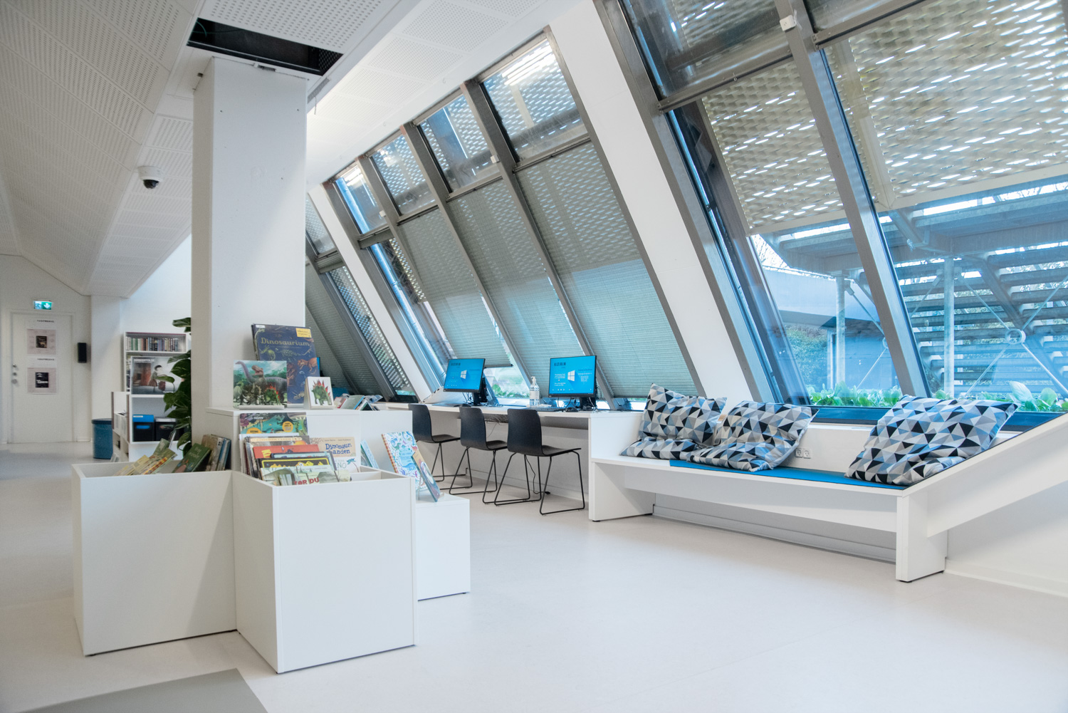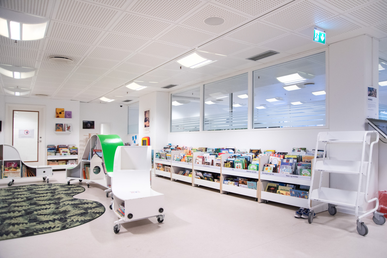 Architects from Lammhults Biblioteksdesign A/S have chosen to combine the existing elements with, among others, a jungle cottage and drawing board. In addition, the sofa, browsers, and shelving systems have been placed differently, while two jungle carpets and poufs complete the jungle theme that can be used by smaller children for playing as well as spending time. For the bigger children, the area by the window has been utilized for a long table-benches piece of furniture that can accommodate PC seats and media browsers. That way, the area is now better suited for reading and hanging out.