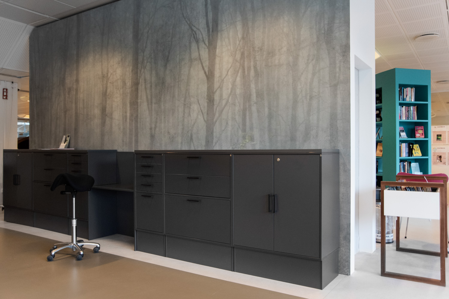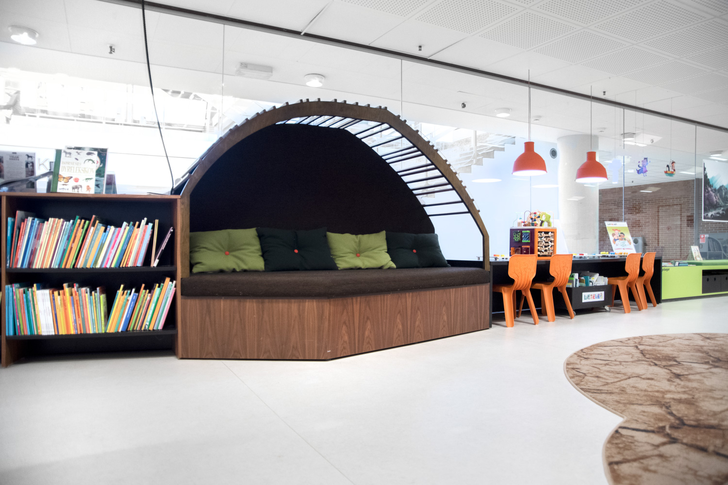 The modernization of the children’s library began in 2018 with a desire to create better solidarity based on existing elements. In the children’s department, there used to be a snake-shaped bookcase and wooden shelves, reminiscent of large tree trunks – thus, the idea of introducing a jungle theme arose.