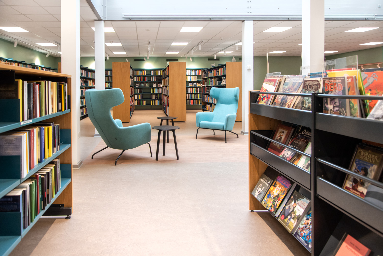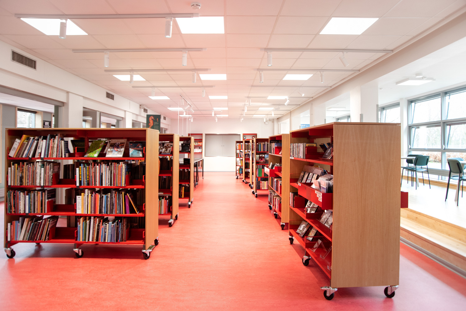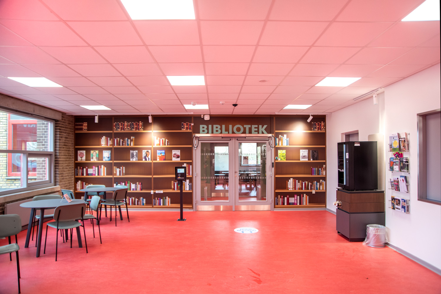 The library is built on the values of recycling and sustainability which is why the building has been renovated and the old shelving systems have been recycled. An architect has been in charge of the renovation while Lammhults Biblioteksdesign has been responsible for picking out wall colours and the overall interior. By modernizing the shelving systems with new panels and placing the blue and read shelving systems strategically on the new red floors, the library appears inviting with its unique colour scheme.