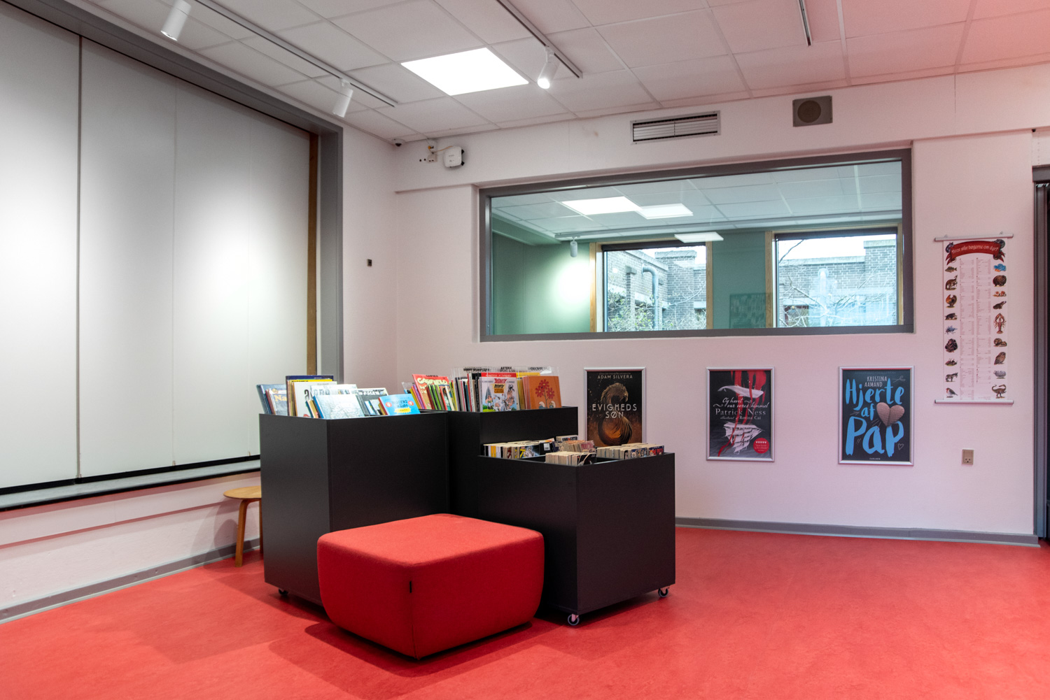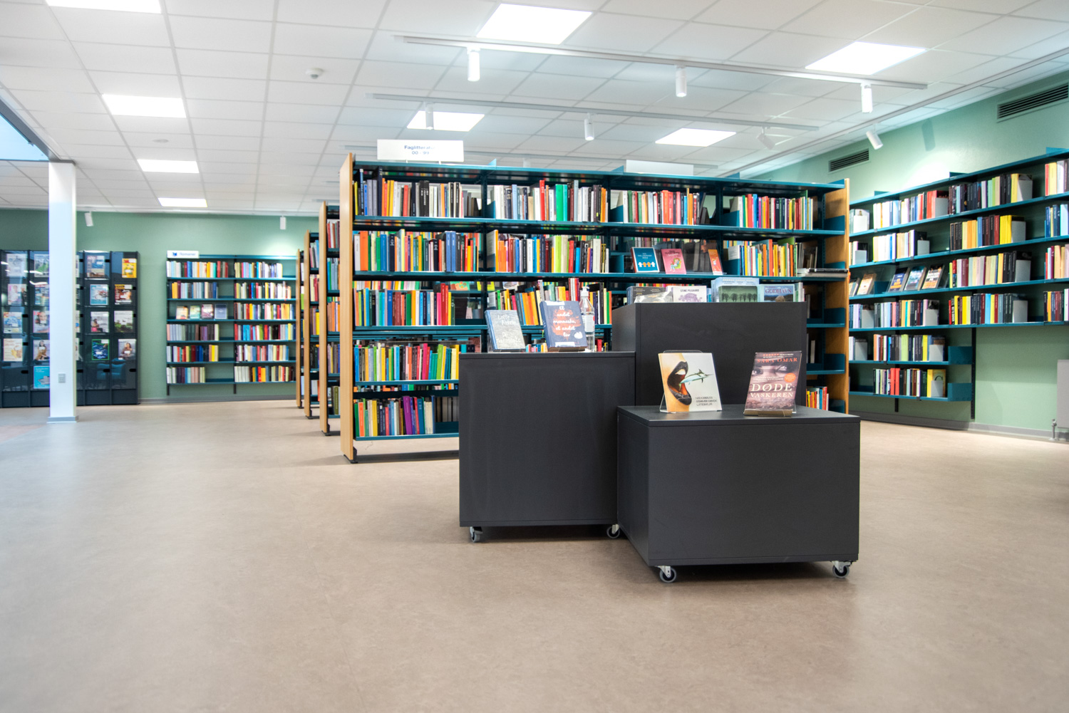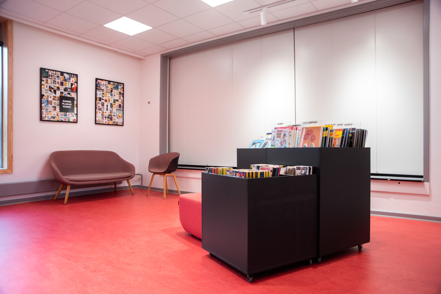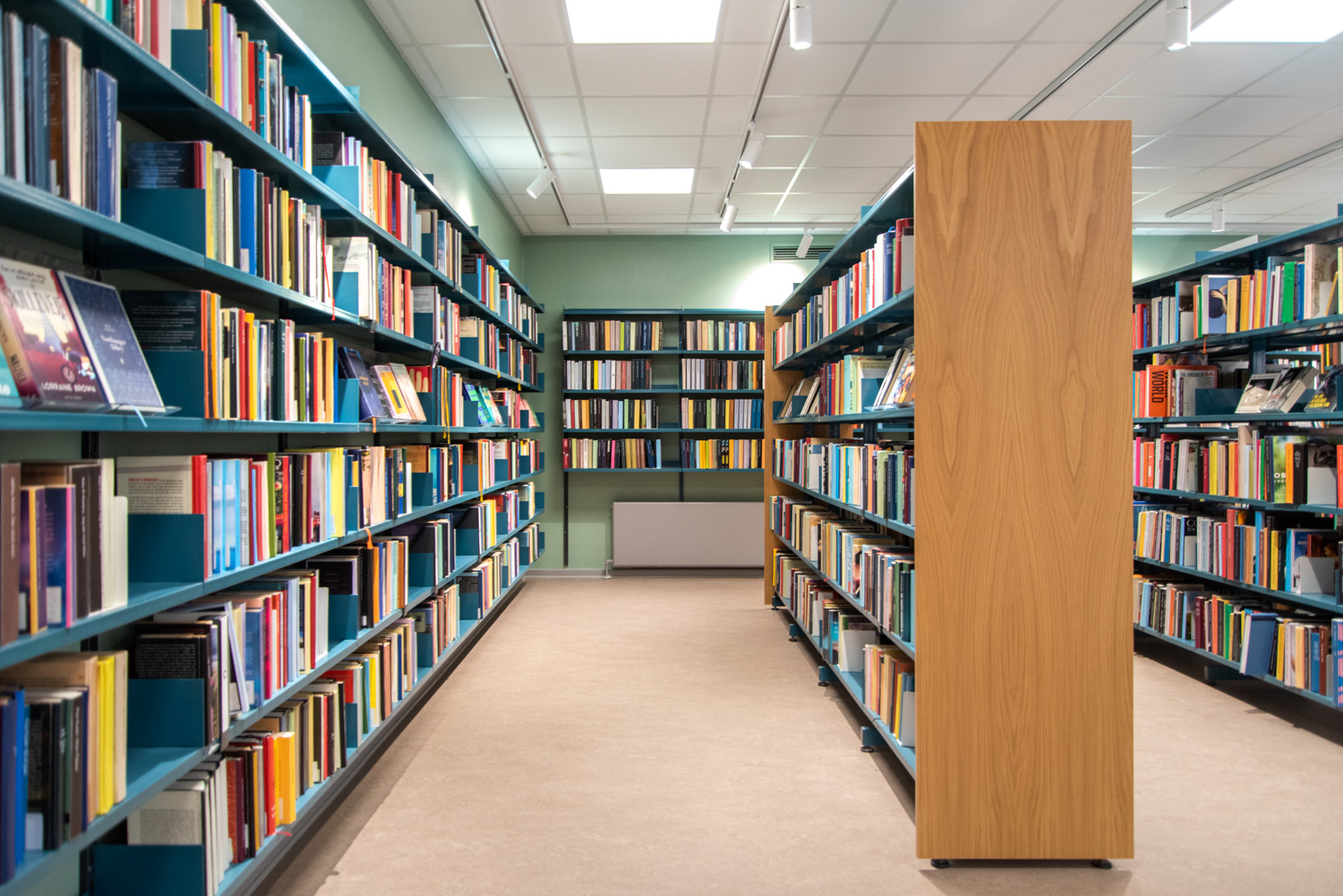 The library is built on the values of recycling and sustainability which is why the building has been renovated and the old shelving systems have been recycled. An architect has been in charge of the renovation while Lammhults Biblioteksdesign has been responsible for picking out wall colours and the overall interior. By modernizing the shelving systems with new panels and placing the blue and read shelving systems strategically on the new red floors, the library appears inviting with its unique colour scheme.