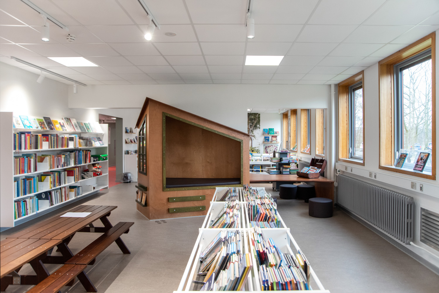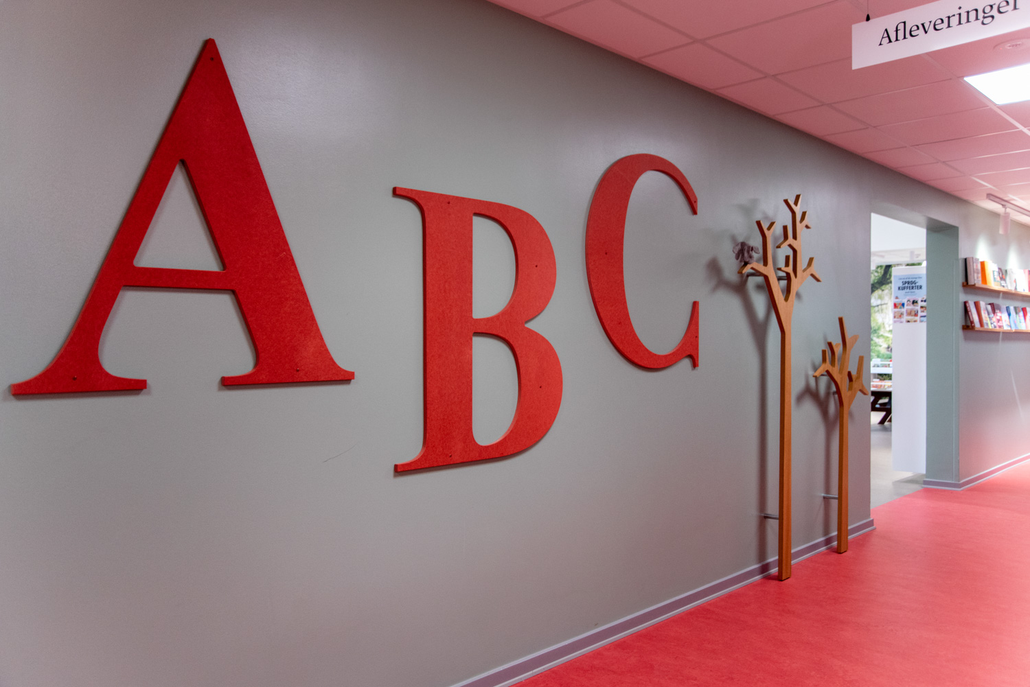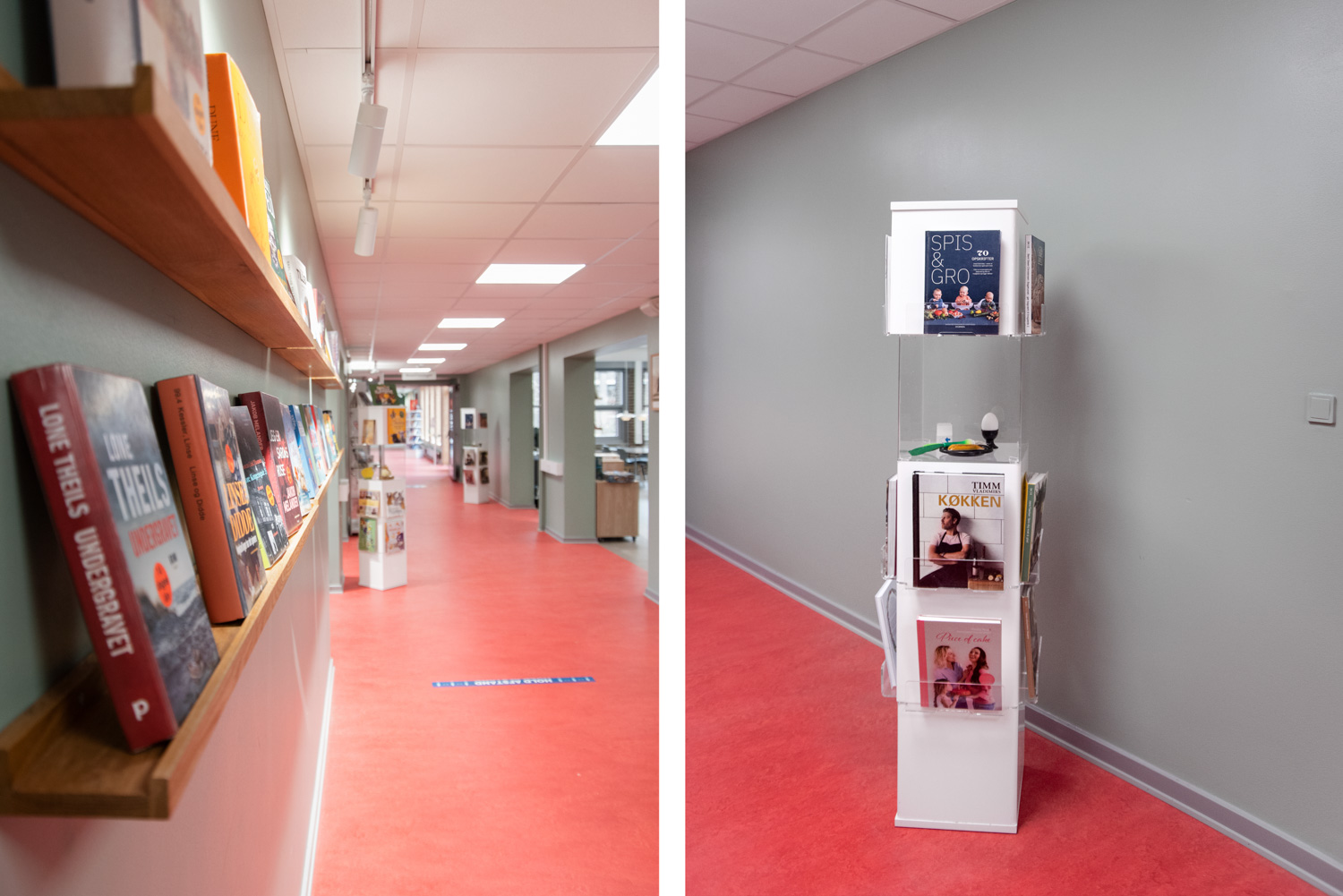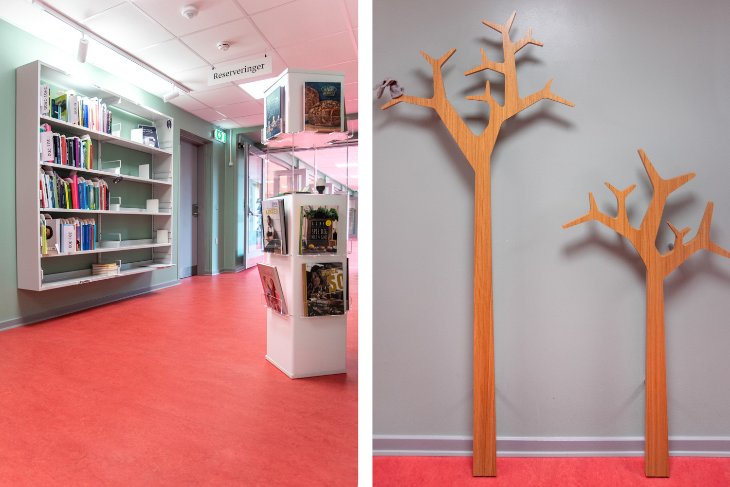 The entrance is transformed into a lively lounge area with wall foil that clearly points you in the direction of the gym or the library. In the children’s department, the wall foil makes it seem like you are stepping into the forest. The small tree trunks provide seating and the cottage a small space, where the children can sit undisturbed and immerse themselves in the world of books.