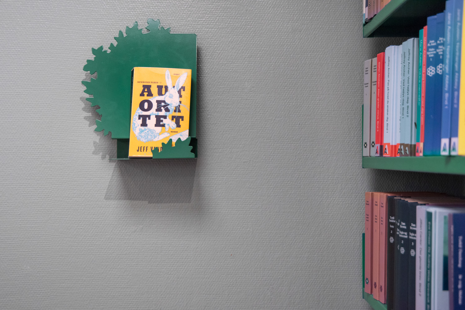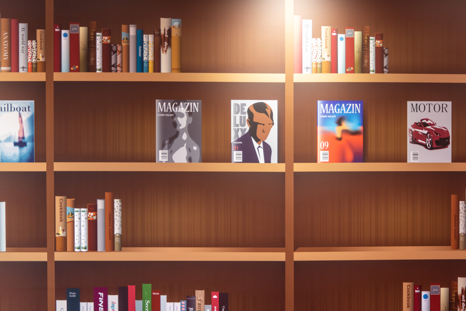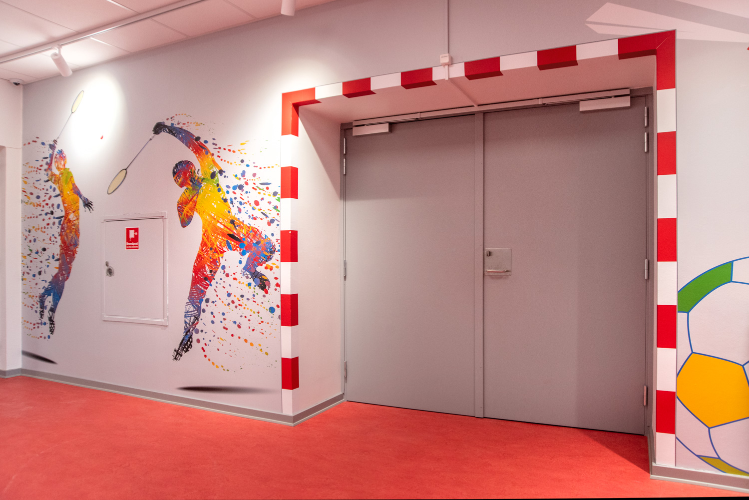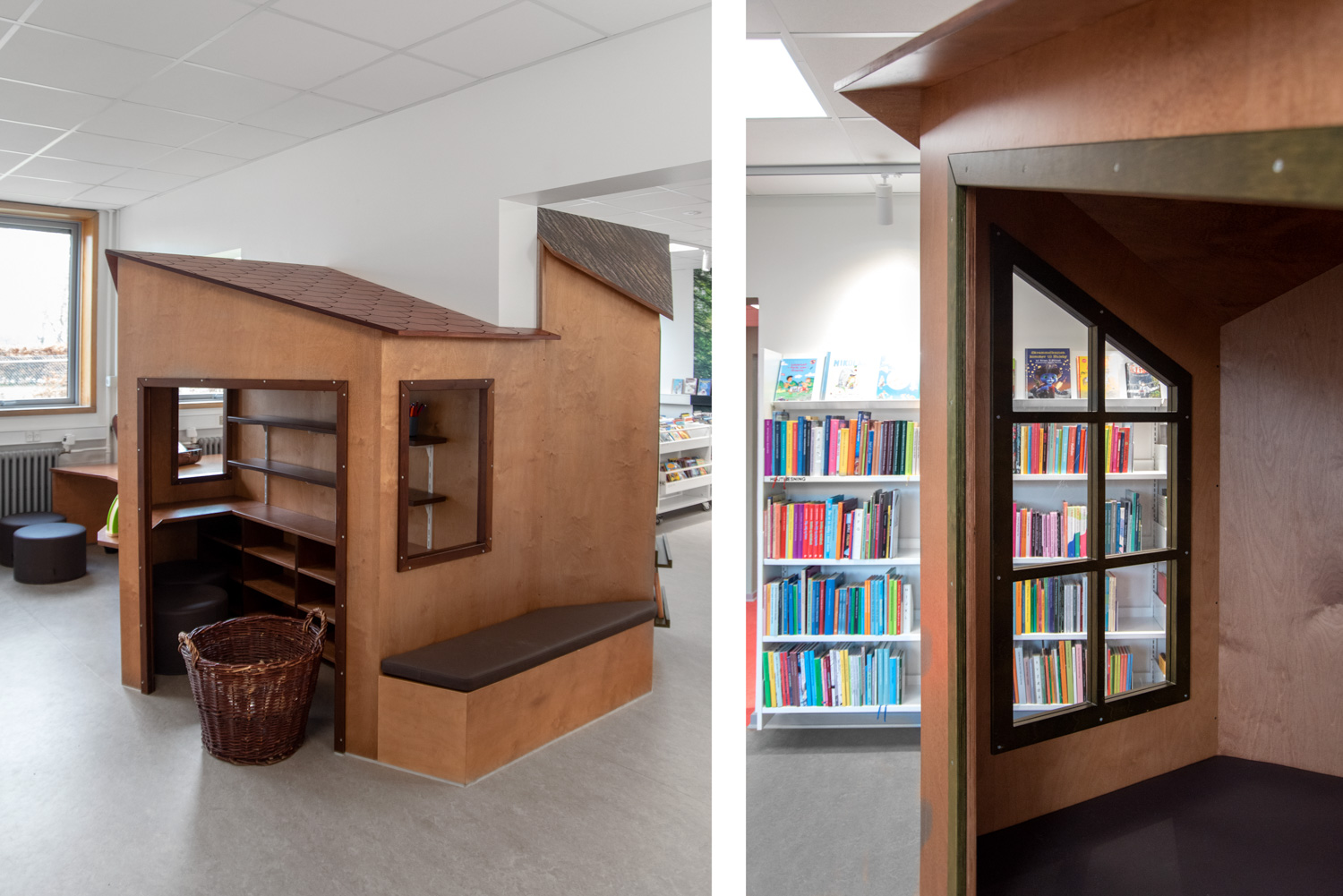 The entrance is transformed into a lively lounge area with wall foil that clearly points you in the direction of the gym or the library. In the children’s department, the wall foil makes it seem like you are stepping into the forest. The small tree trunks provide seating and the cottage a small space, where the children can sit undisturbed and immerse themselves in the world of books.