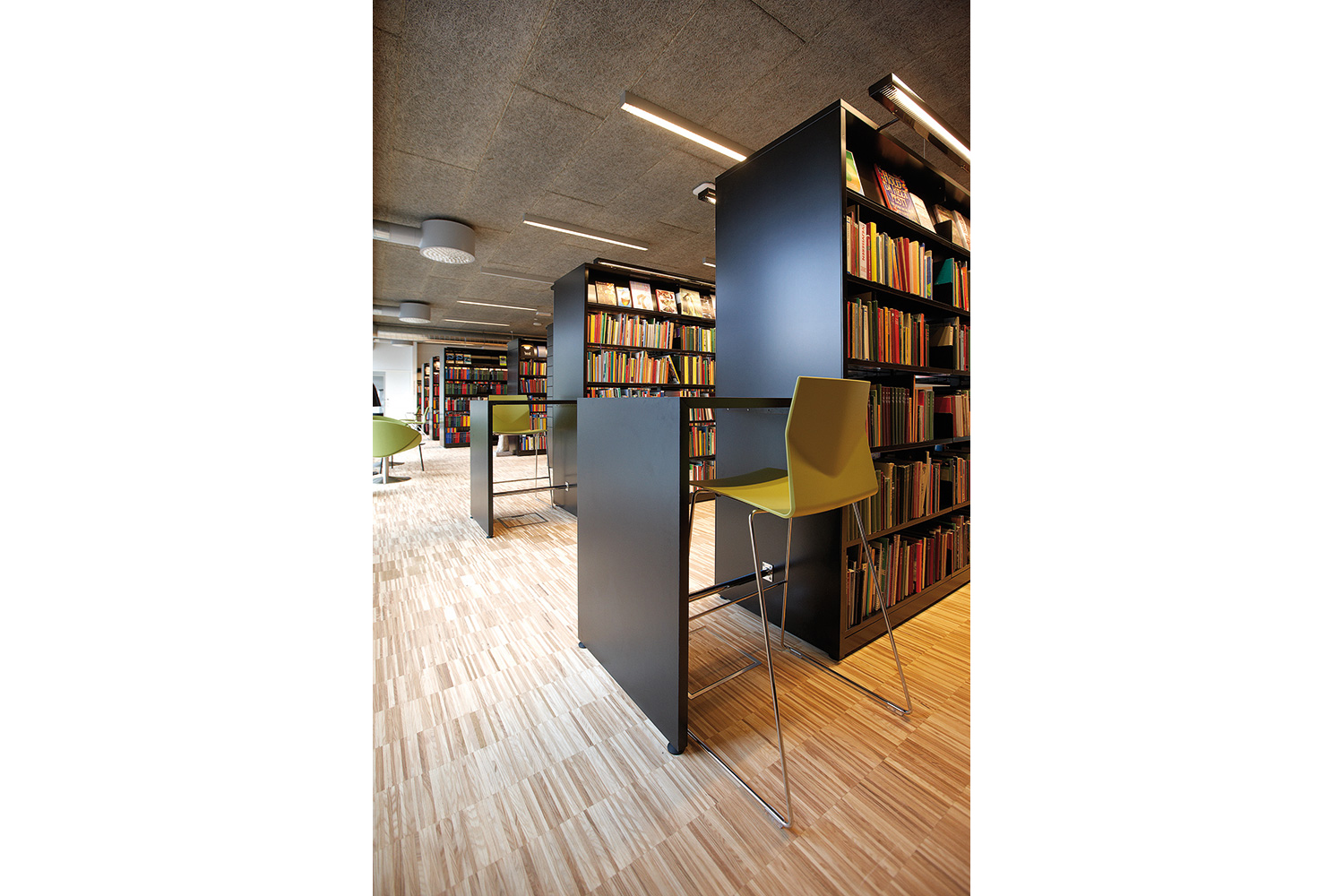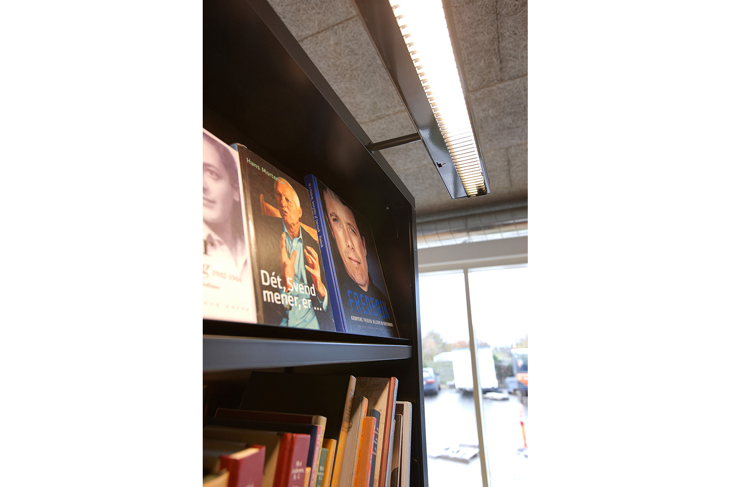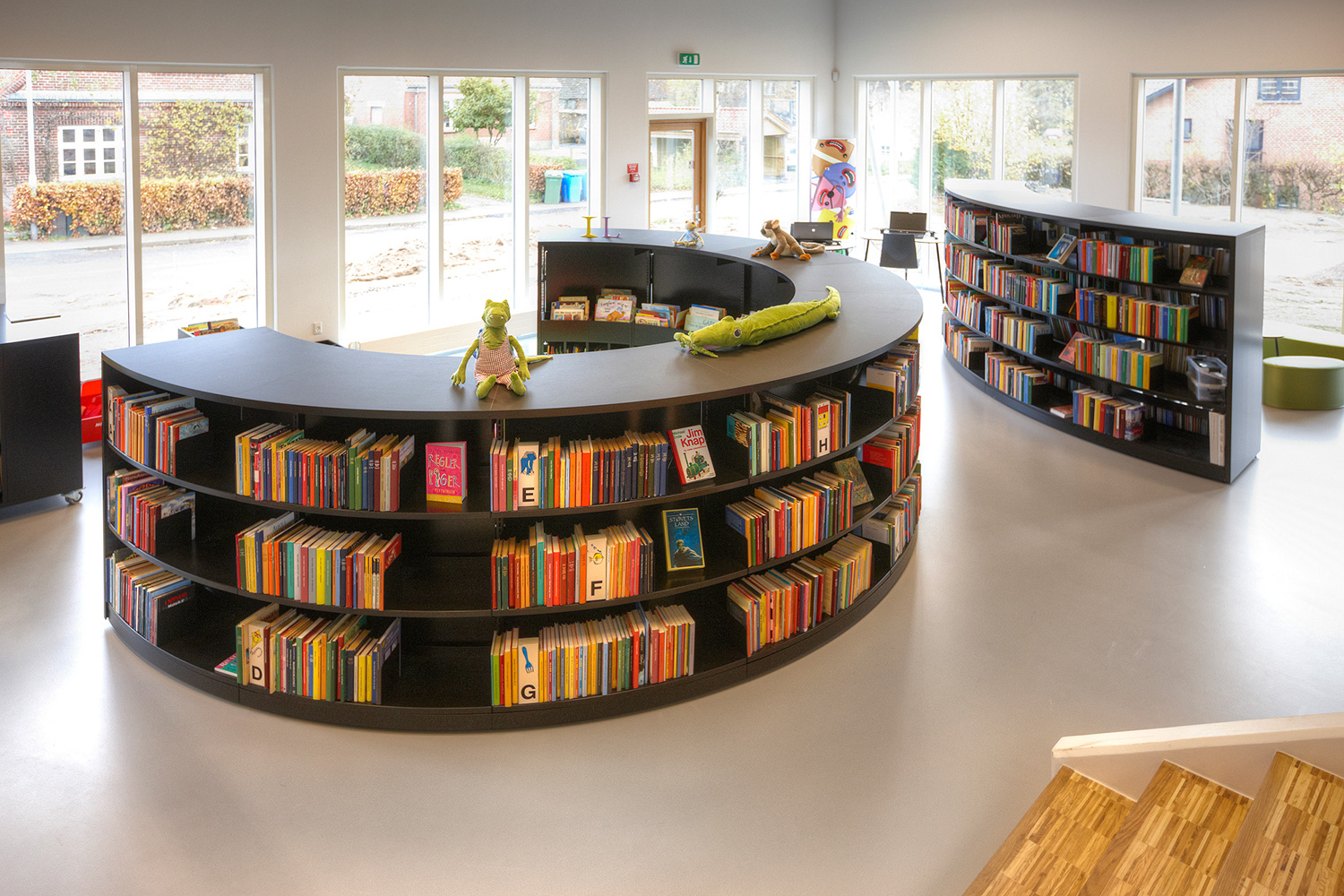 The library is furnished with the Classic Steel Shelving System, London end panel and canopy, and built-in Book Big Lighting. There are also special-made solutions like the integrated tables at the ends of the shelving and the round picture book browsers in the children’s area.