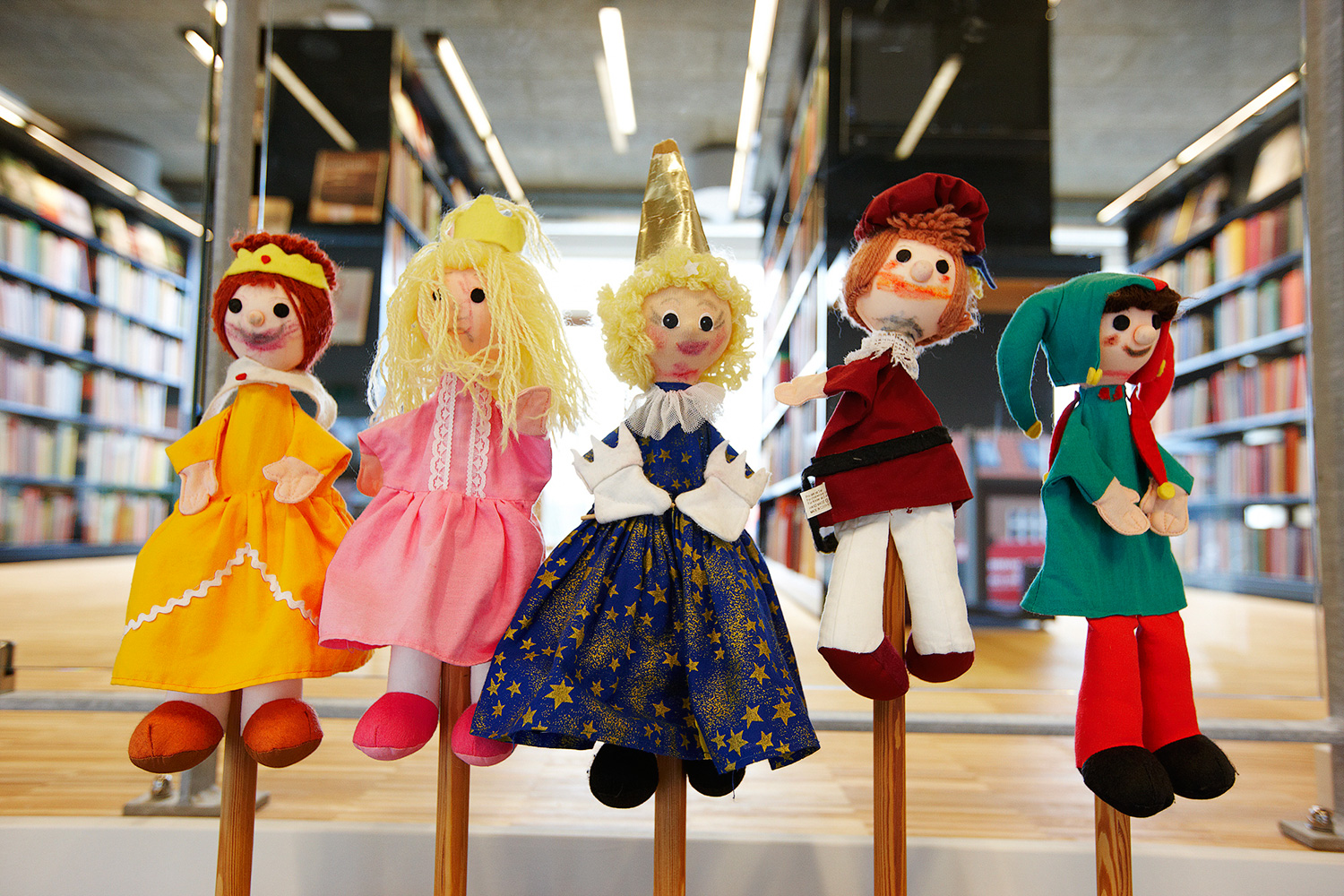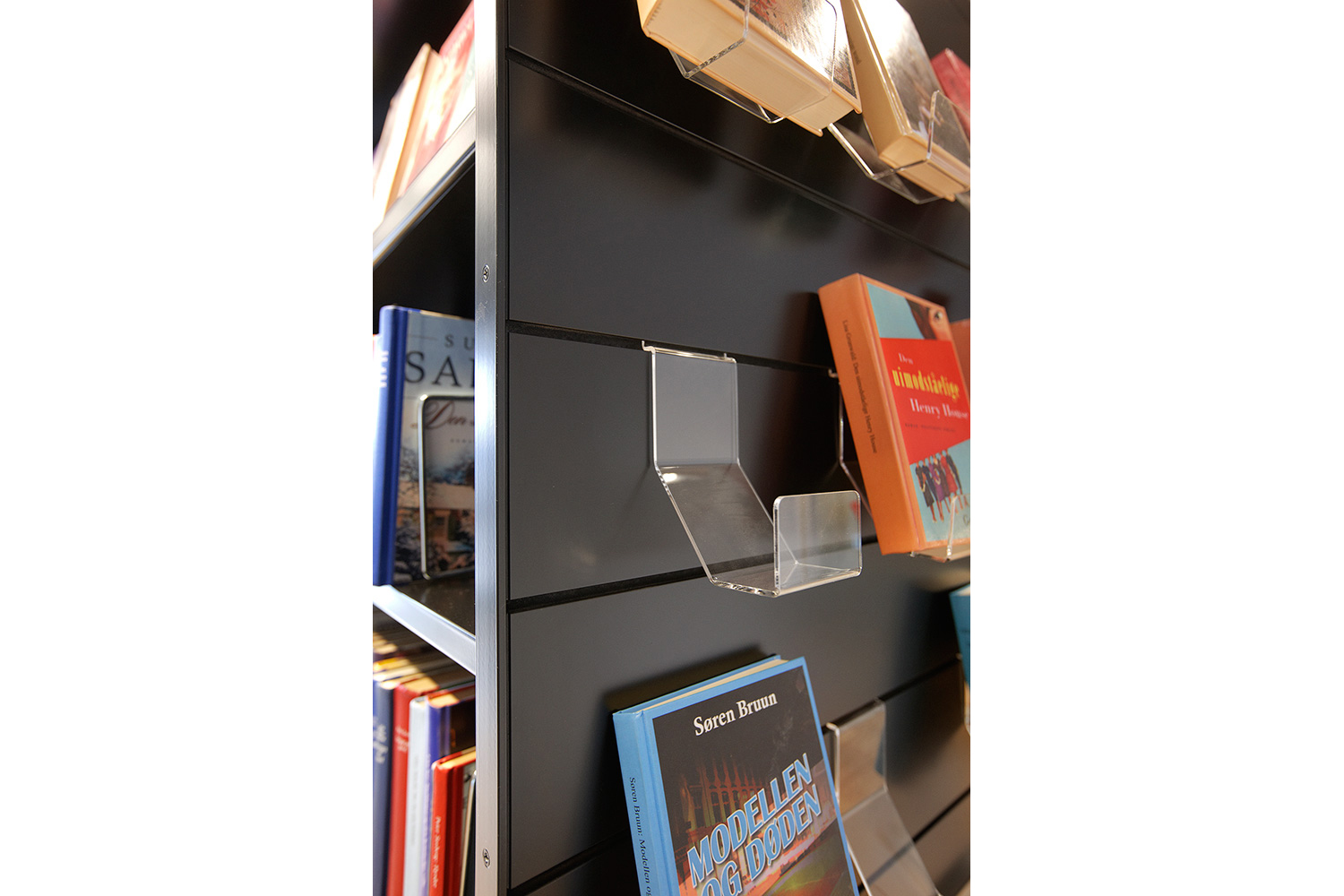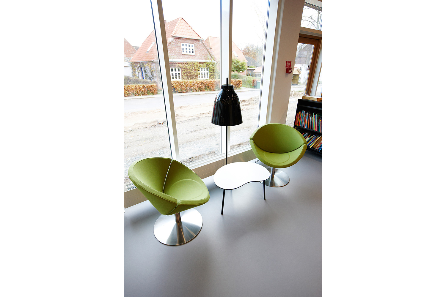 The library is furnished with the Classic Steel Shelving System, London end panel and canopy, and built-in Book Big Lighting. There are also special-made solutions like the integrated tables at the ends of the shelving and the round picture book browsers in the children’s area.
