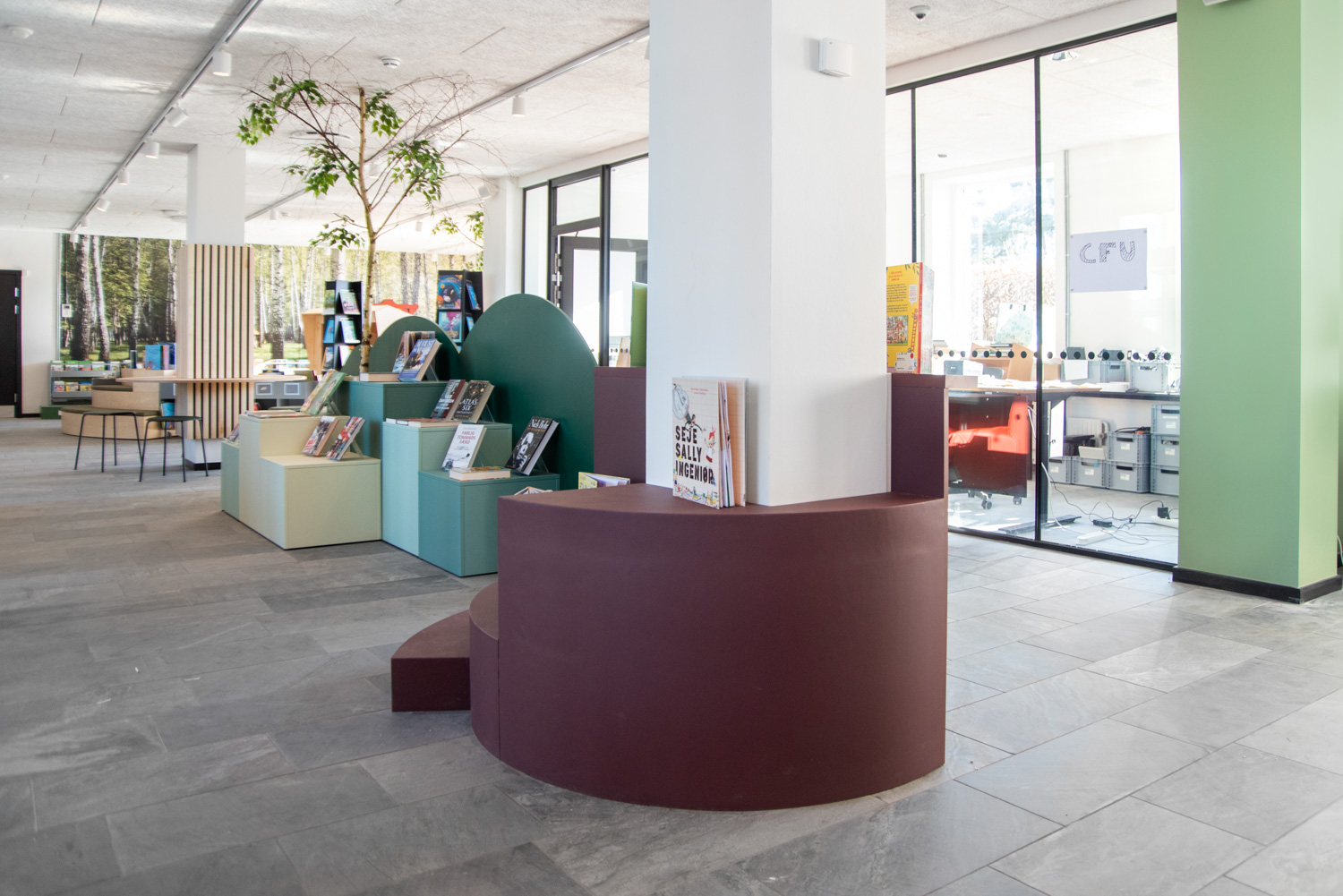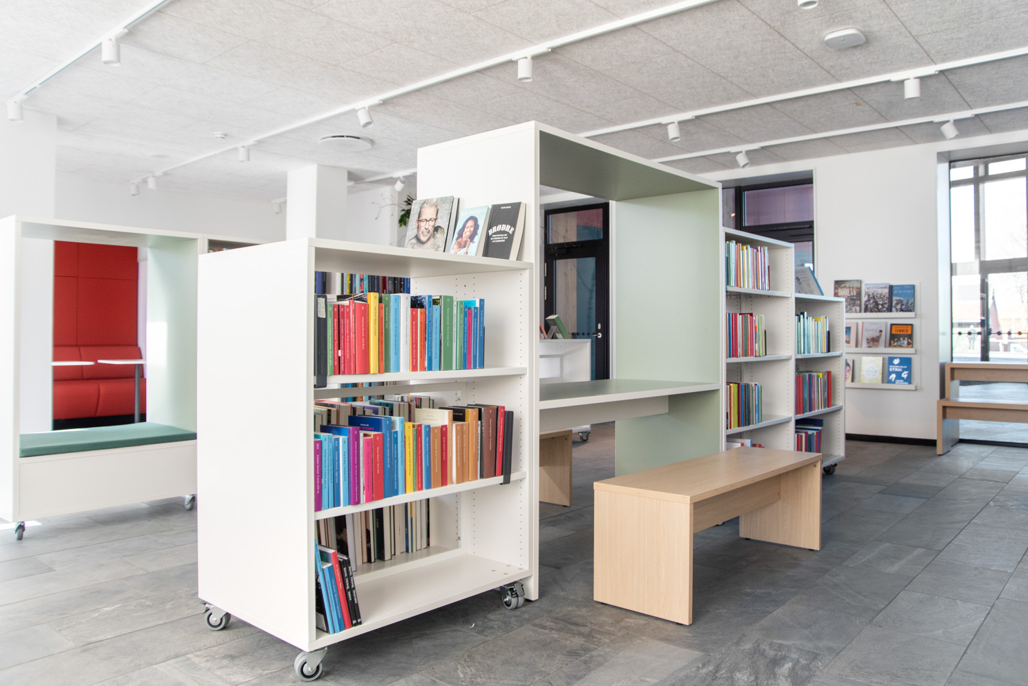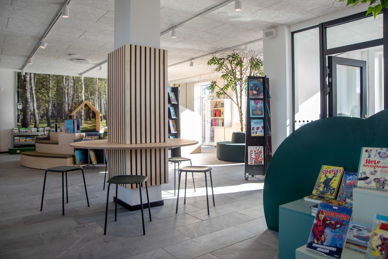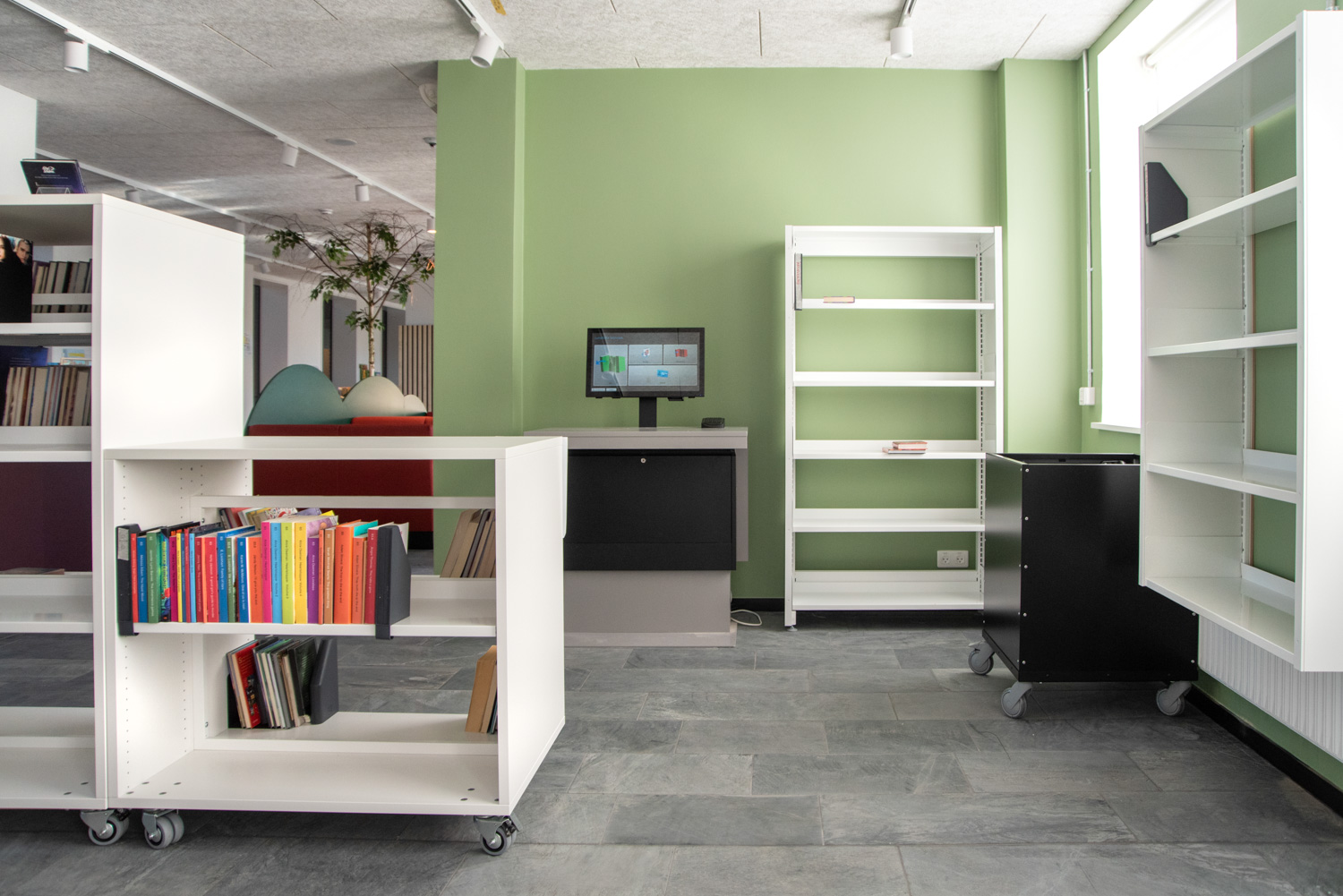 The dusty, orange colours on some of the library furniture provide a nice contrast to the nature colours, that are more neutral, and Maria Podium browsers make it possible to create exhibition areas and highlight certain materials.