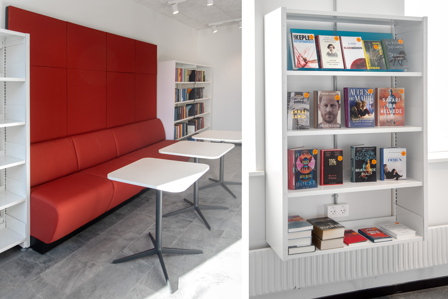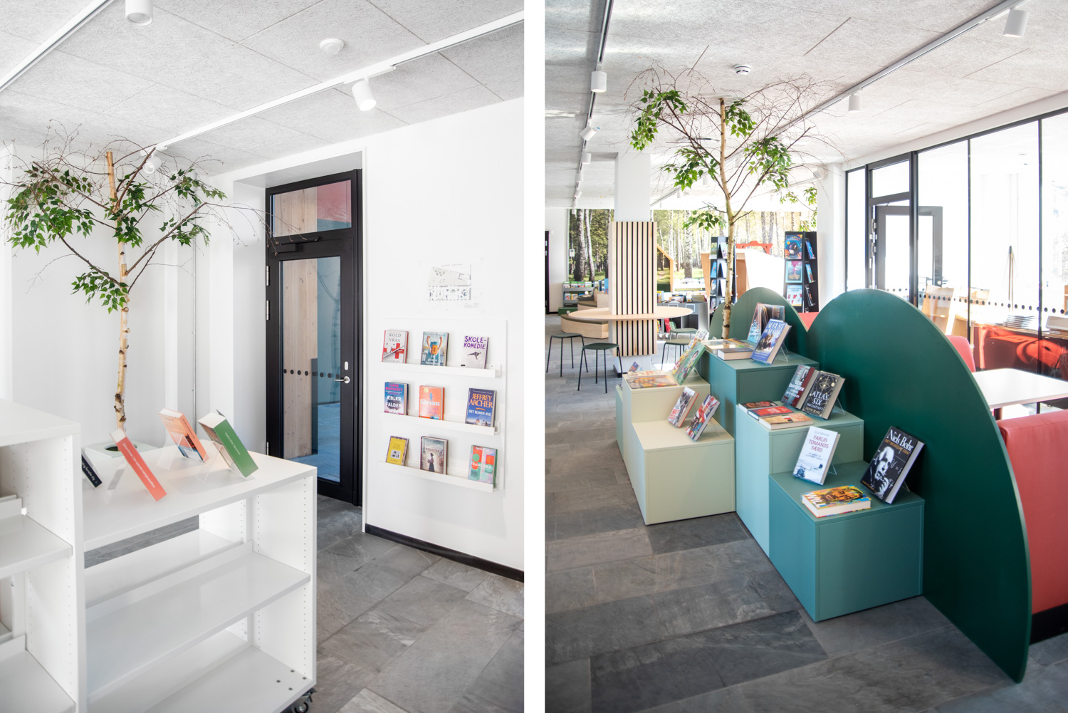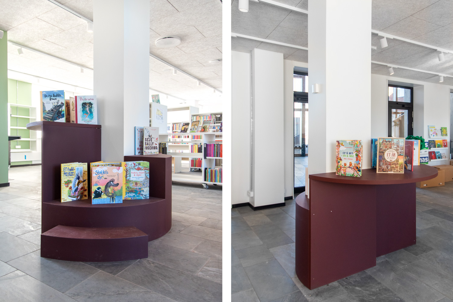 The dusty, orange colours on some of the library furniture provide a nice contrast to the nature colours, that are more neutral, and Maria Podium browsers make it possible to create exhibition areas and highlight certain materials.