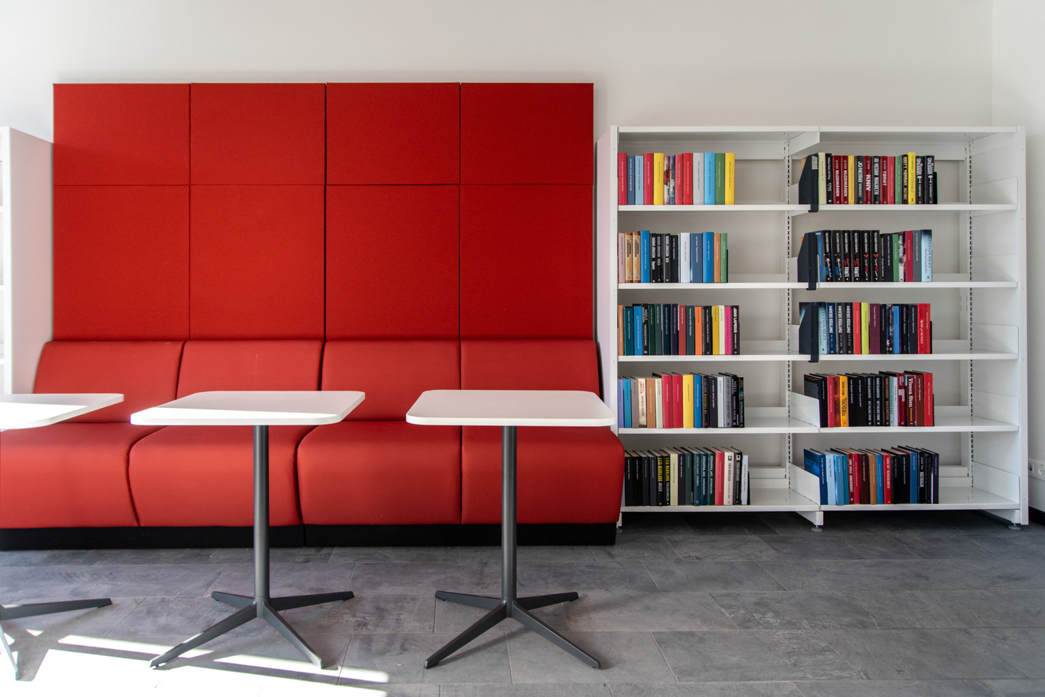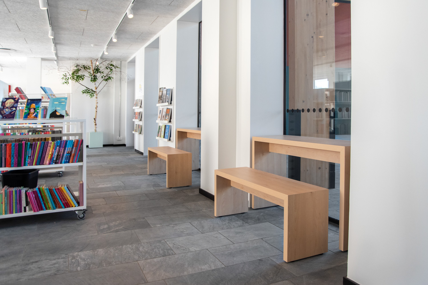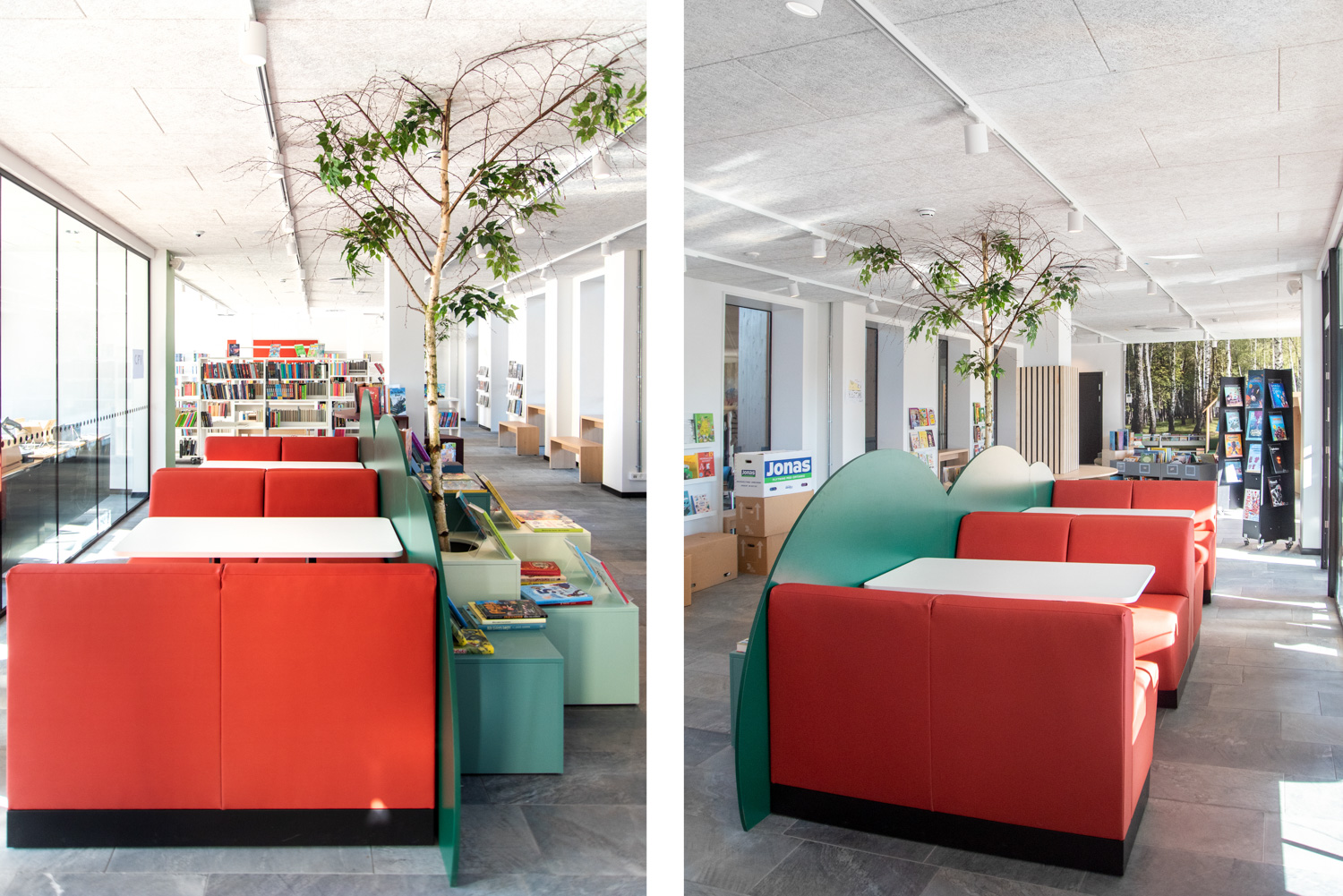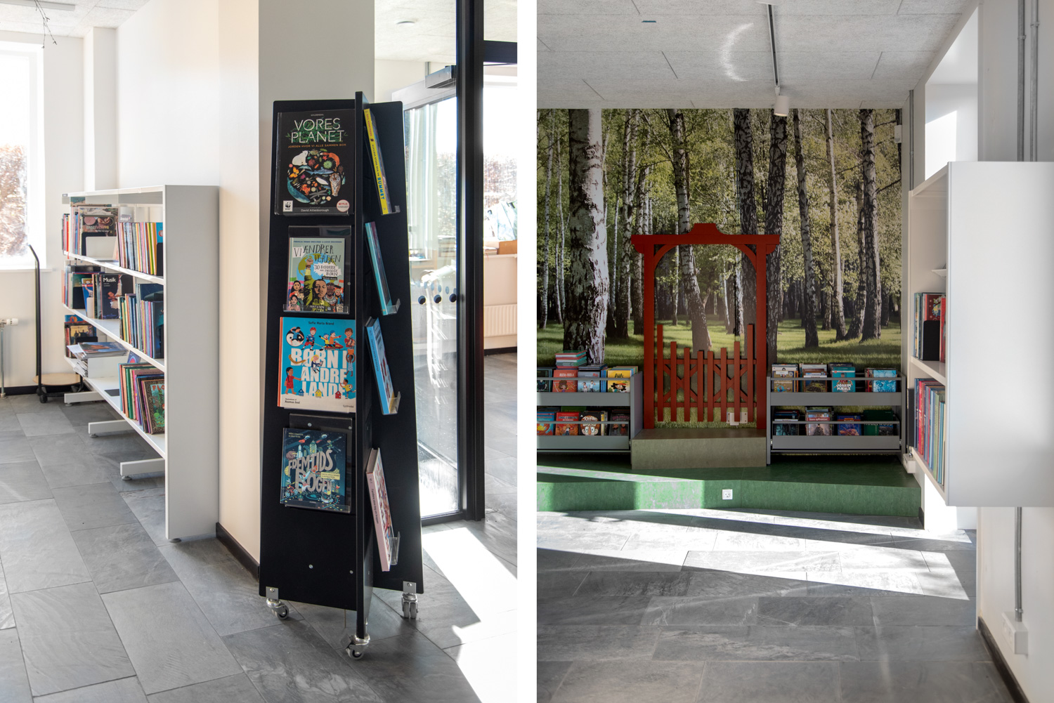 The dusty, orange colours on some of the library furniture provide a nice contrast to the nature colours, that are more neutral, and Maria Podium browsers make it possible to create exhibition areas and highlight certain materials.