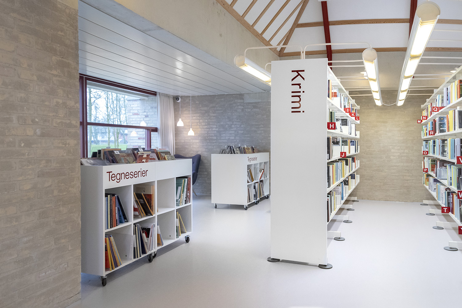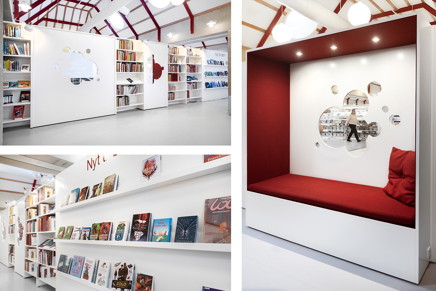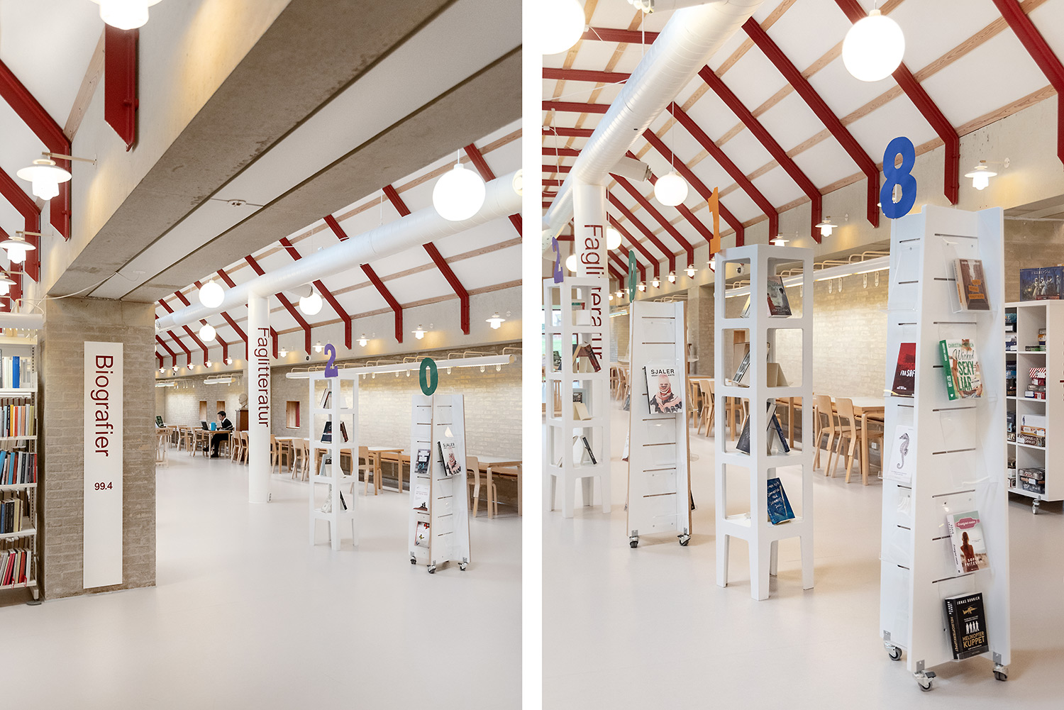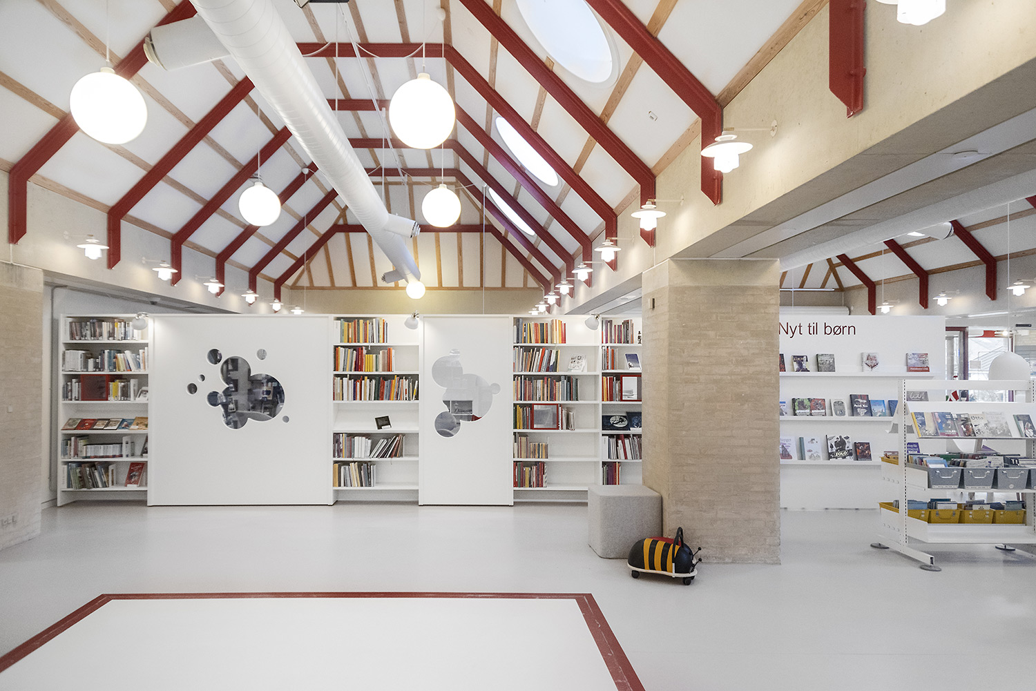 Ringsted Library has been continuously redesigned and now appears as an inspiring library, where the combination of colors, materials and furniture form a synthesis. Most recently, the children's department has been revitalized, where an entire city has emerged with petrol station, shop, reading forest and pancake house, which set the framework for the children's free play.