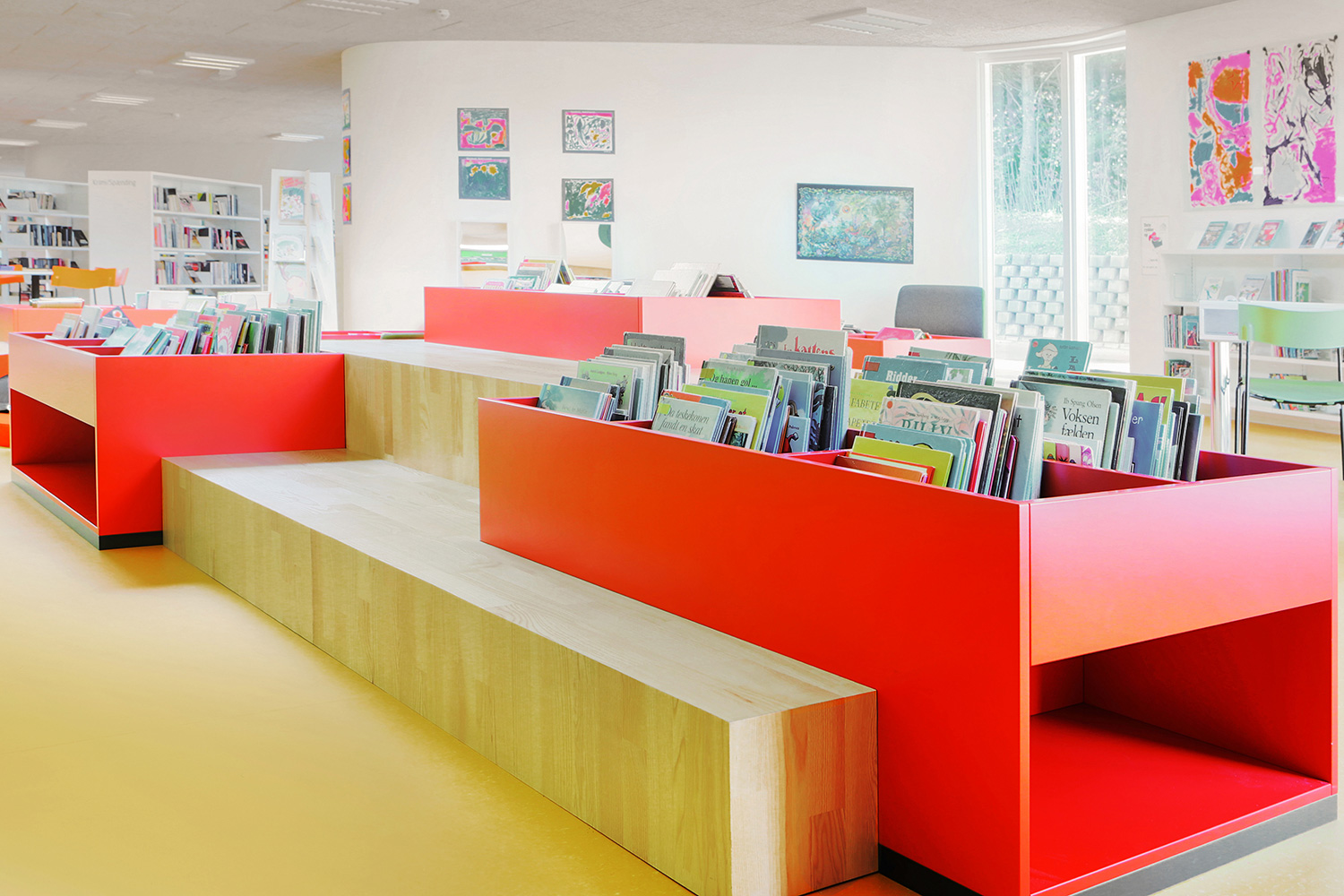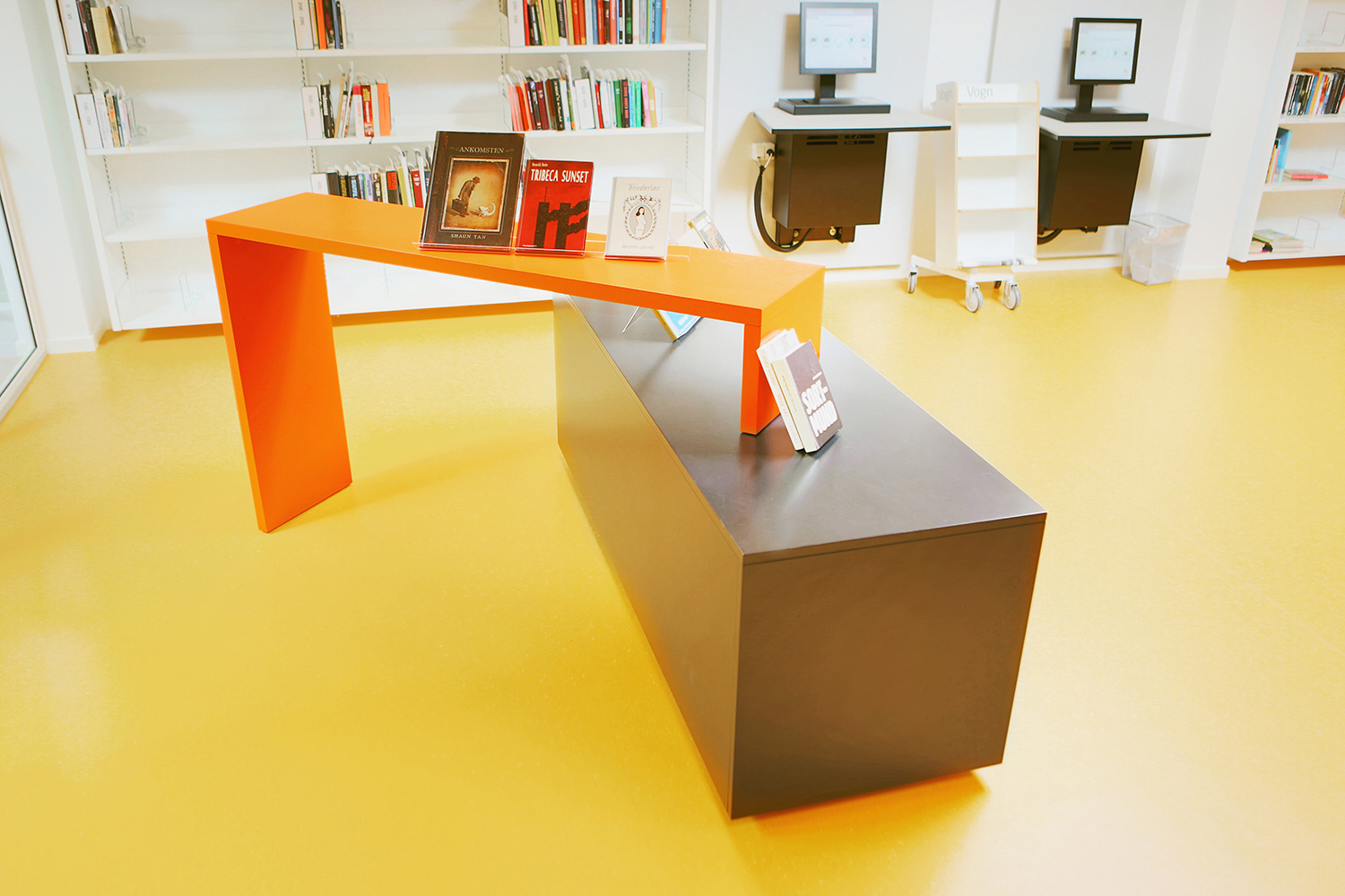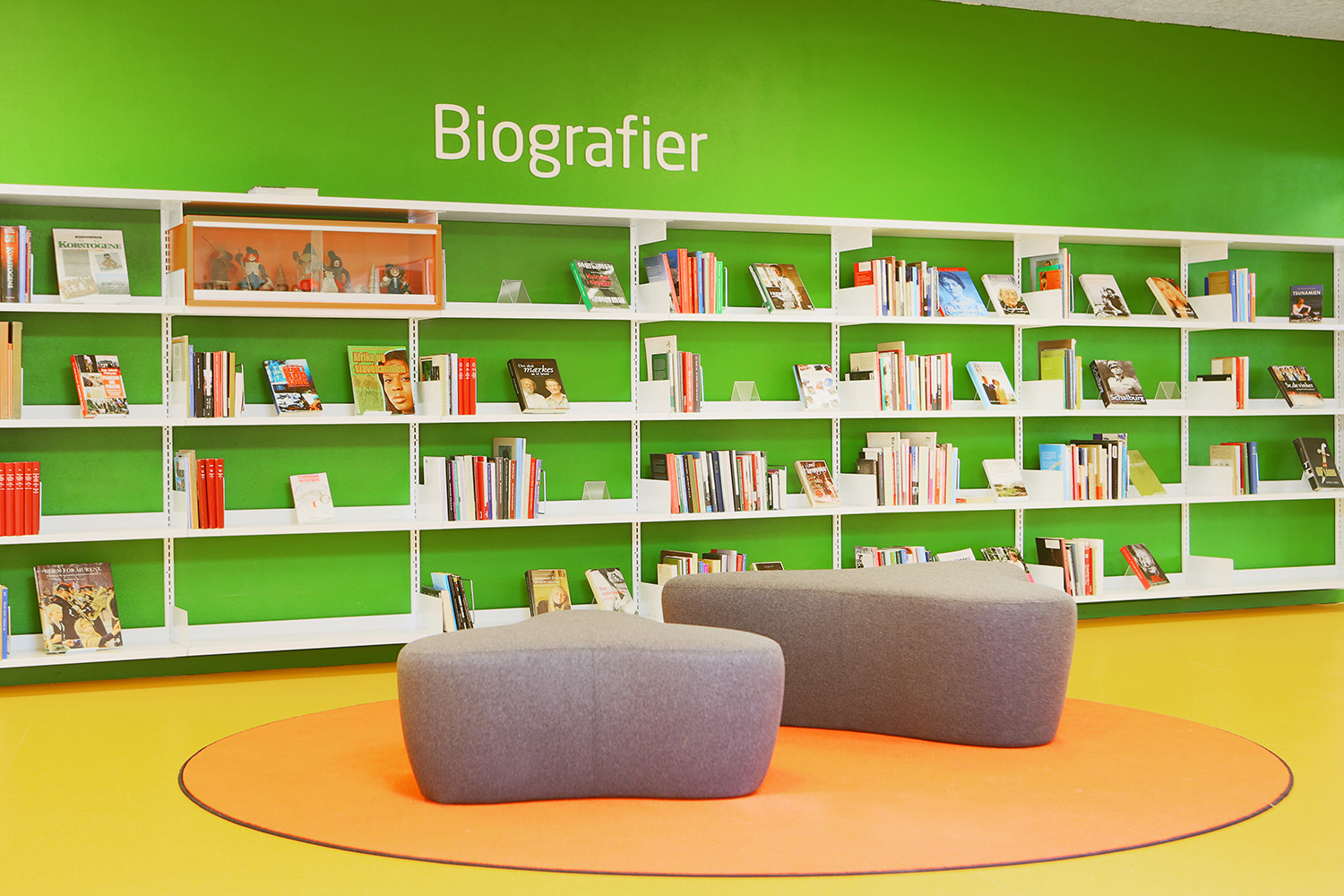 A large special designed play-sit furniture with incorporated cribs for display of children’s books can be found in the children’s zone. Wall mounted shelves in staggered heights give dynamic to the room. Mobile orange display modules are placed in the shelves to generate attention to selected topics or to create smaller special exhibitions.