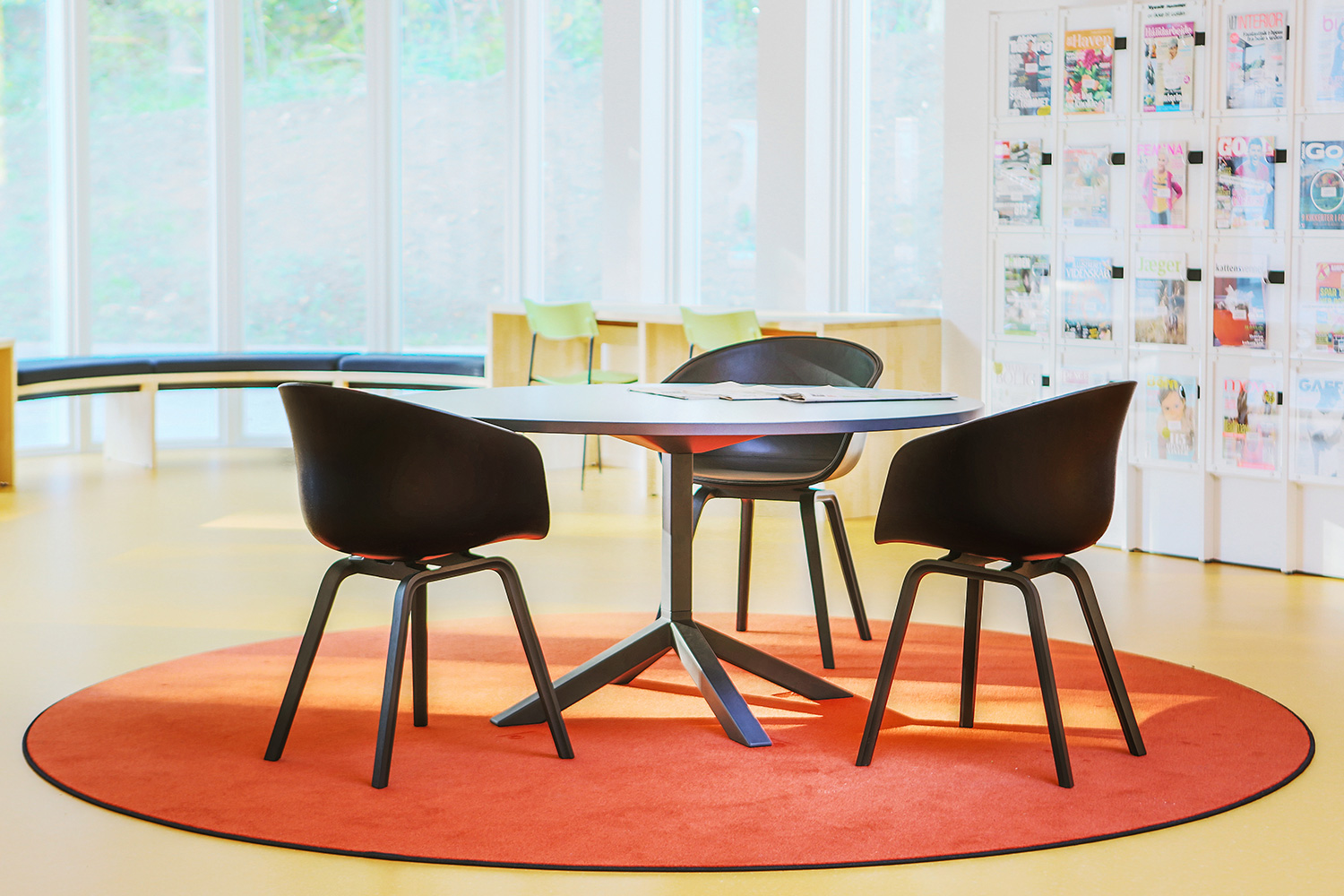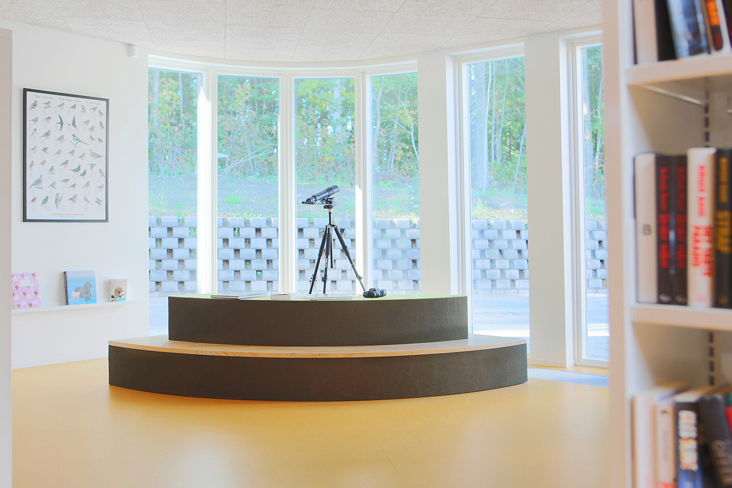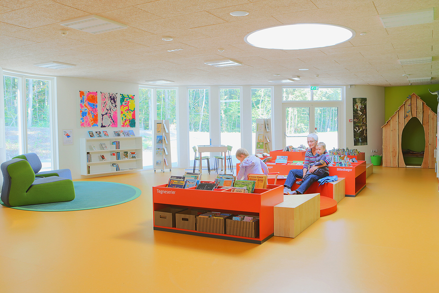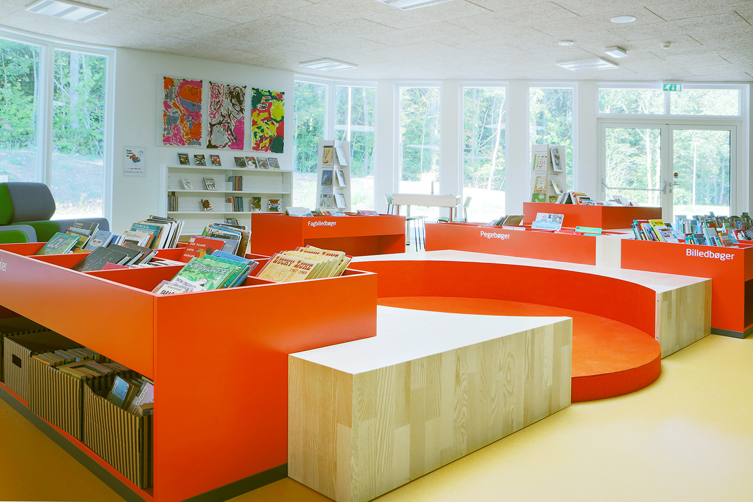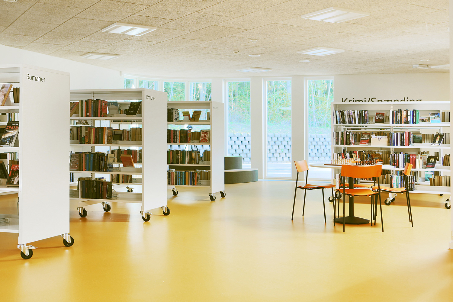 The interior designer, Lykke Jørgin, has used the nature as focal point of the interior decoration of the library. For example, specially designed furniture in ash are placed along the window sections with full utilization of the daylight. A custom-made viewing platform covered with felt gives the possibility of looking at the nature at close range. The green colours of the nature has been dragged into the library and interact good together with the additional yellow and orange colours.