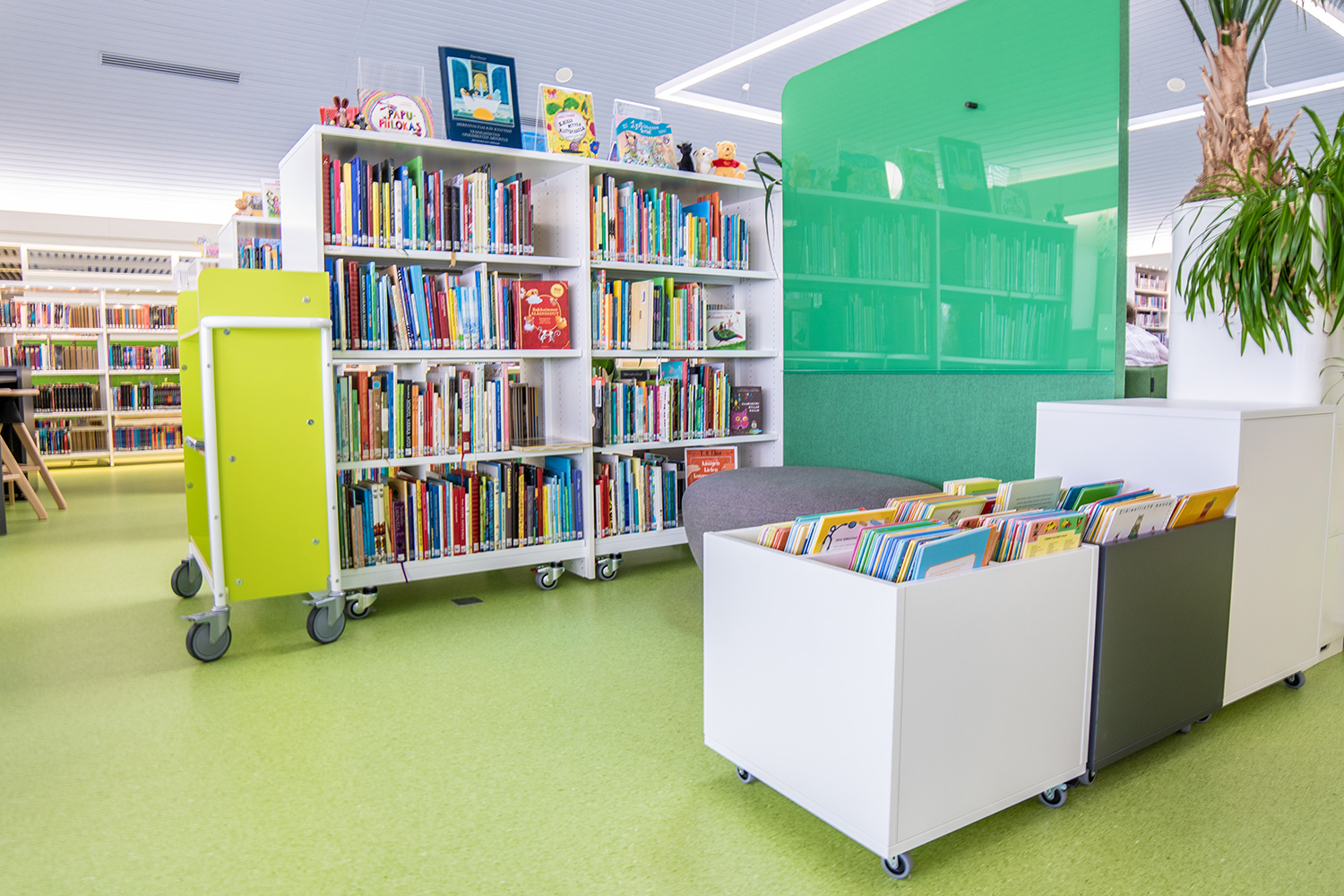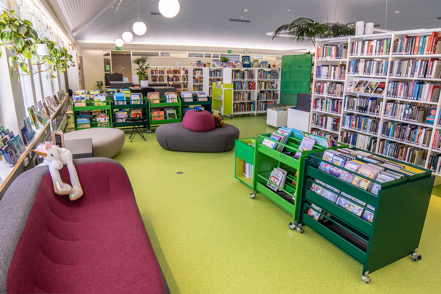 The re-design creates a calm, light and modern environment with different shades of green and plants adding a cosy, homelike feeling. Book fronts are displayed on different types of library furniture to get attention and tempt library users. The new library is drawing people into the library, and feedback has been positive from adults and children alike.
