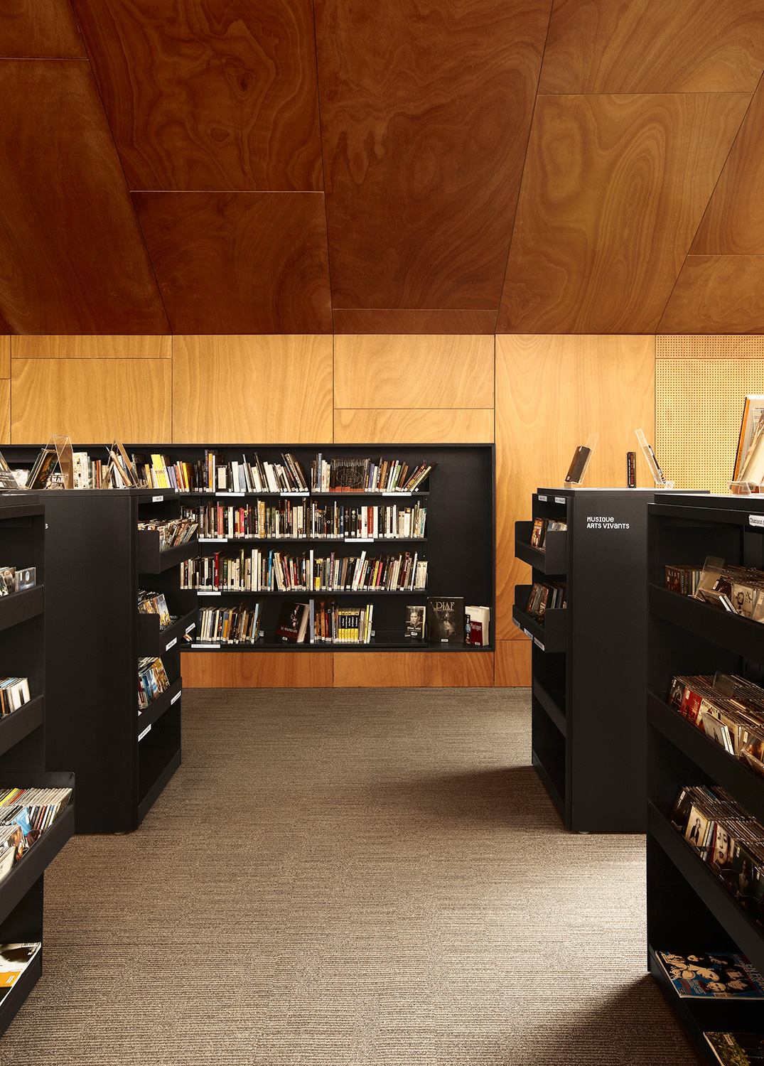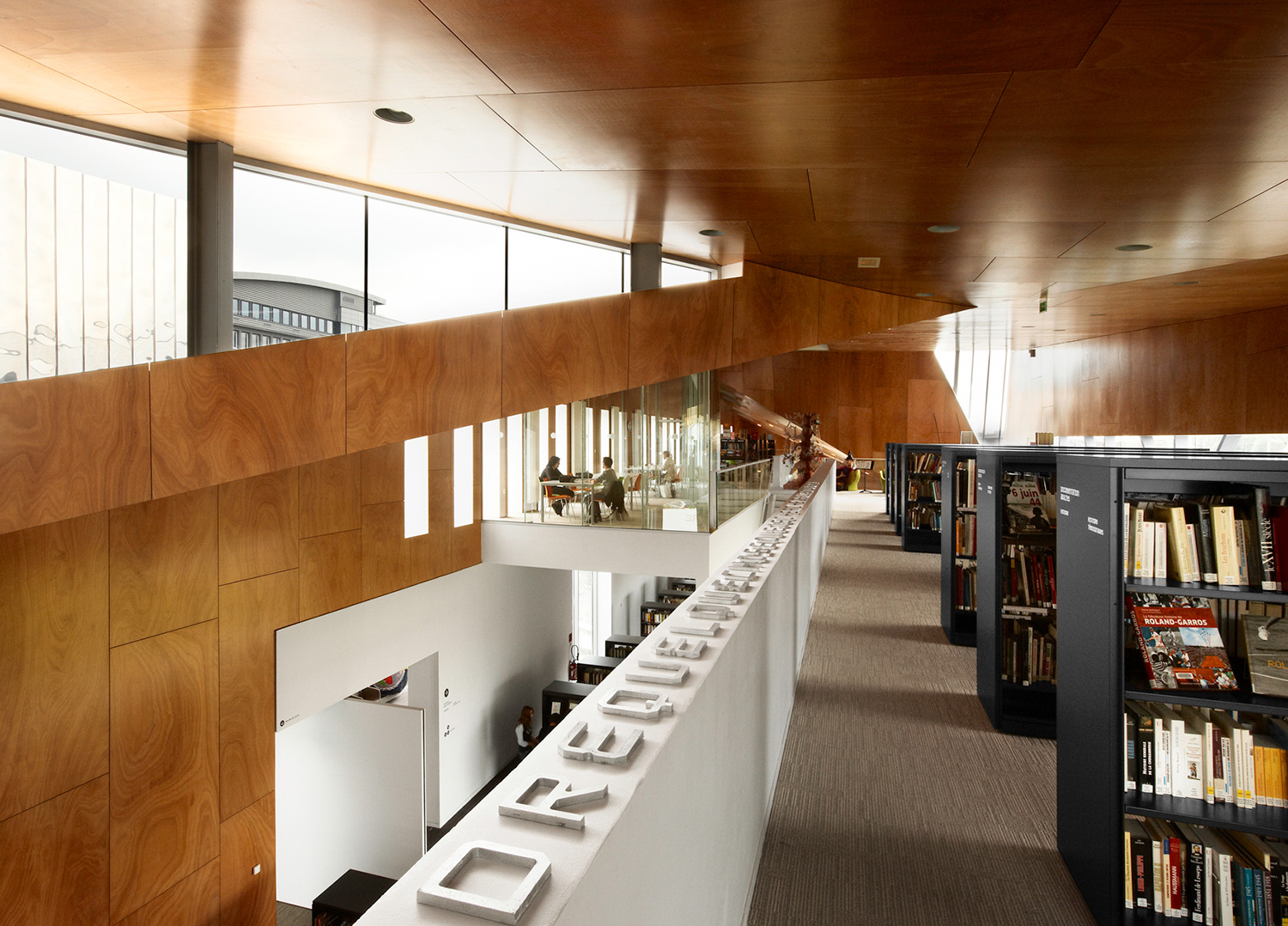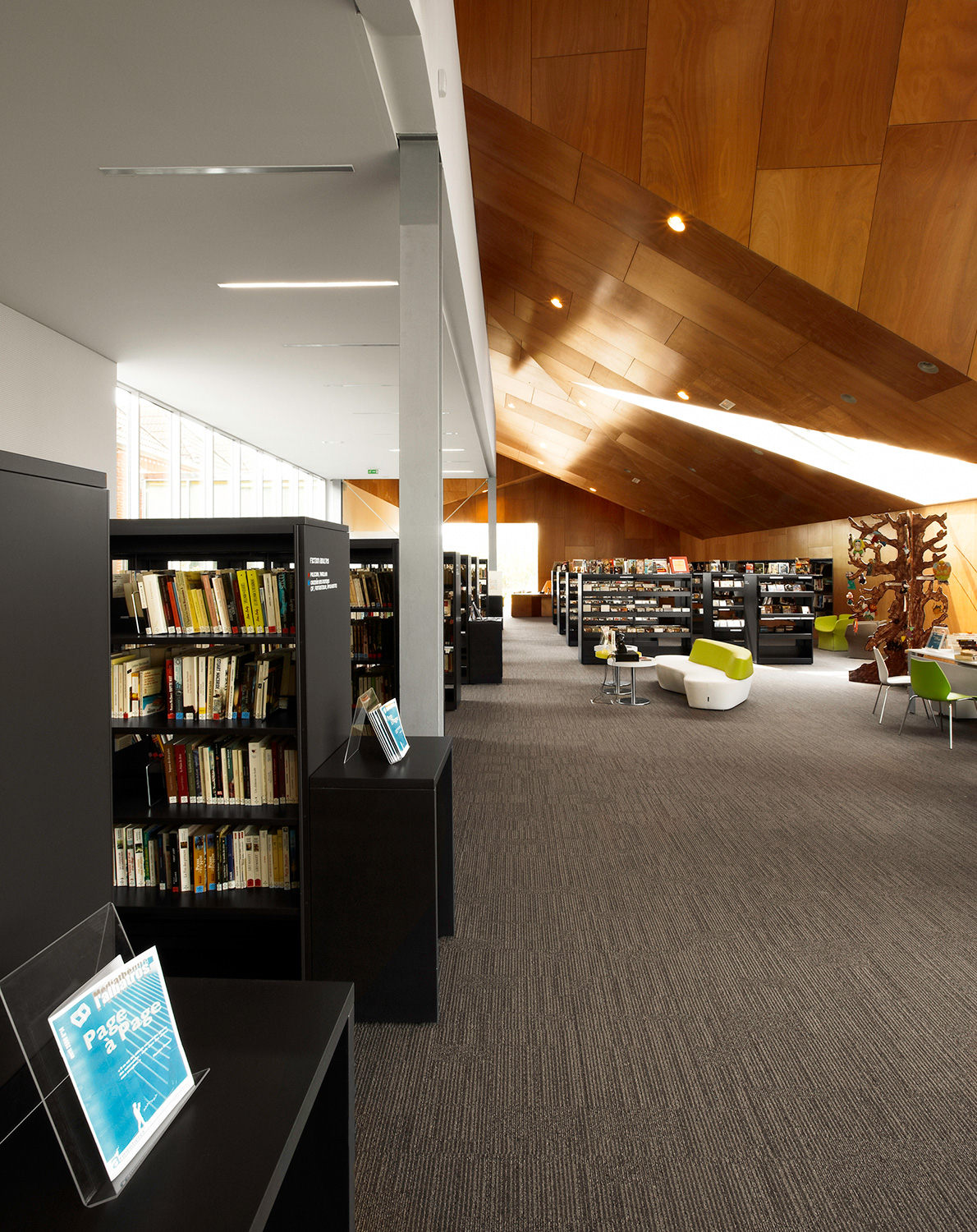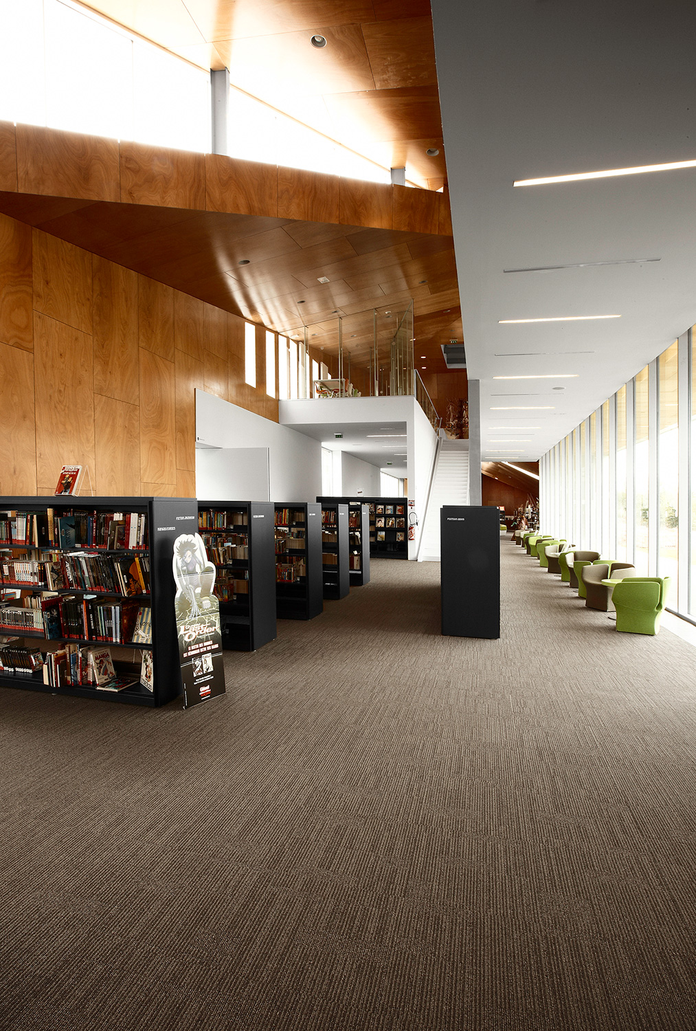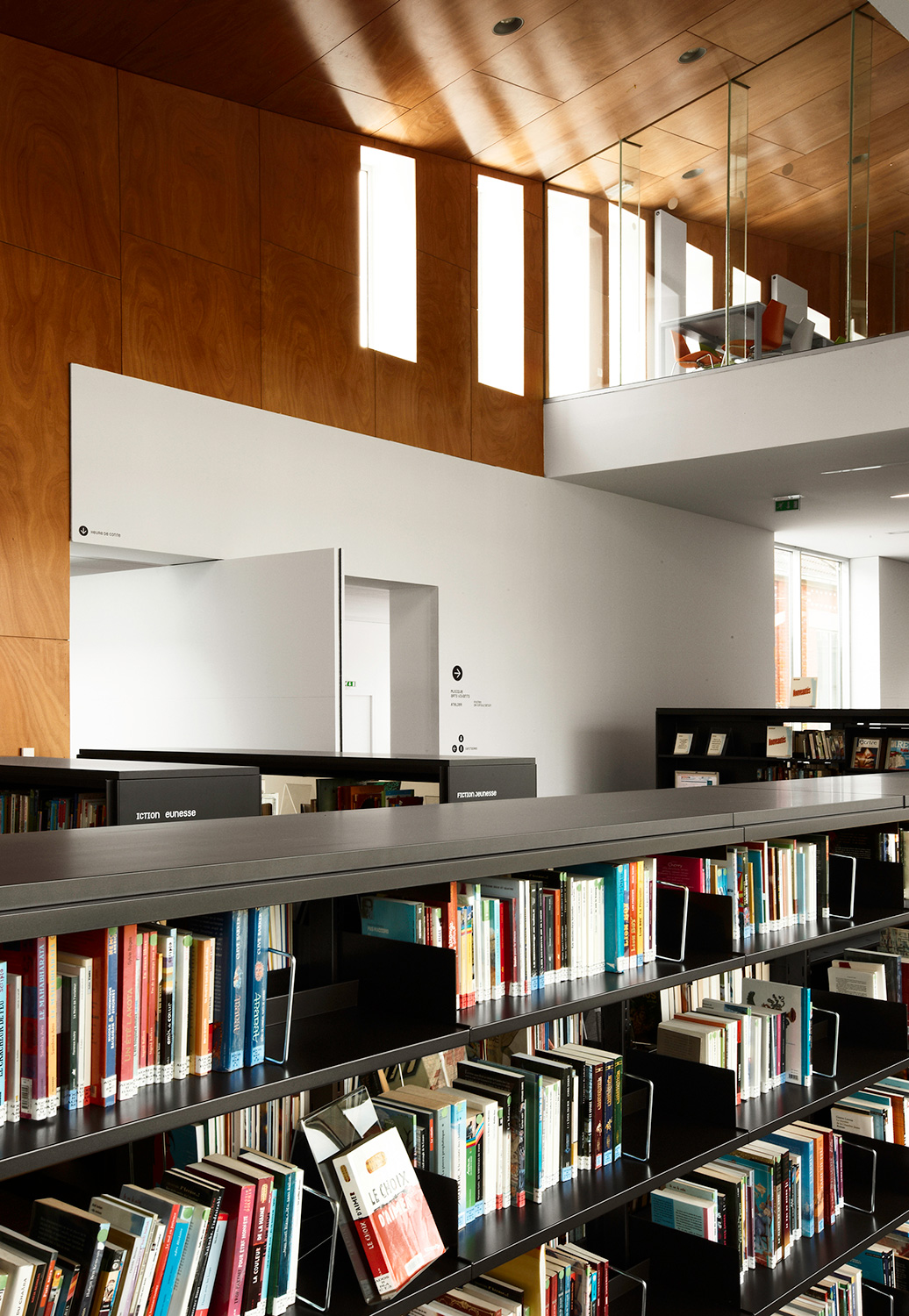 On the inside, the shelving system 60/30 with London end panels and top shelves, adds functionality and contributes to making the médiathèque a powerful environment for reading and experiencing new cultural media.