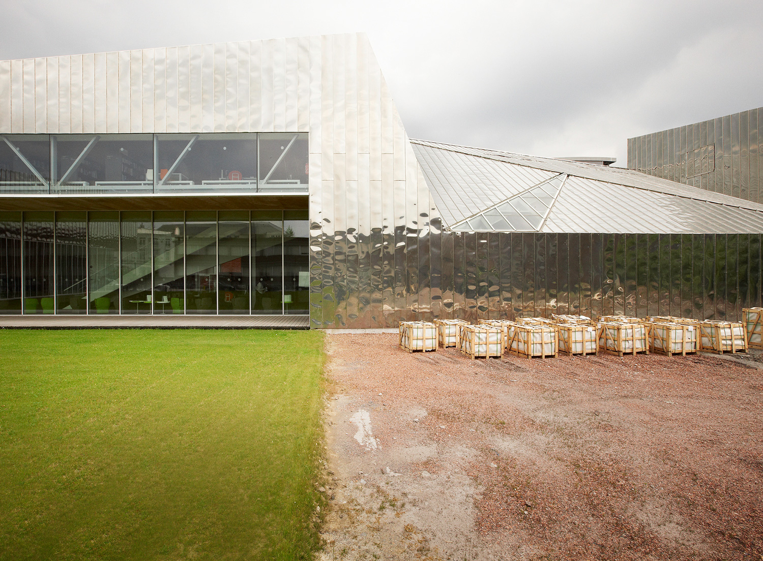 The roof, made of bright-annealed stainless steel is shaped as a horizontal, wave-like envelope, which folds over to fit the constraints of perspective and level off the height differences. According to the architects, the architectural style is a form of narration and expressionism appropriate for formal interpretation without being subject to overly theoretical rigour.