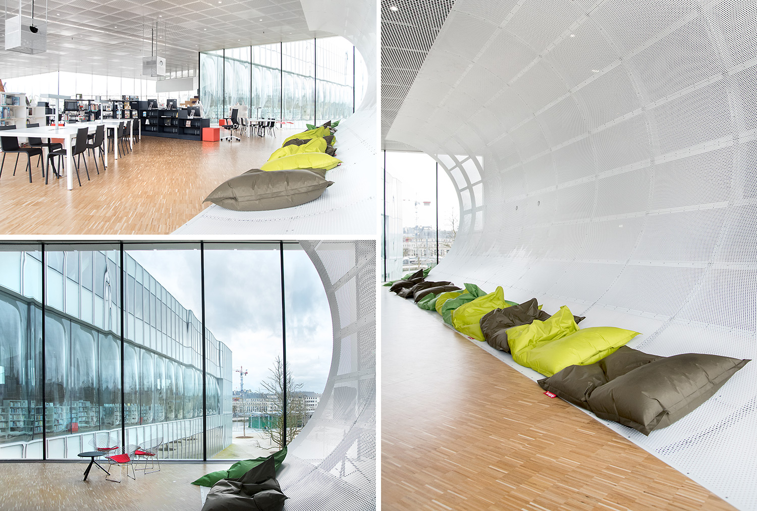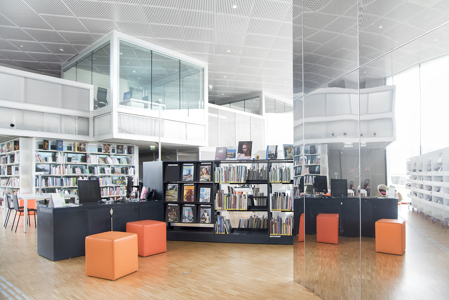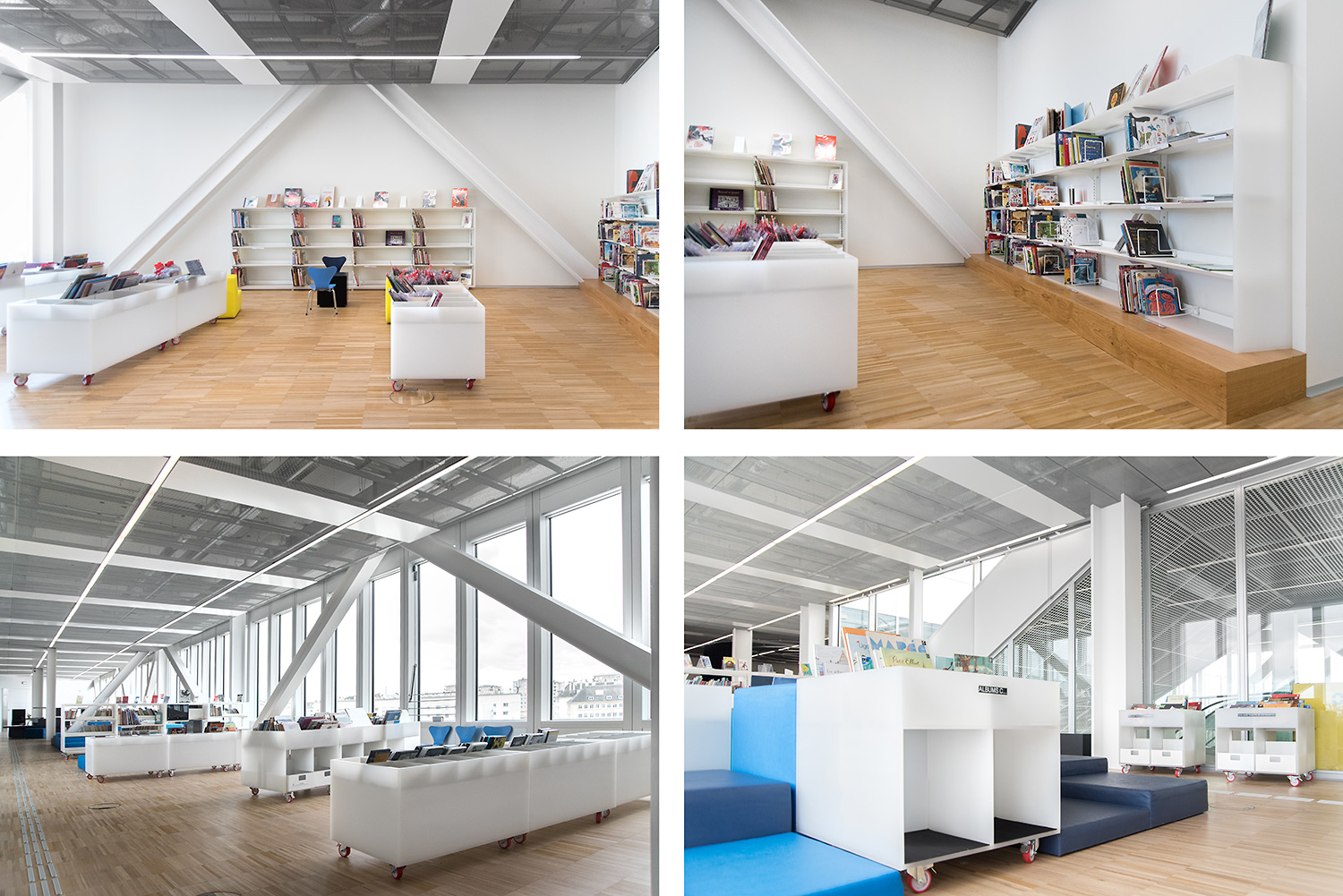 In the shape of a cross, the library houses 4 sections: arts in the east wing, social sciences in the south, literature in the west and sciences and technical sciences in the north. It will also offer new services, in particular an auditorium, exhibition areas, a cafe/restaurant and much more.