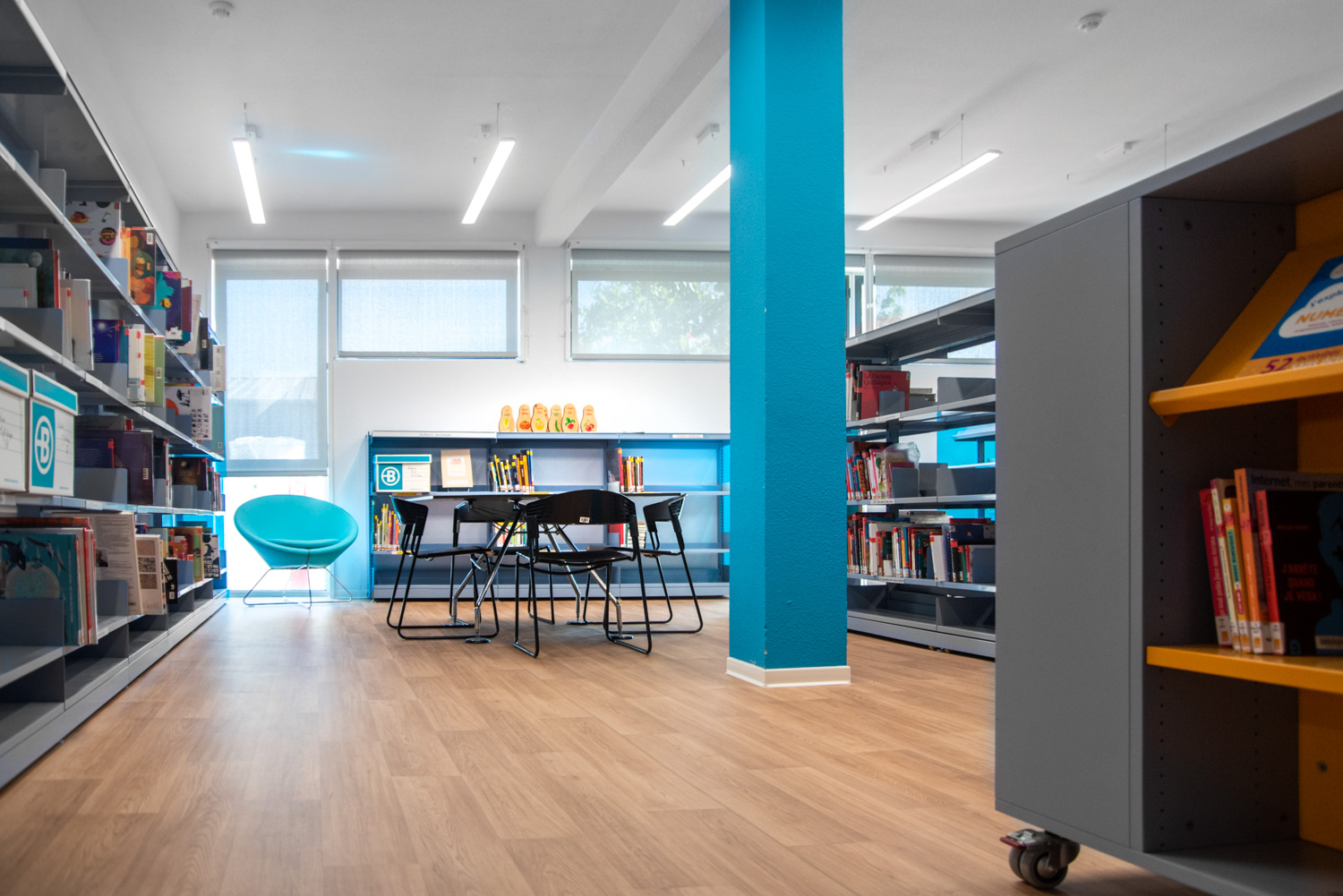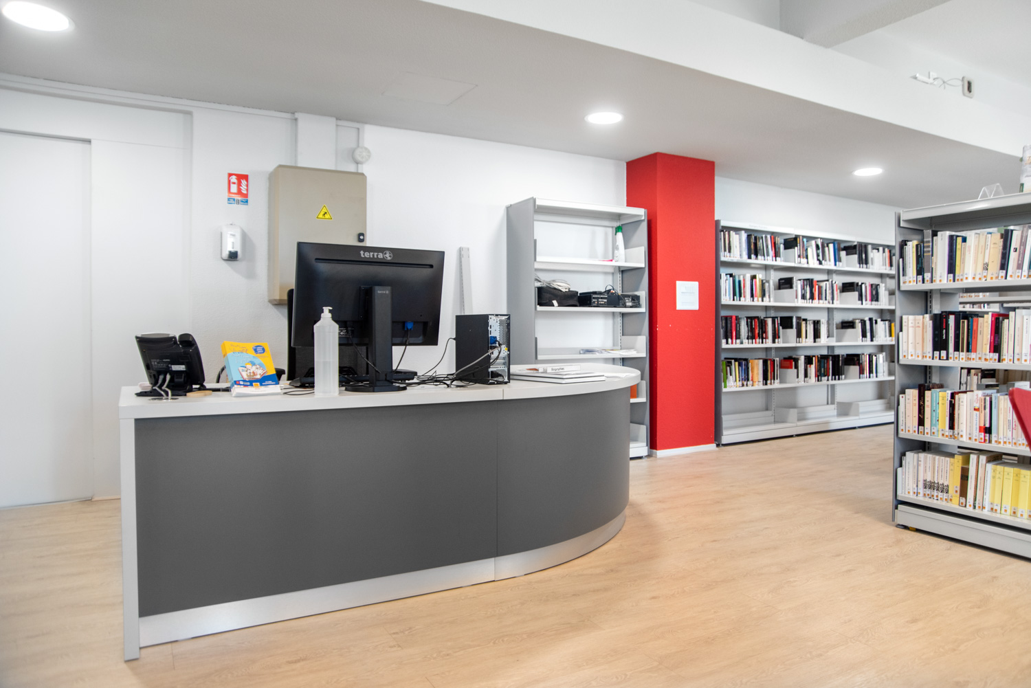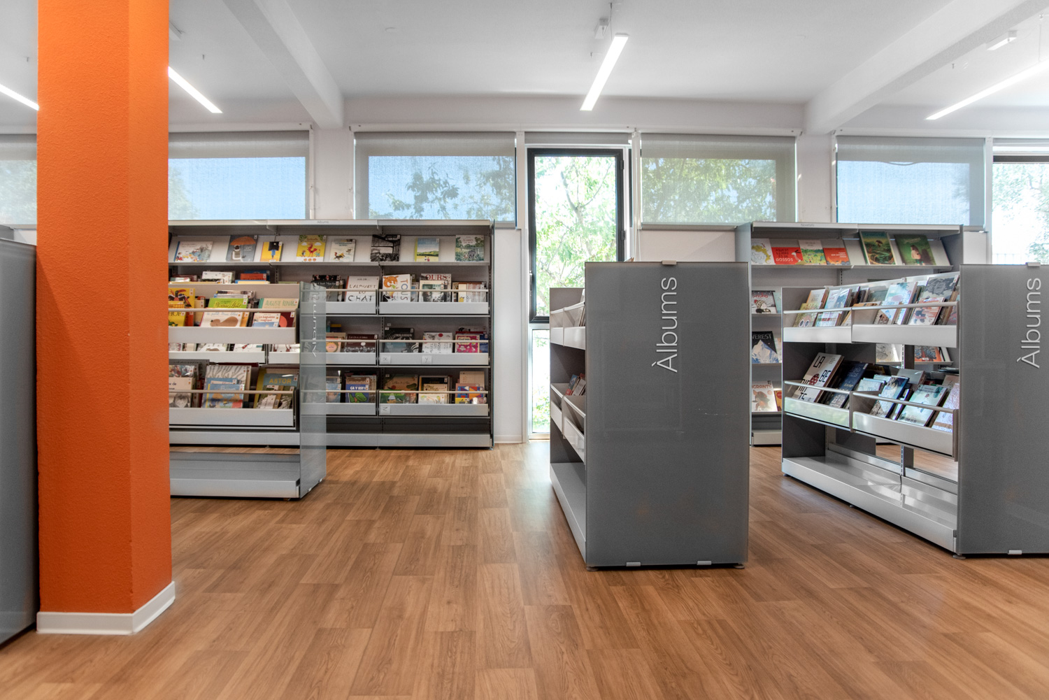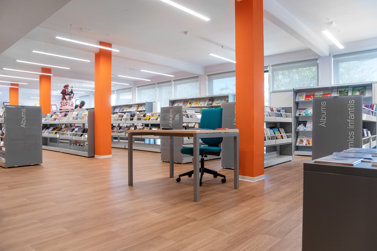 The old, renovated shops are now divided into four areas; on the ground floor there is a youth area and an entertainment area, on the first floor there is the adult section and a board games area. Each area is characterized by a specific color used for signage. In all departments, it is possible to get access and help in the Catalan language, and there are resources for remote audiences (e.g. collections with large print, braille and audio books) as well as various media types (CDs, vinyls, DVDs, etc.).