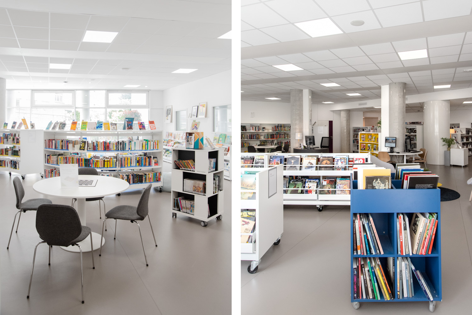 Due to its location on the ground floor, there were many architectural constraints (limited natural light, many load-bearing posts, etc.) and it therefore required particular attention in designing the interior layout. The choice of furniture as well as the layout had to be adapted to the different areas in the library, and by using modular furniture as well as furniture with different levels, the needs and uses of the public were considered.