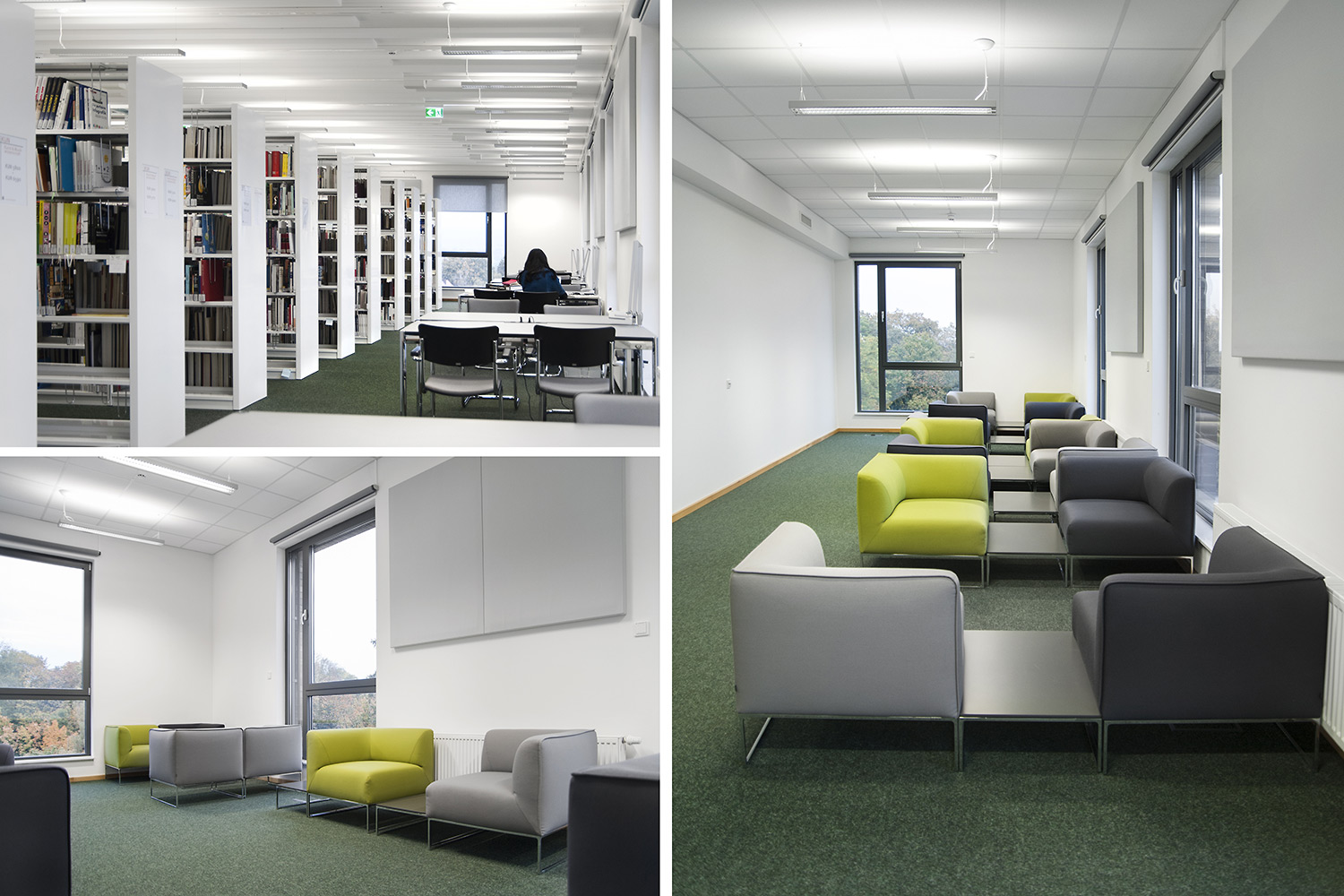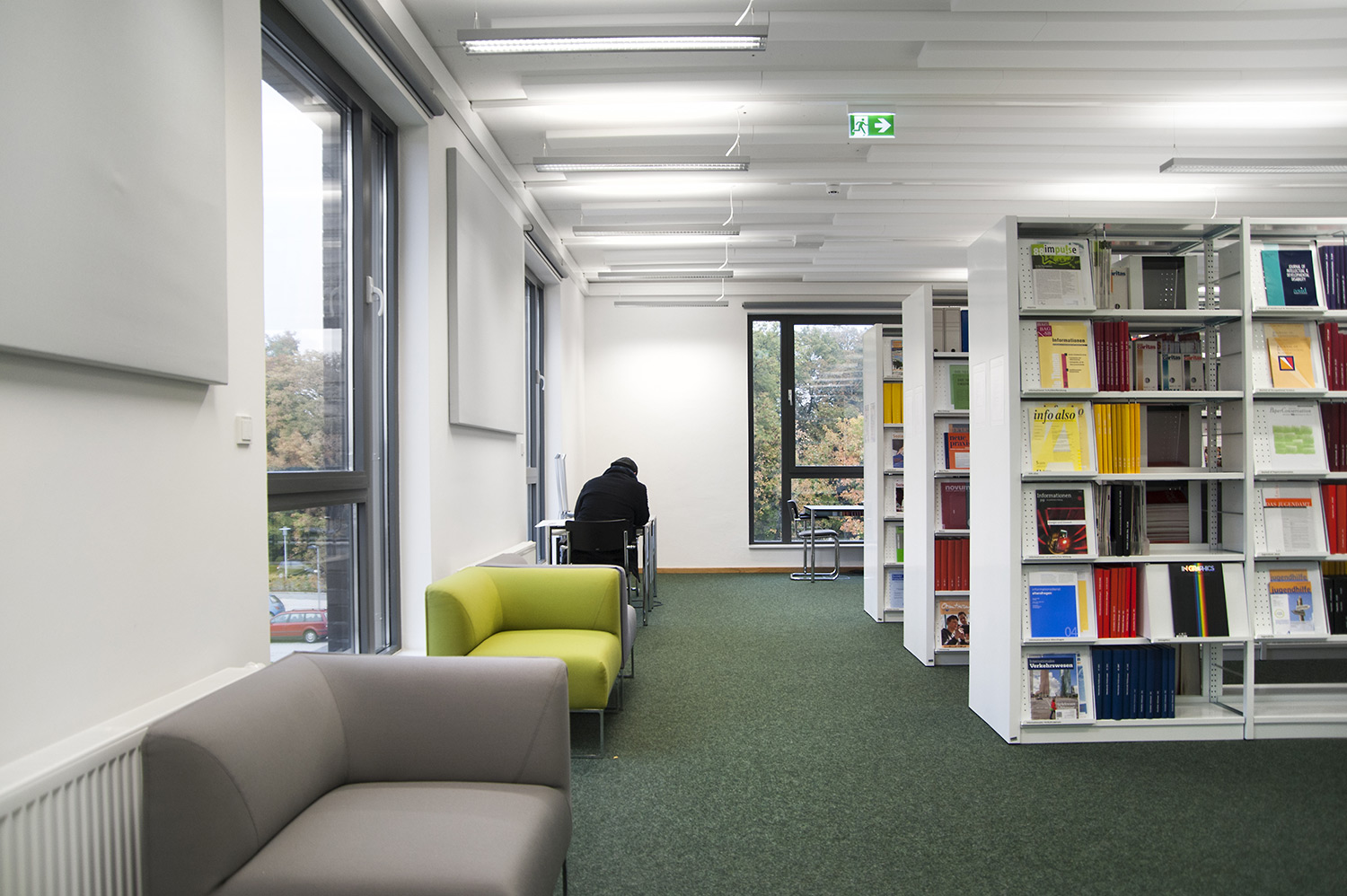 The University was previously located in 16 buildings spread across 8 locations. The heart of the new campus is the library building being the highest and most striking building with 7 full storeys - including five storeys for the library with nearly 2000 square meters and two lecture halls / seminar rooms. The relocated inventory includes 70,000 media, books and CD/DVDs.