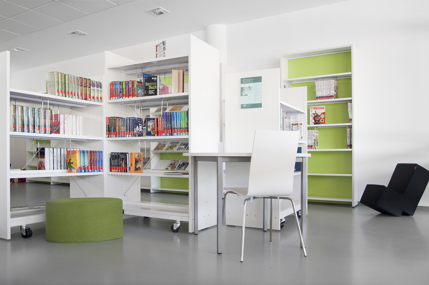 Located on the outskirts of the beautiful city district Edigheim in Ludwigshafen, a creative and progressive integrated comprehensive school has taken form. Its modern and multifunctional library is filled with unconventional ideas. The green and white interior has a natural and fresh atmosphere and correlates with the garden in the adjacent atrium.