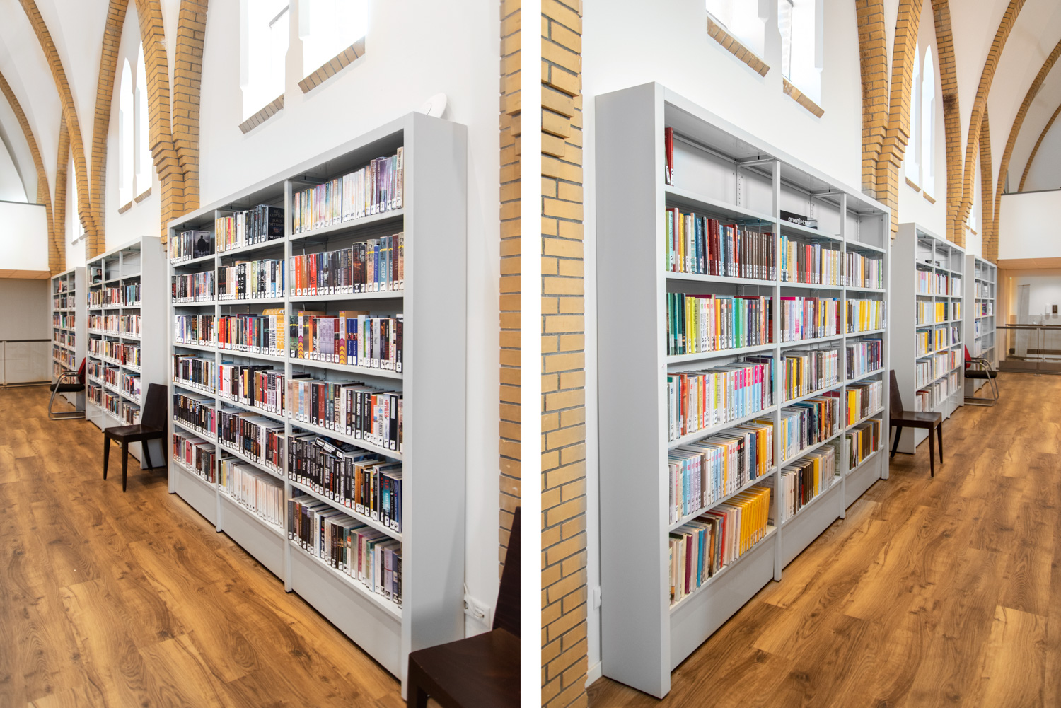 Today the former chapel of 't Gasthoes is put to a more modern use. It is now a multifunctional centre including a library. Contemporary library shelving systems have been placed between the historic building elements and are mounted on plinths for easy access.