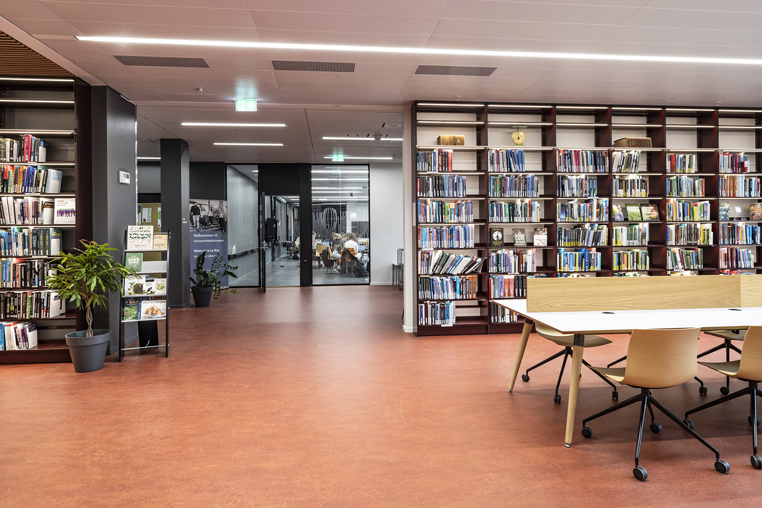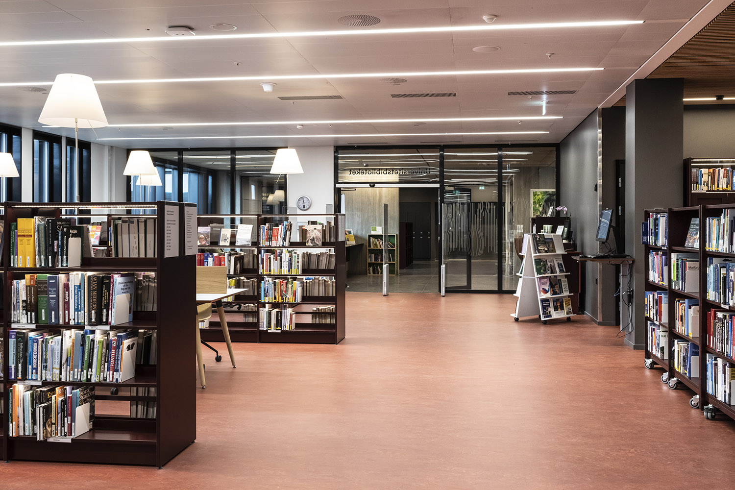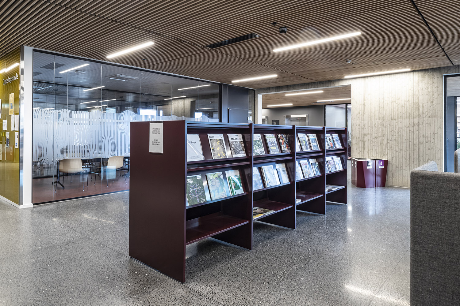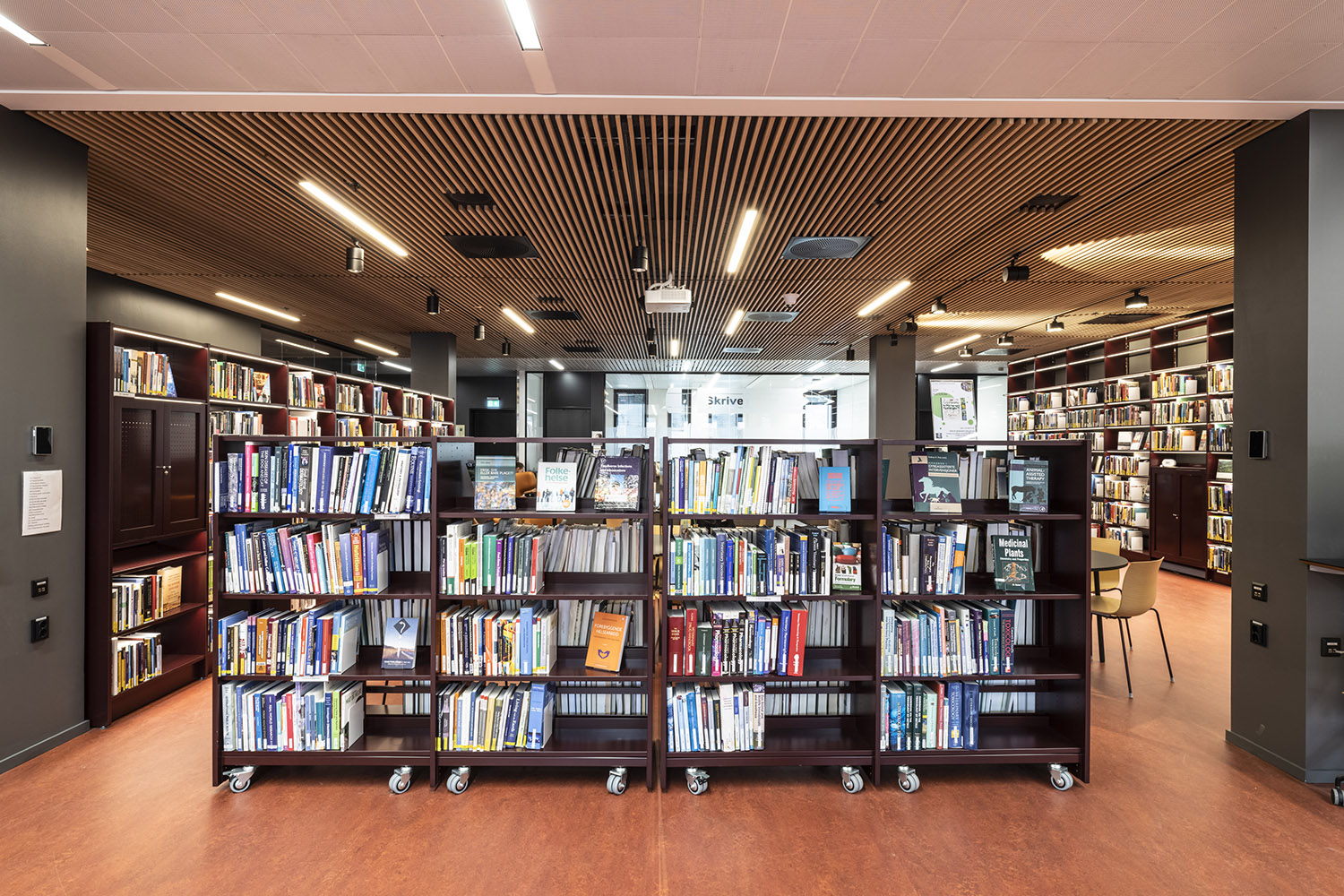 The new veterinary building consists of 8 connected buildings with a total of 2400 rooms. It contains traditional teaching areas, offices and a library, where the library in particular has become a central and natural gathering point for students, staff and visitors. The library is a merger of the library at the Veterinary College and the main library at Campus Ås, and is now a collection consisting of many different subjects.