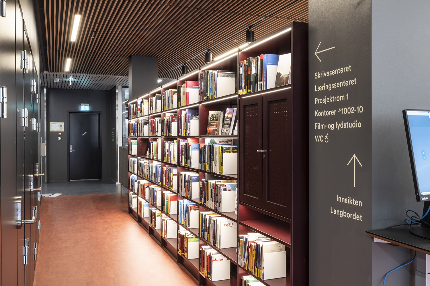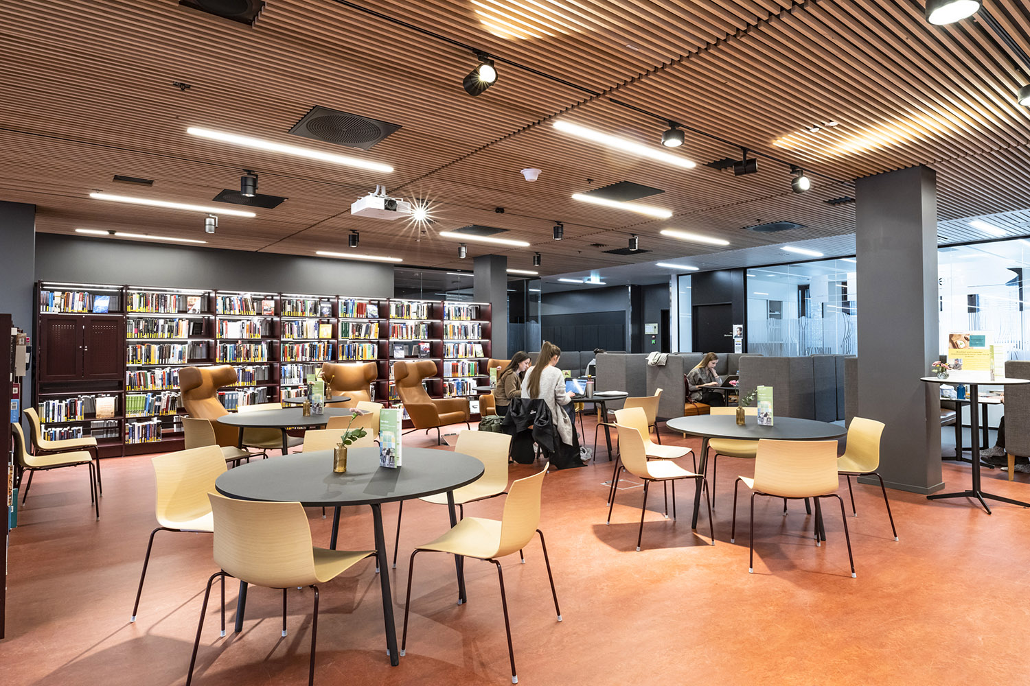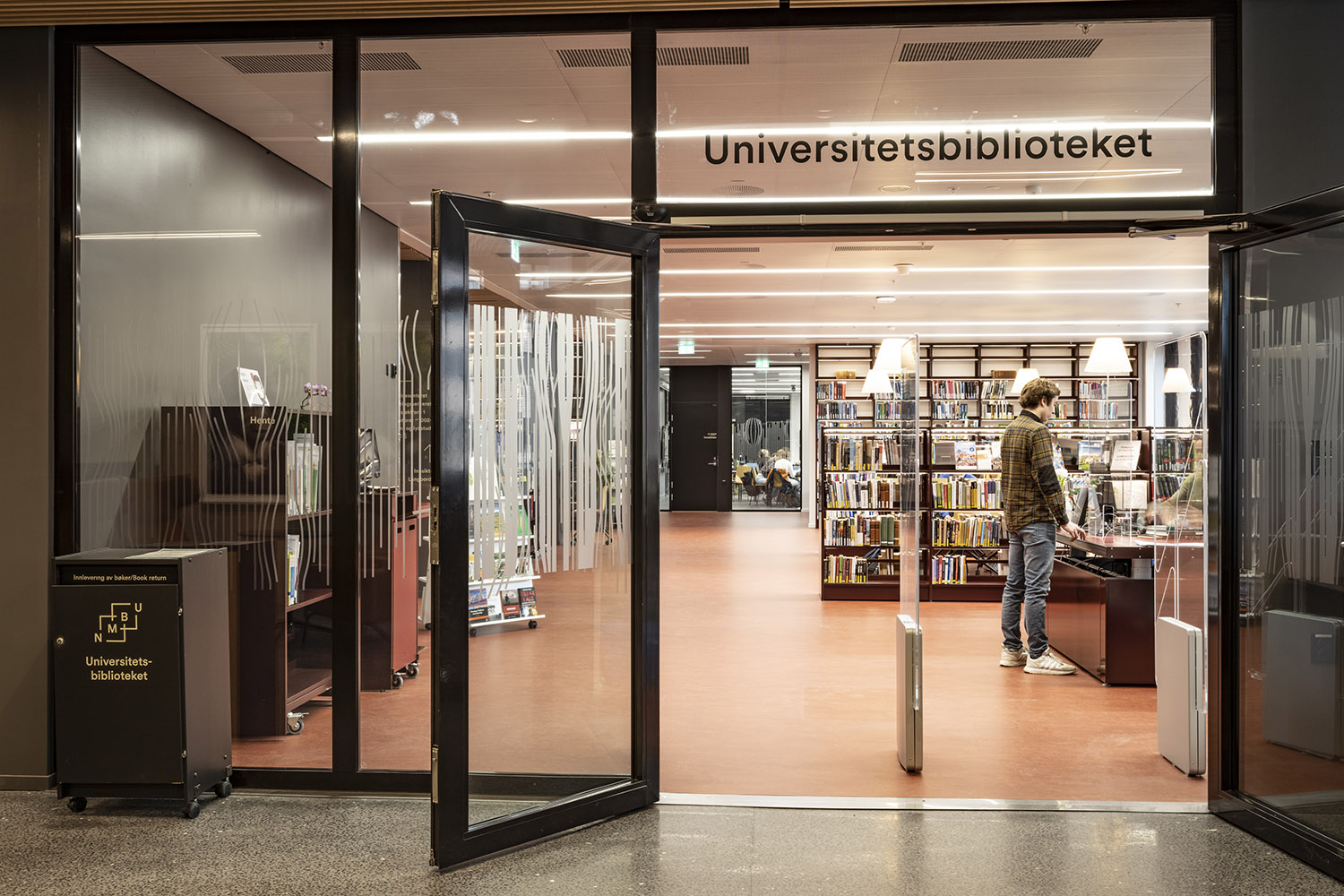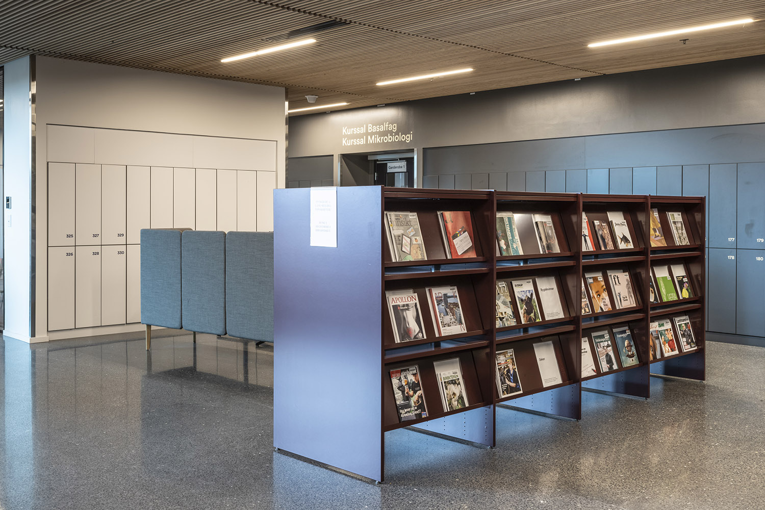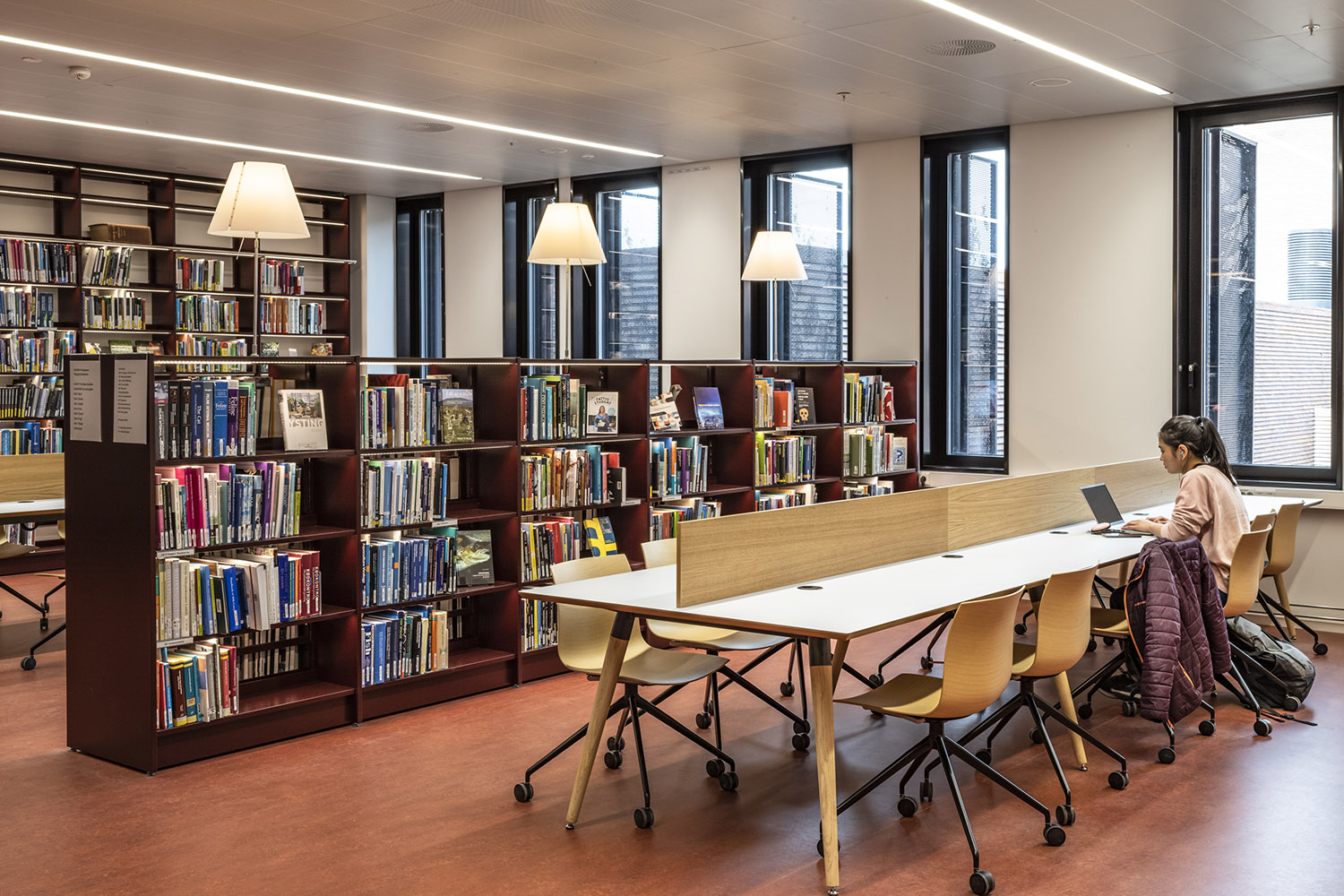 The new veterinary building consists of 8 connected buildings with a total of 2400 rooms. It contains traditional teaching areas, offices and a library, where the library in particular has become a central and natural gathering point for students, staff and visitors. The library is a merger of the library at the Veterinary College and the main library at Campus Ås, and is now a collection consisting of many different subjects.