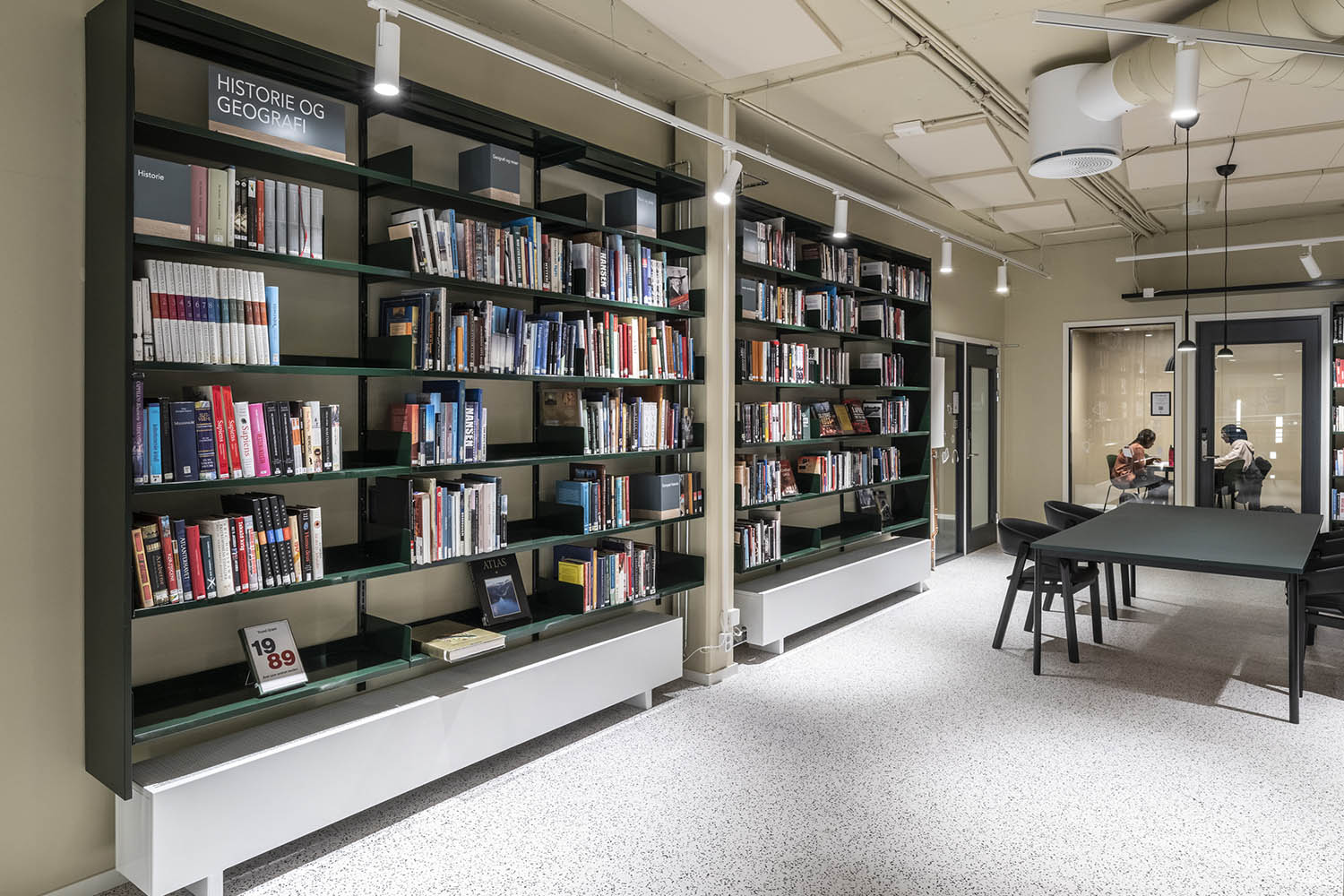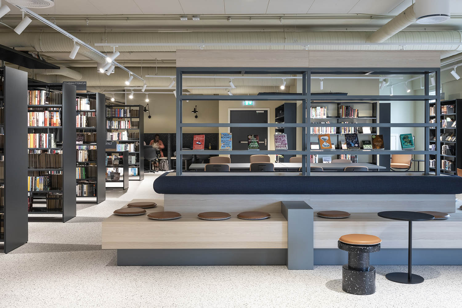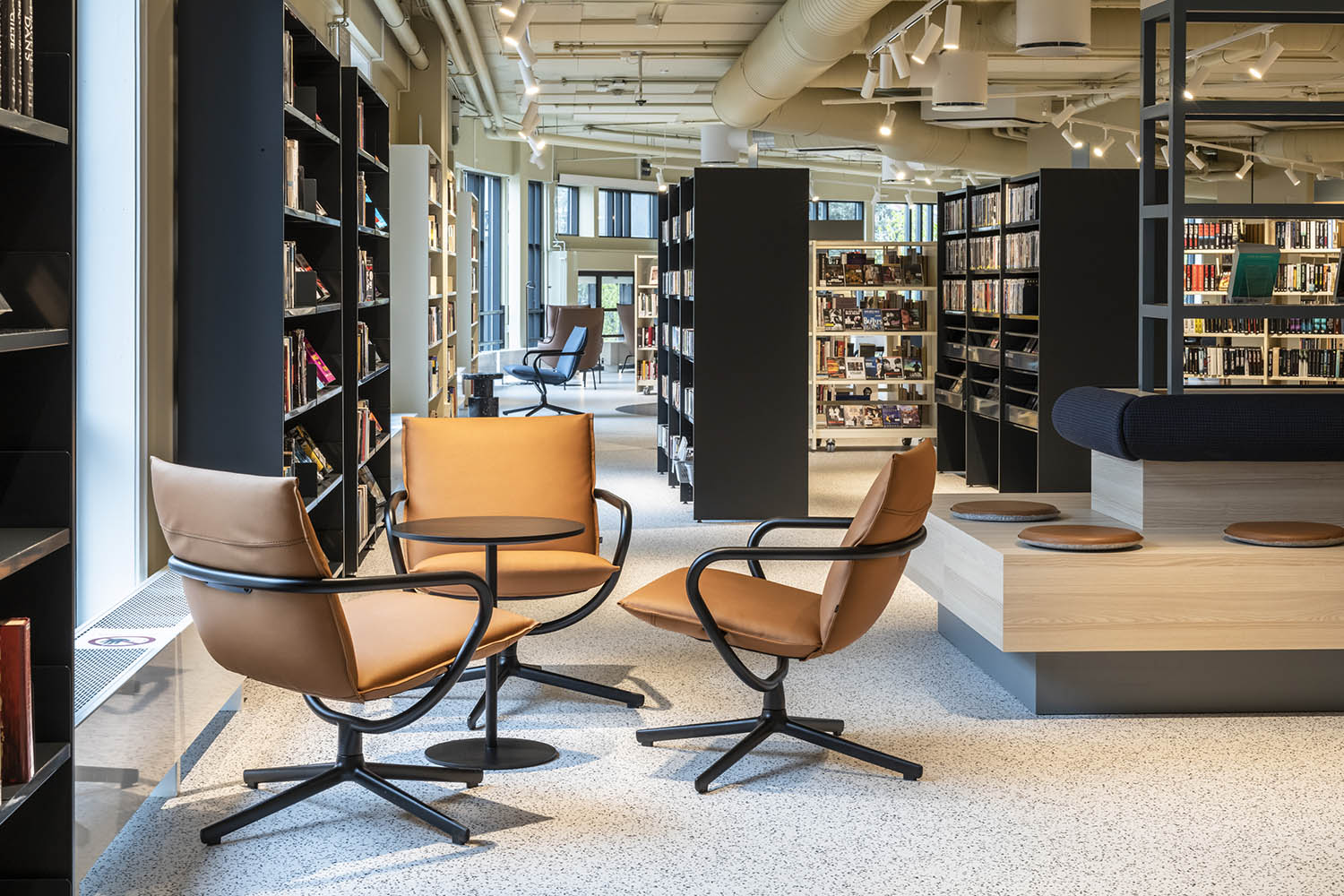 The library is generally furnished with shelving systems in both light and dark colors that complement each other and, together with the rest of the furniture, create an inviting and cozy atmosphere with room for all types of users.