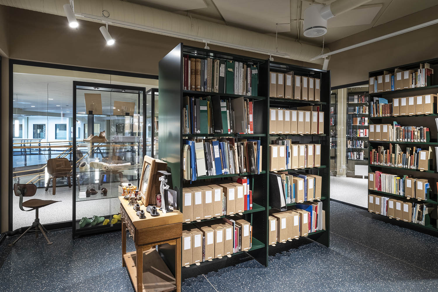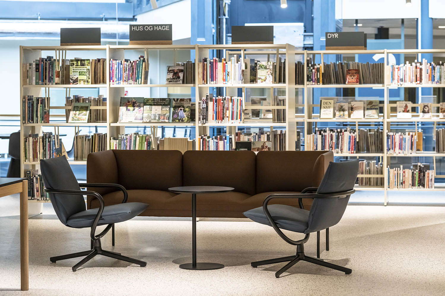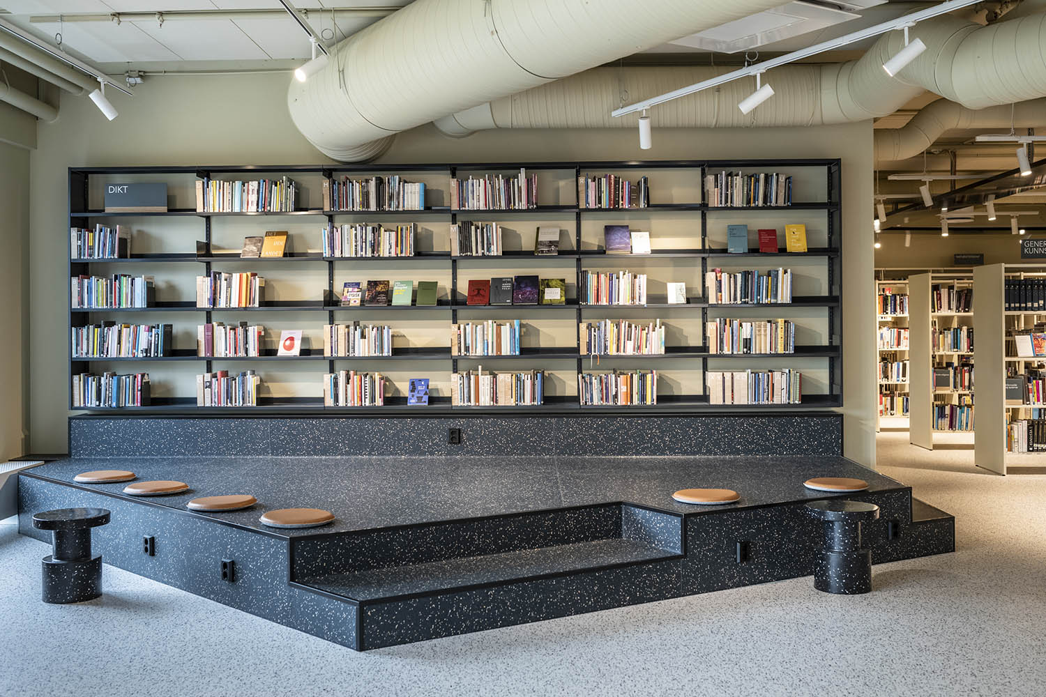 The library is generally furnished with shelving systems in both light and dark colors that complement each other and, together with the rest of the furniture, create an inviting and cozy atmosphere with room for all types of users.