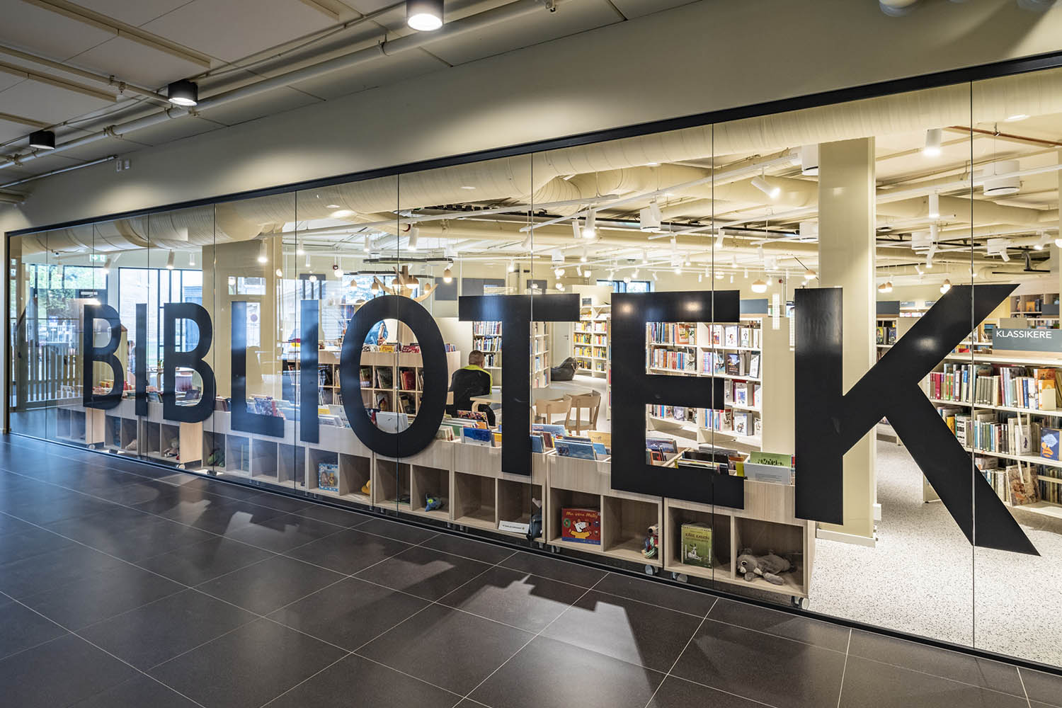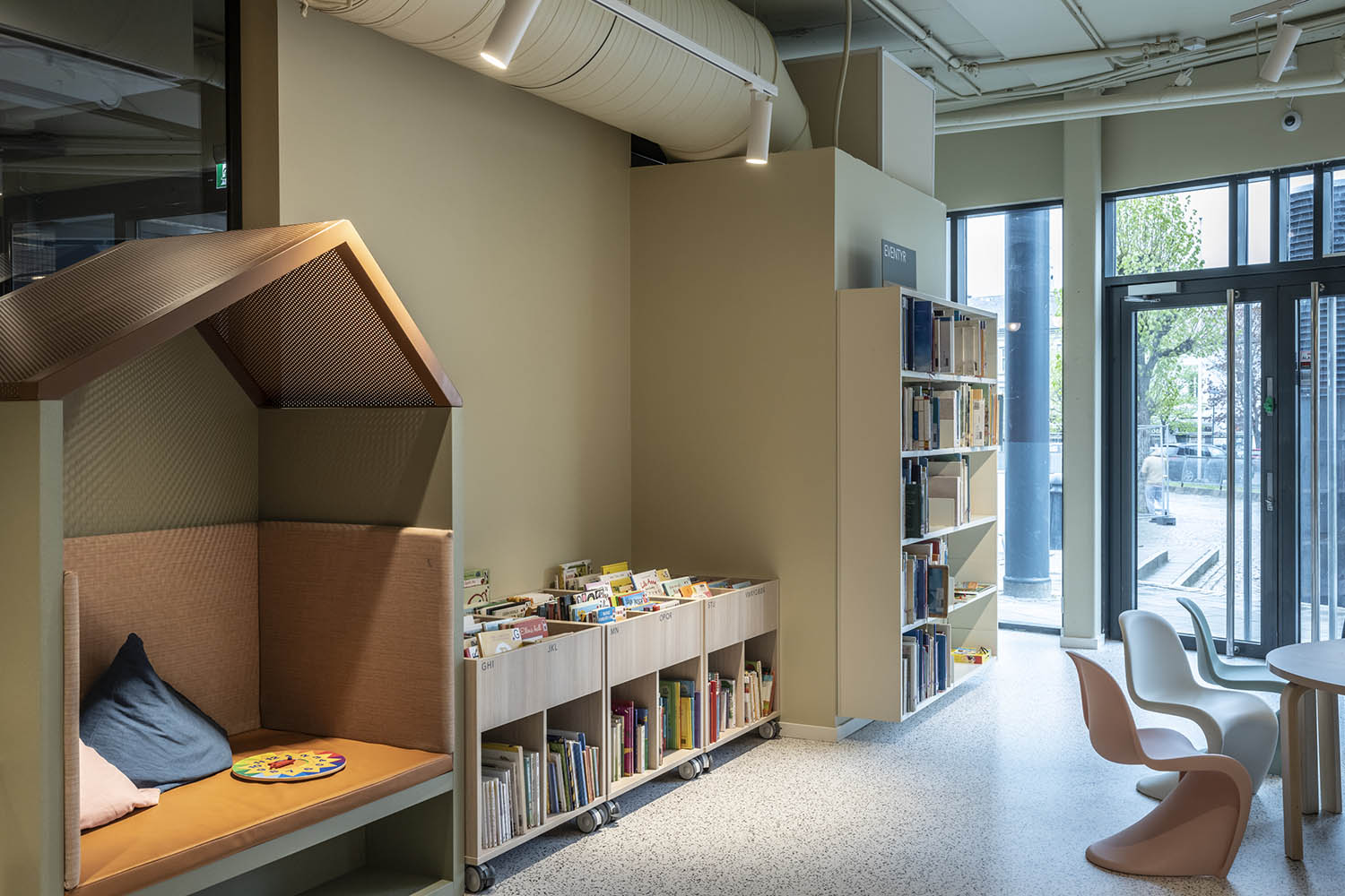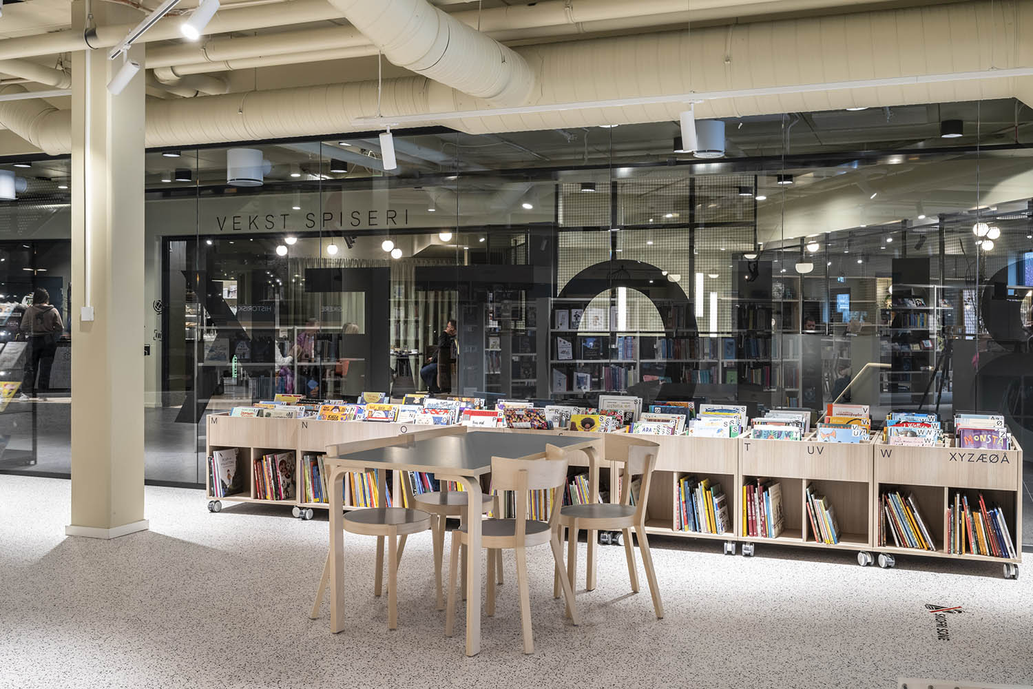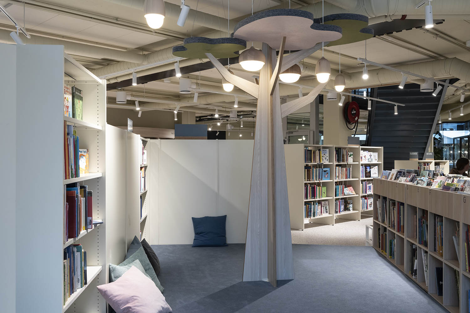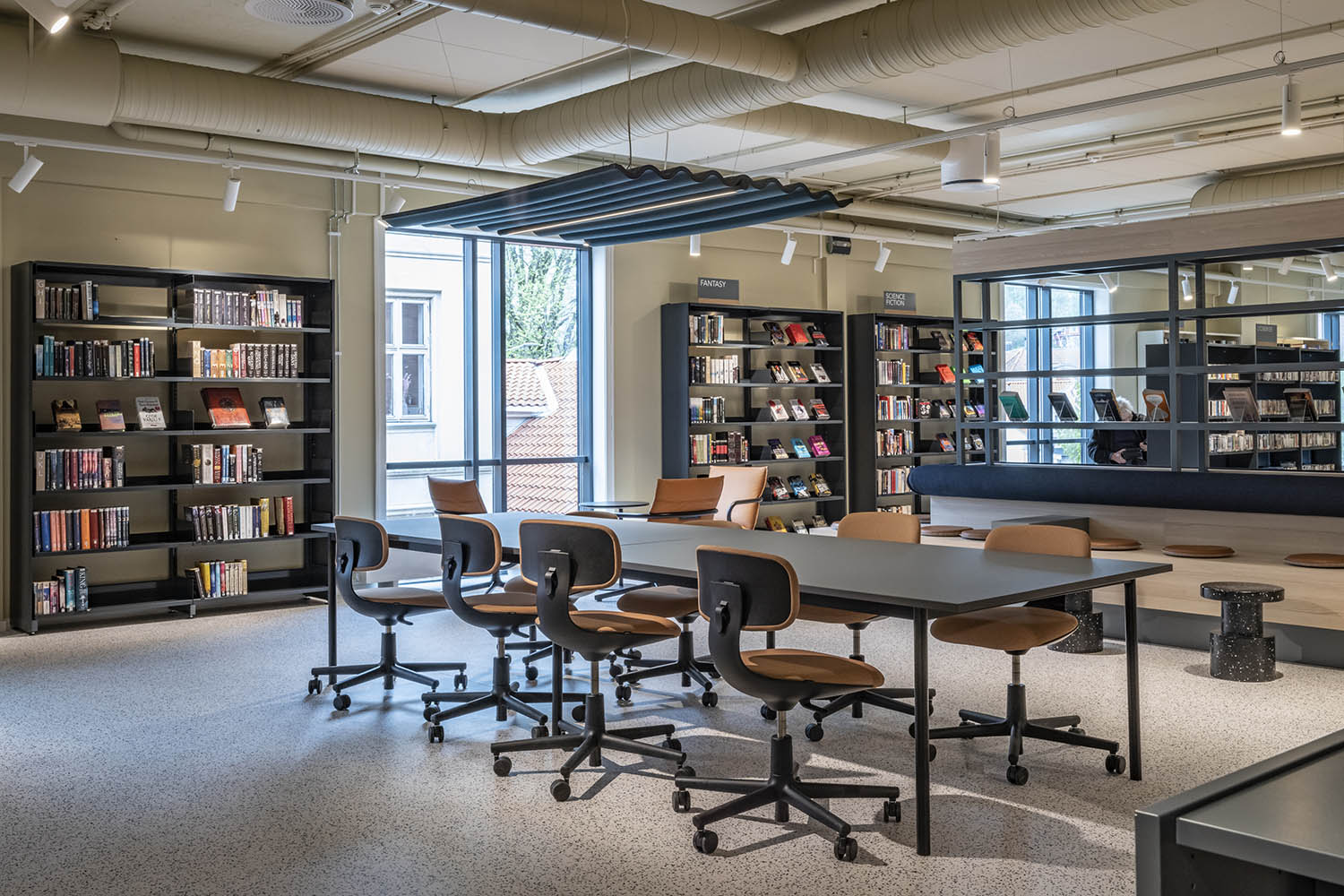 The library, which is spread over two floors, has become a warm oasis in the new cultural center. On the ground floor you find the children's and youth department with separate zones for children and young people. There is, among other things, a gaming room and an adventure room for dissemination of children’s literature. On the same floor, you also find self-service machines as well as an area for reserved materials.
