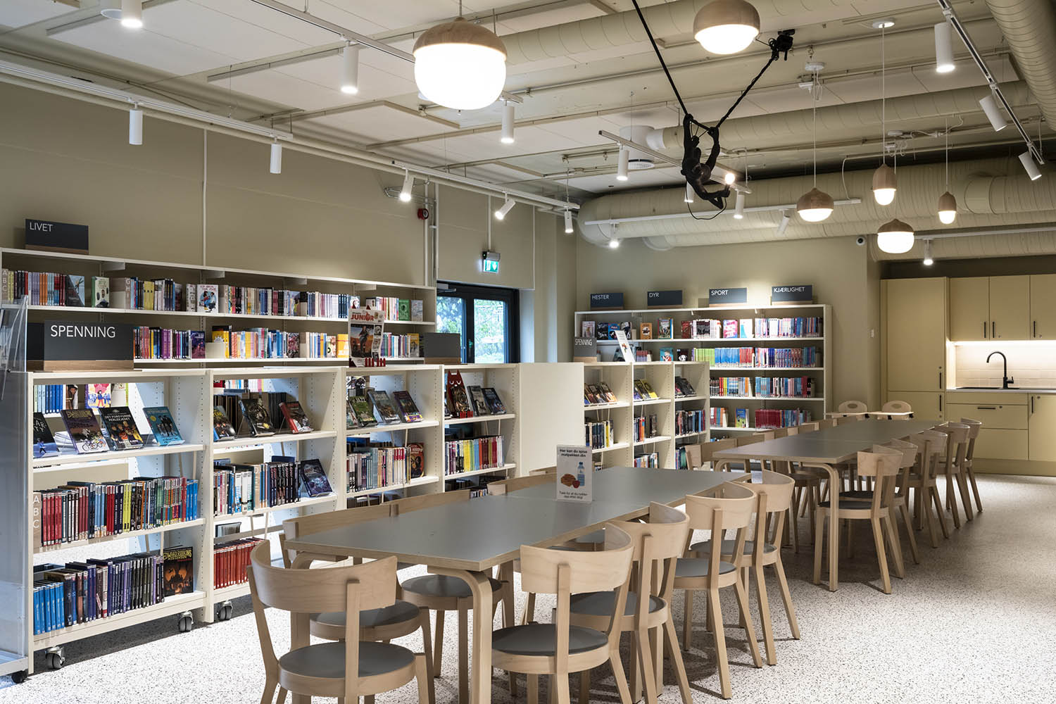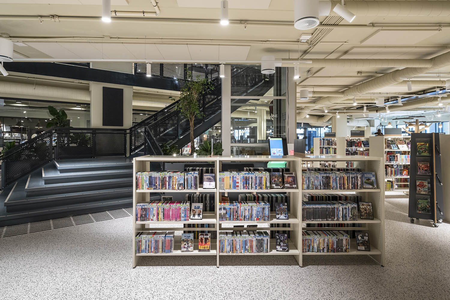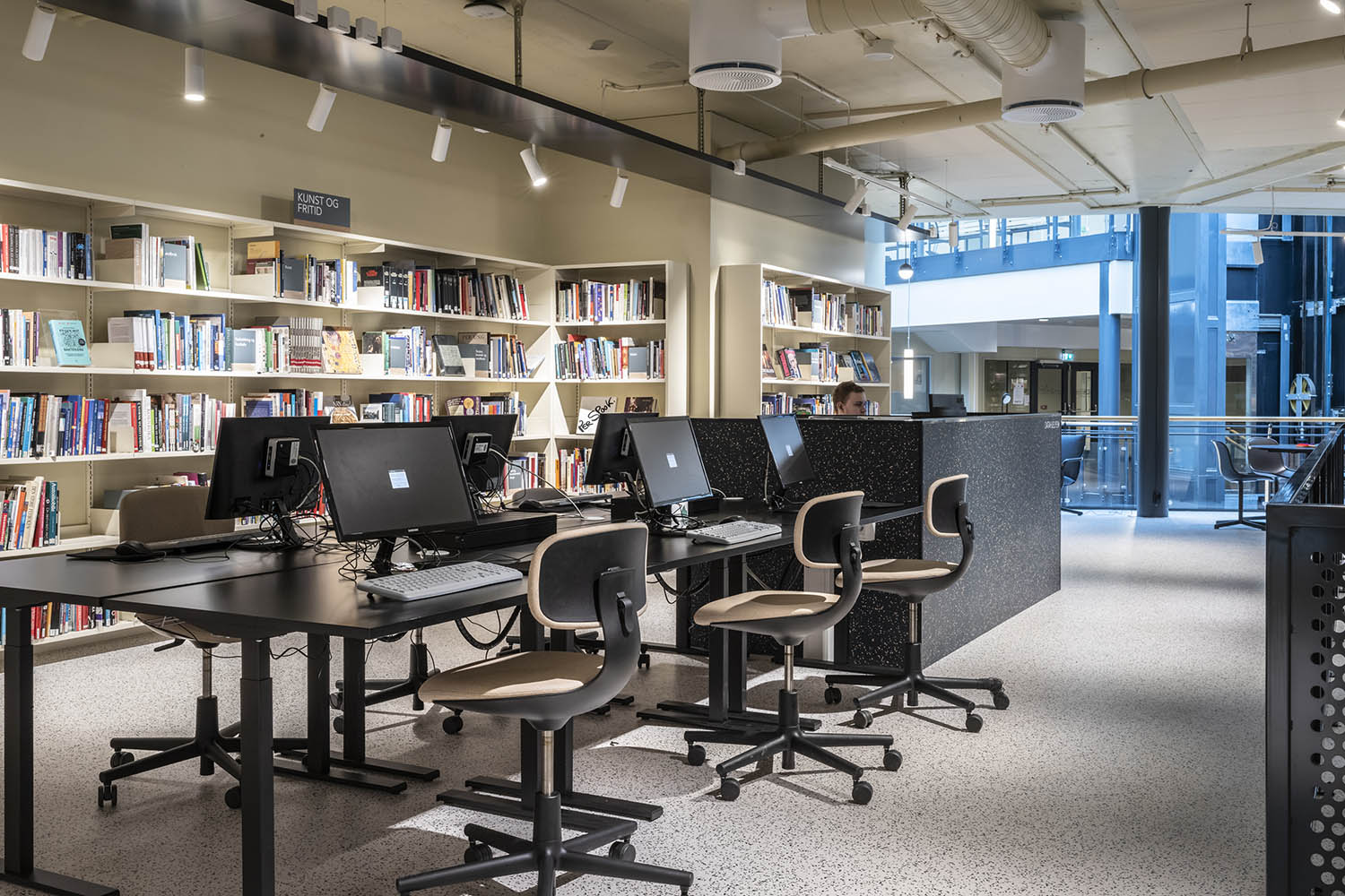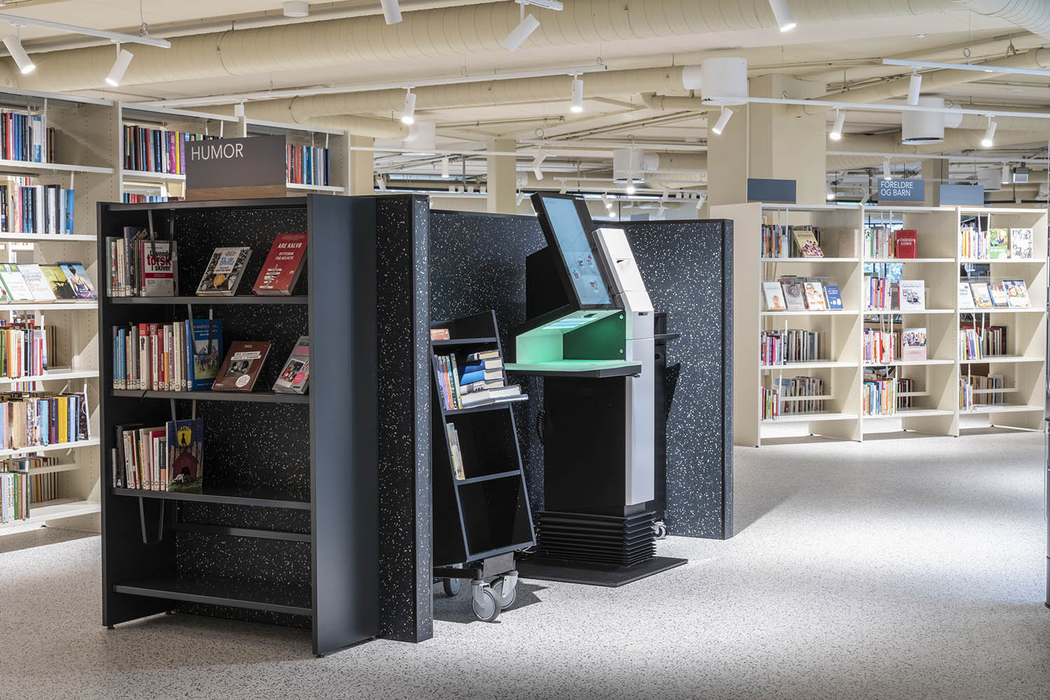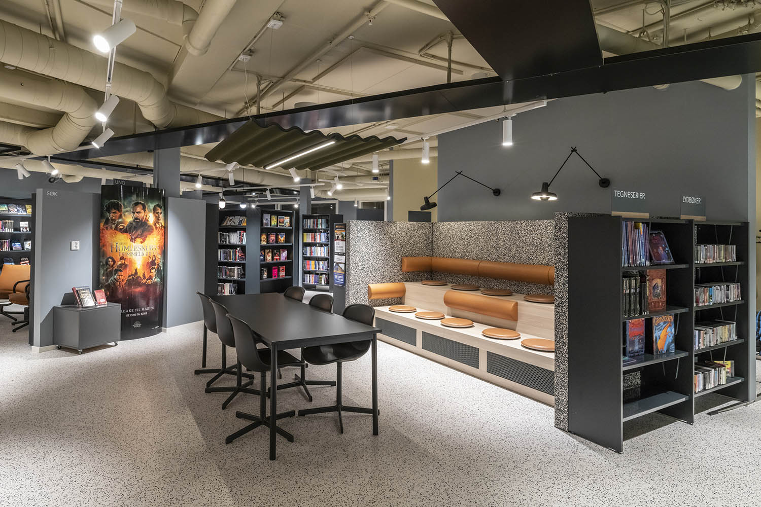 The library, which is spread over two floors, has become a warm oasis in the new cultural center. On the ground floor you find the children's and youth department with separate zones for children and young people. There is, among other things, a gaming room and an adventure room for dissemination of children’s literature. On the same floor, you also find self-service machines as well as an area for reserved materials.
