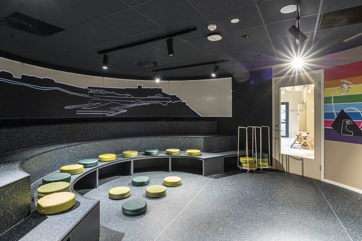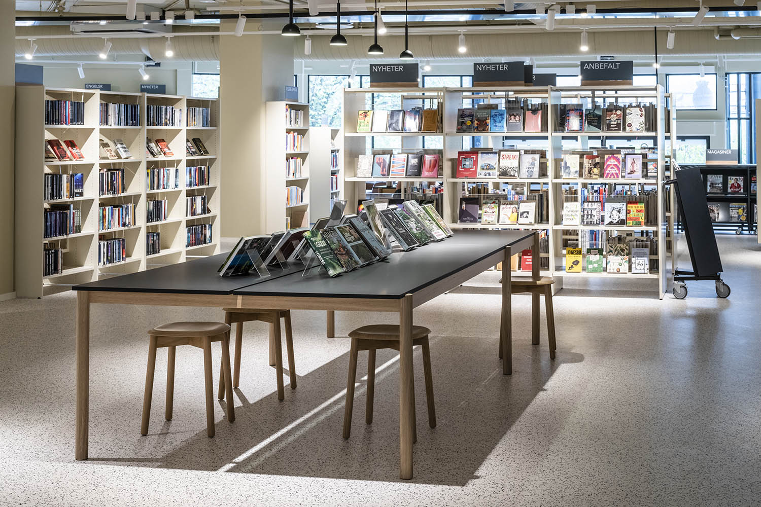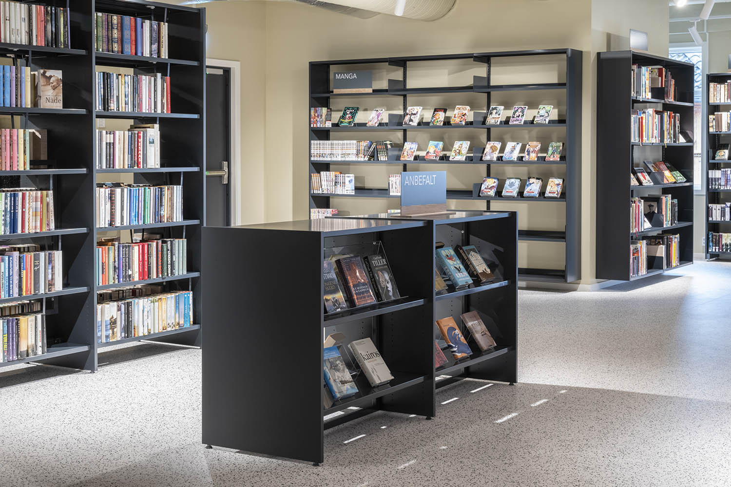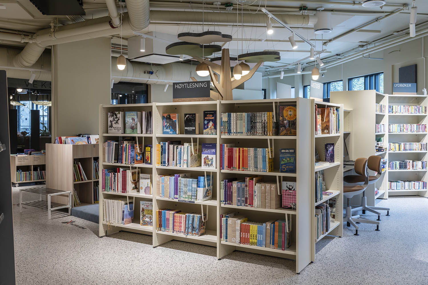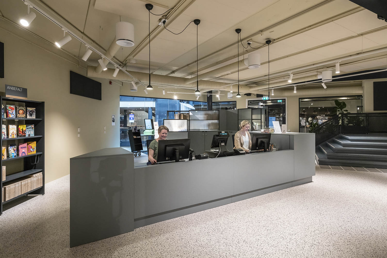 The library, which is spread over two floors, has become a warm oasis in the new cultural center. On the ground floor you find the children's and youth department with separate zones for children and young people. There is, among other things, a gaming room and an adventure room for dissemination of children’s literature. On the same floor, you also find self-service machines as well as an area for reserved materials.