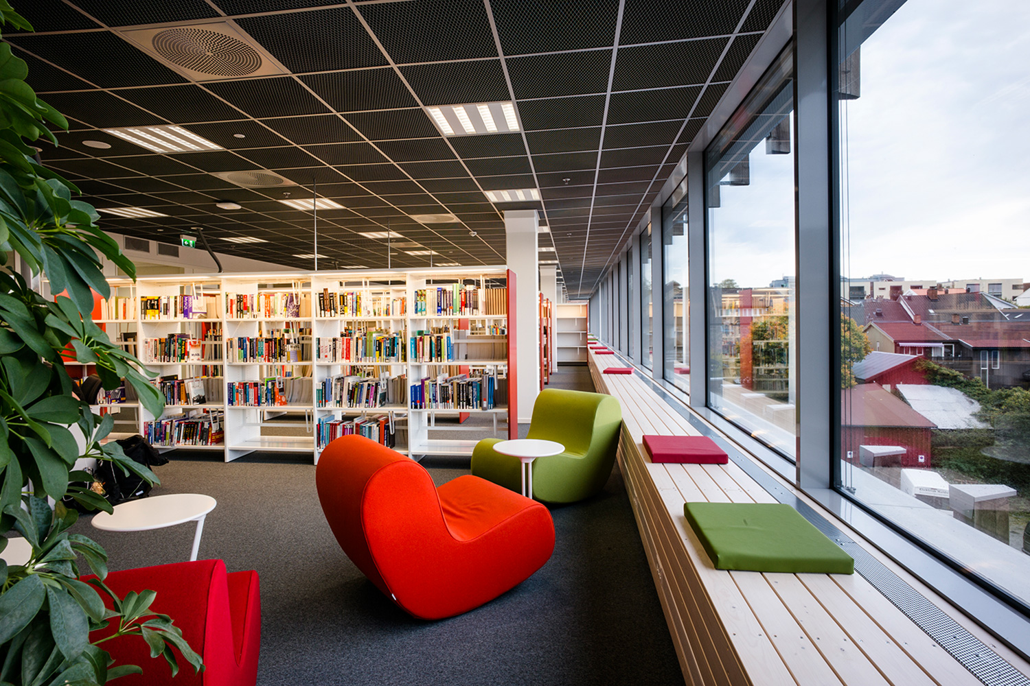 Kongsberg Public Library is placed in KRONA – Kongsberg Culture- and knowledge House that also includes a college library, College of Buskerud, the higher College Tinius Olsen, a composites laboratory, Kongsberg Norwegian centre, three cinemas, a musical theatre and lecture room, black-box theatre as well as municipal offices. In other words, a house that accommodates a lot and allows interaction.