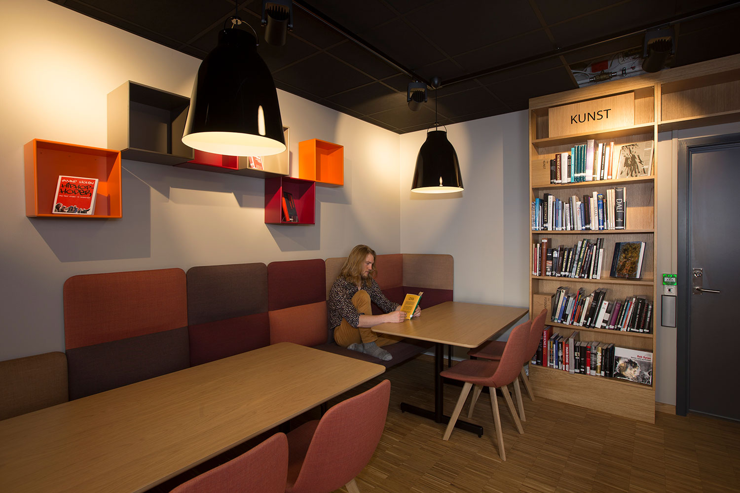 The library are now 500 m2 in settings that are both spacious, bright and inviting. At the library they enforce the tradition of taking off shoes before entering the library. It creates a warm and nice atmosphere; something that is also emphasized in the choice of materials and colors as well as the interior design in general.
