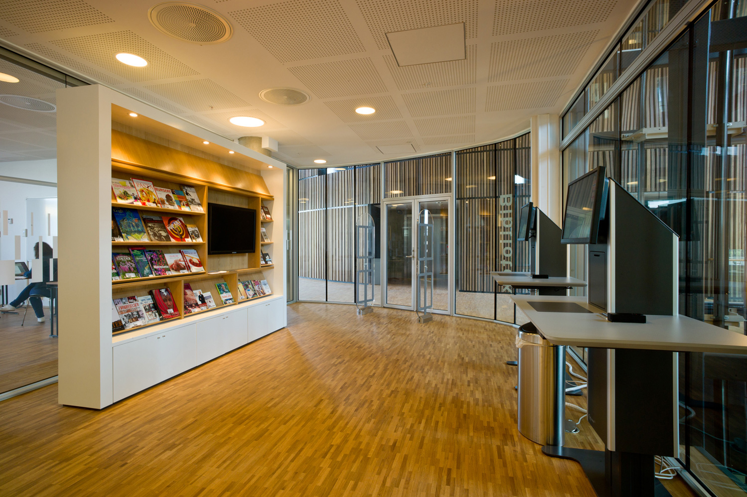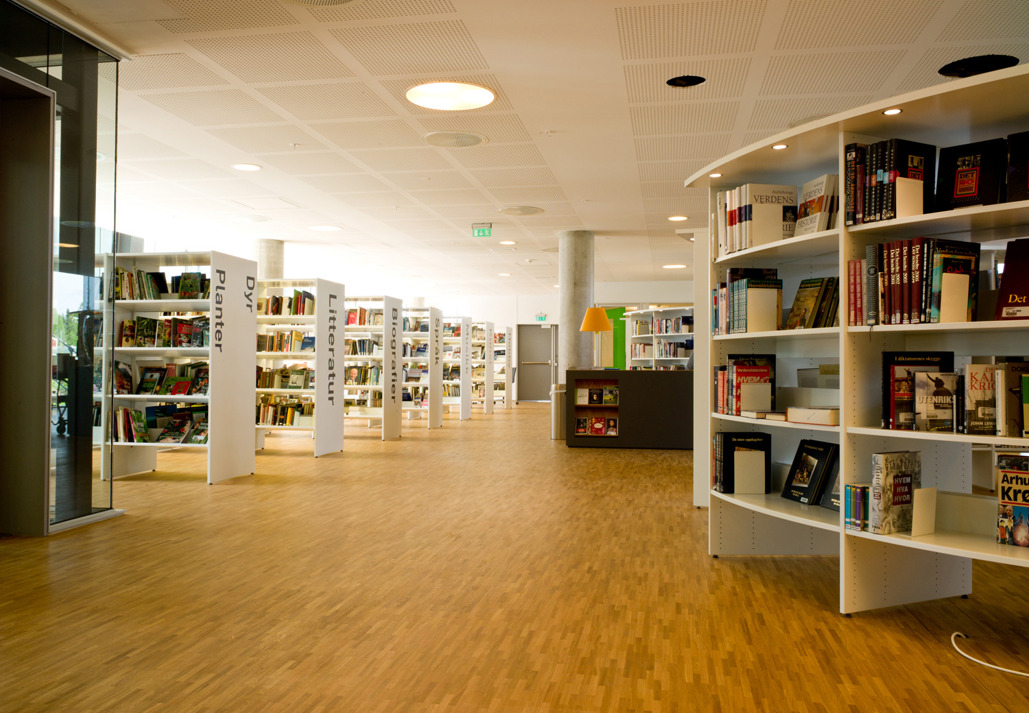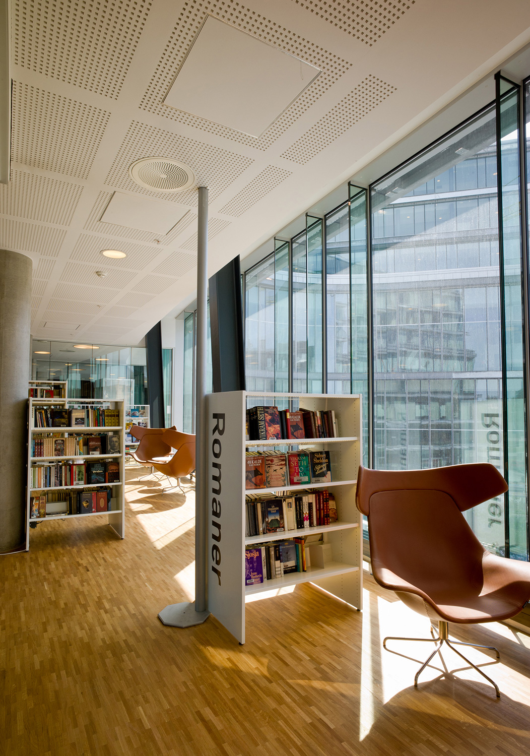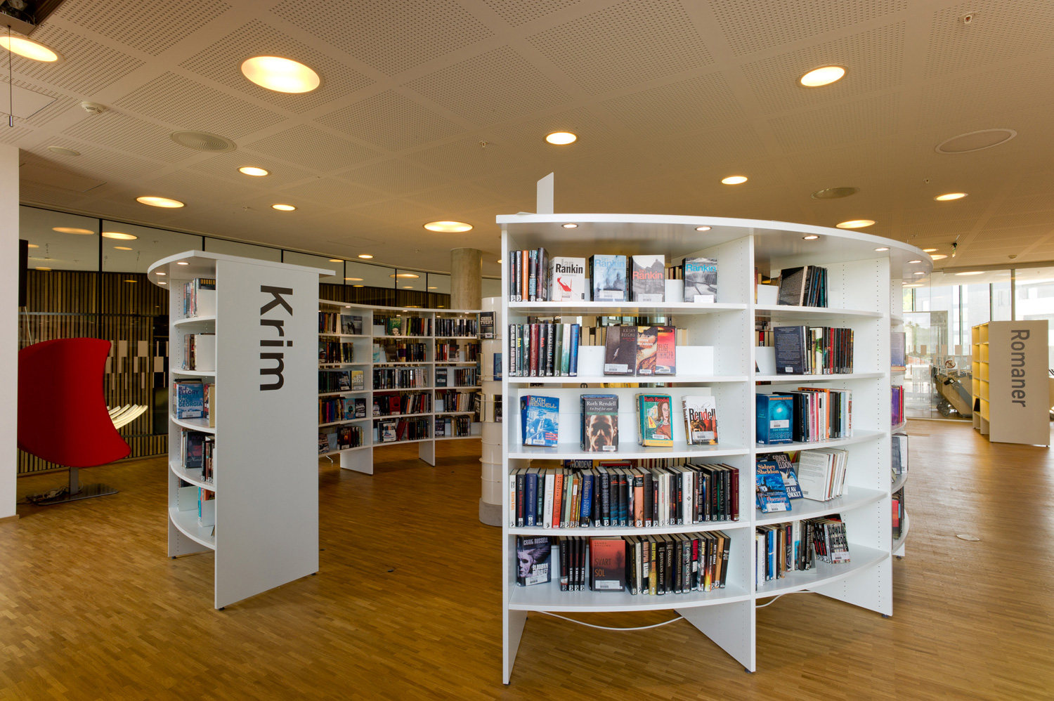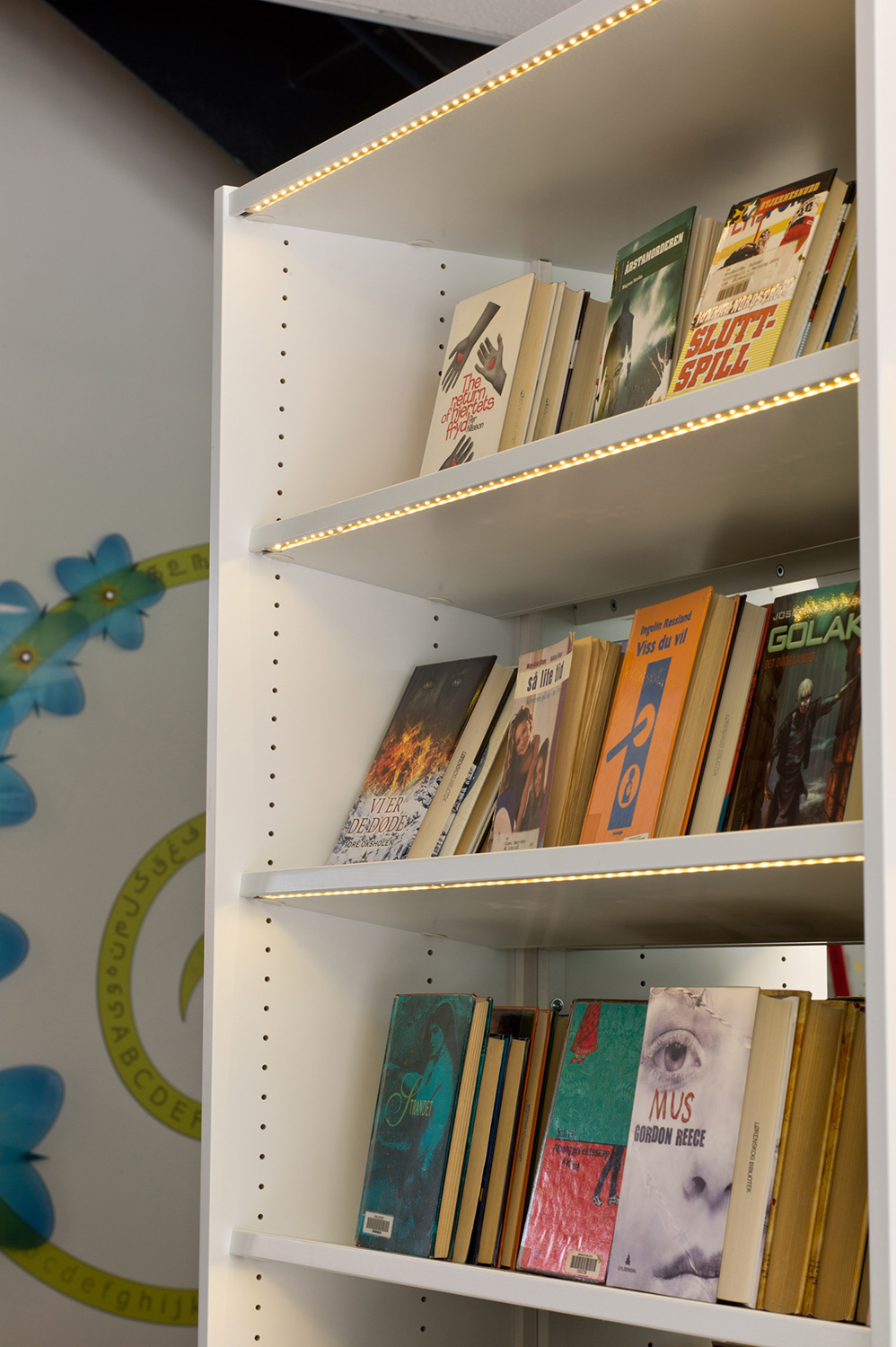 The architects were challenged by the library manager Berit Bjørkild to design her dream shelf. The mission was to design a shelving system with shelves, which could “sell” the books, inspired by the commercial bookstores. Customized shelves, lighting and unique interior solutions should help presenting the cover of the books in an optimal way. The customized shelves tilt slightly backwards, making it possible to display the front of the books without the risk of books falling off.