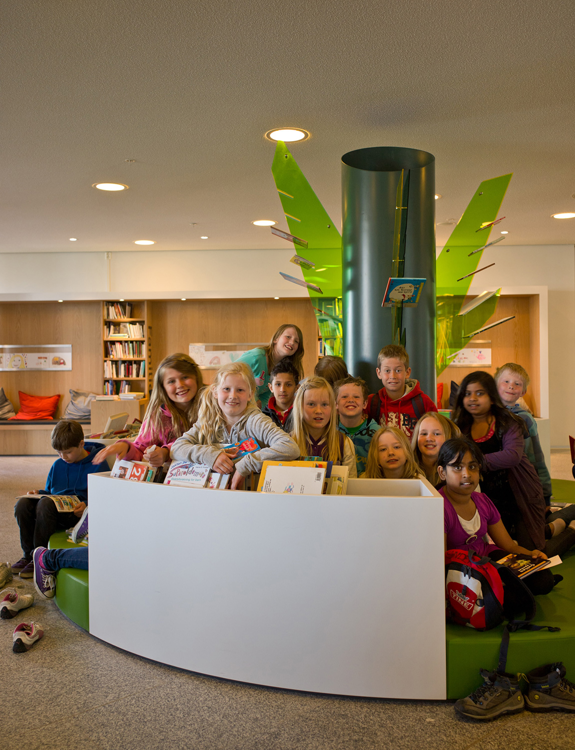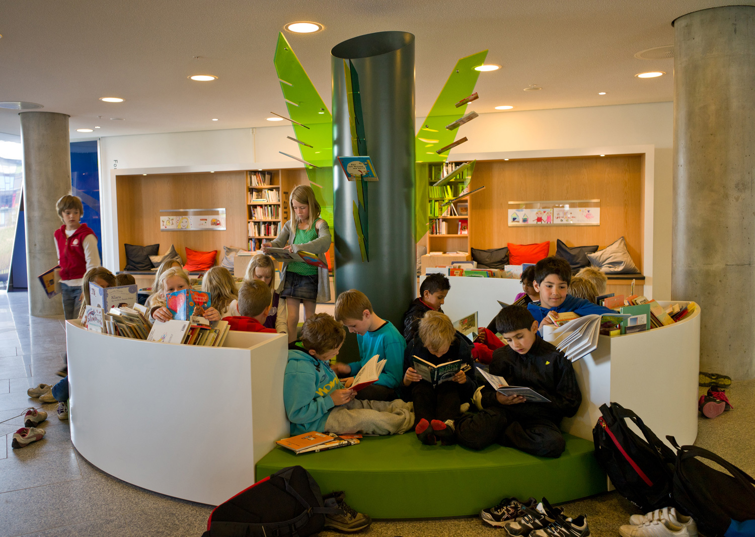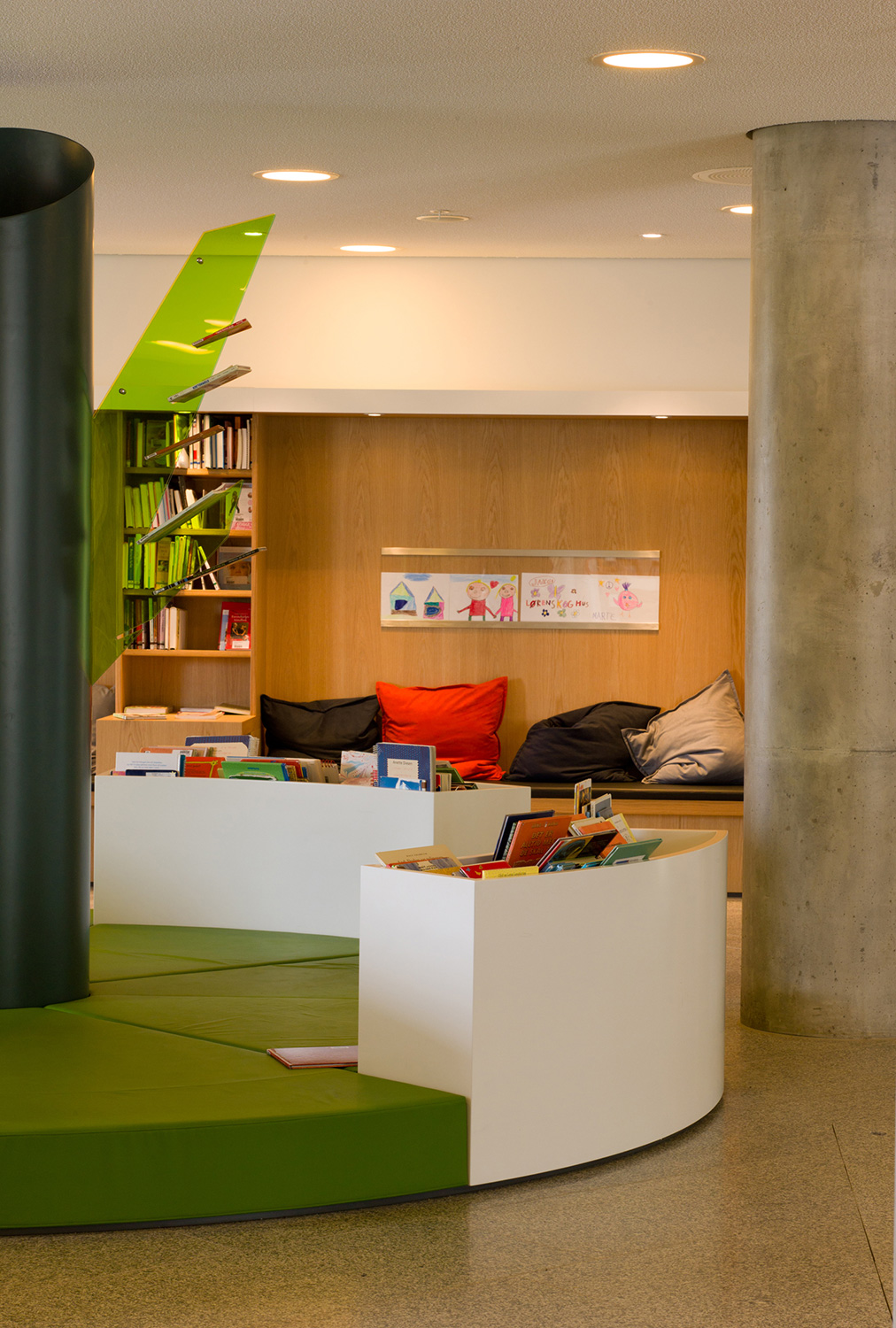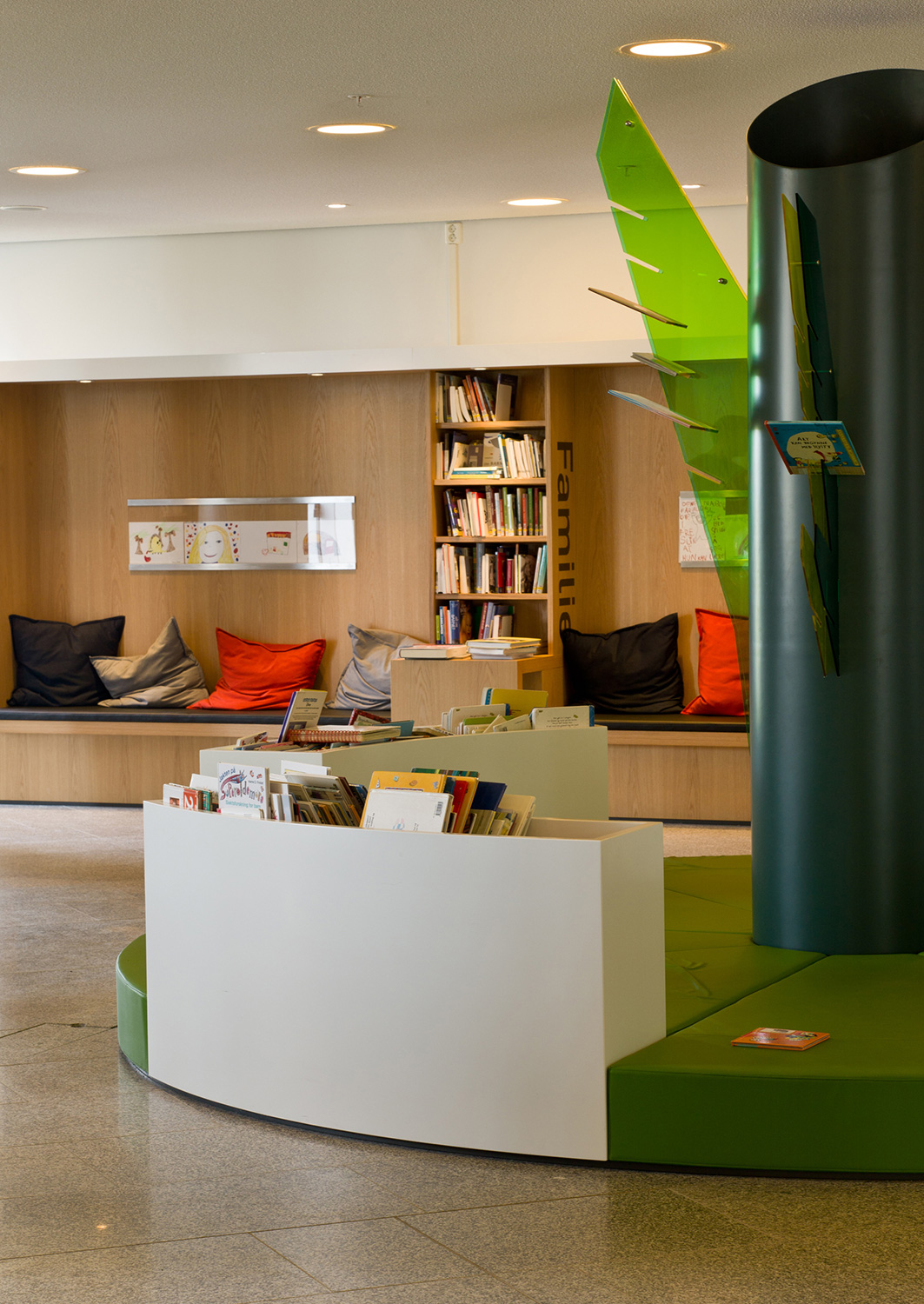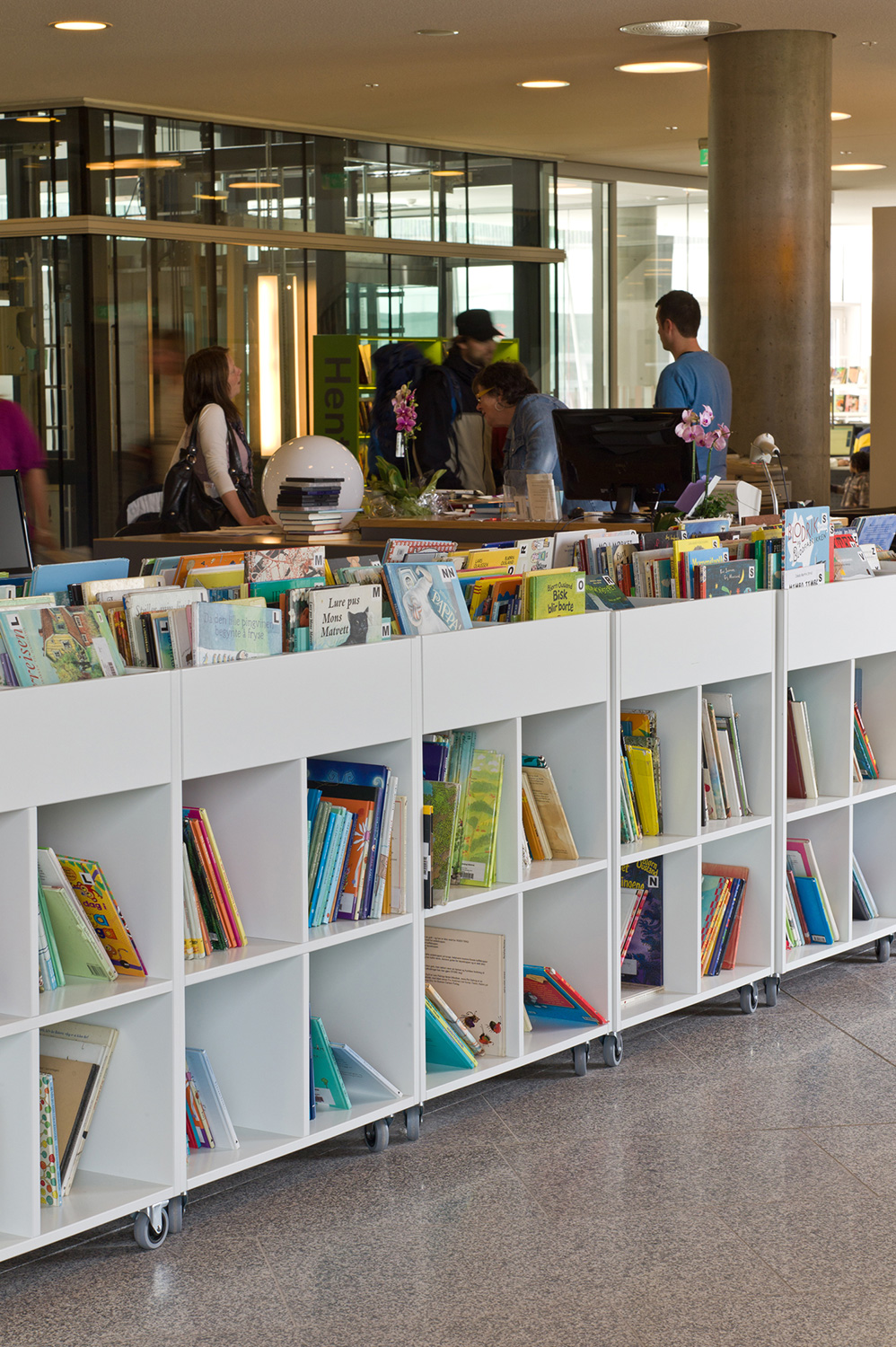 The architects were challenged by the library manager Berit Bjørkild to design her dream shelf. The mission was to design a shelving system with shelves, which could “sell” the books, inspired by the commercial bookstores. Customized shelves, lighting and unique interior solutions should help presenting the cover of the books in an optimal way. The customized shelves tilt slightly backwards, making it possible to display the front of the books without the risk of books falling off.