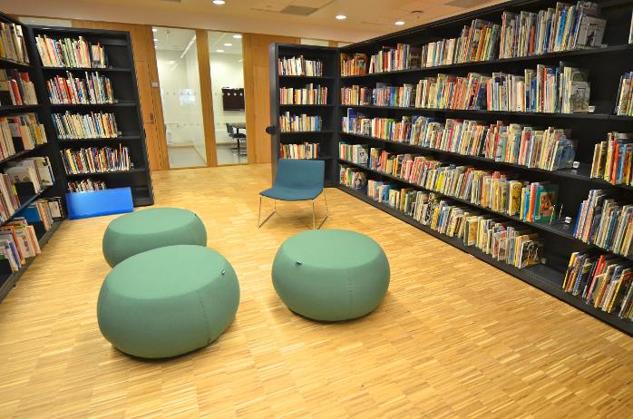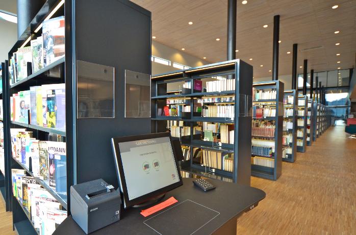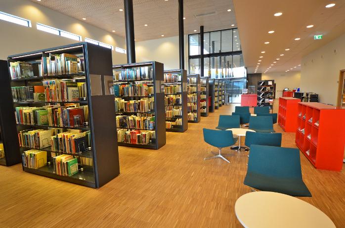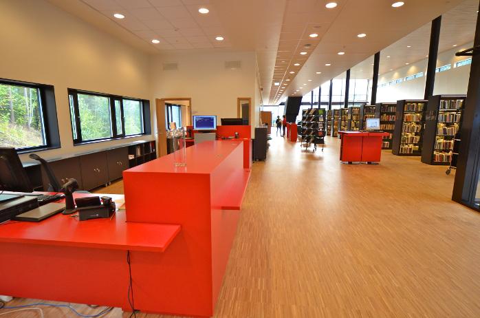 The building is 7600 square feet and houses among other things a large library with a wonderful view of the landscape. Already at the beginning of school, the students and the employed putted the building into use. One of the places where the students spends a lot of time is in the new library where the majority of the furniture is comprised of customized steel shelving systems framed with thick MDF end panels.
