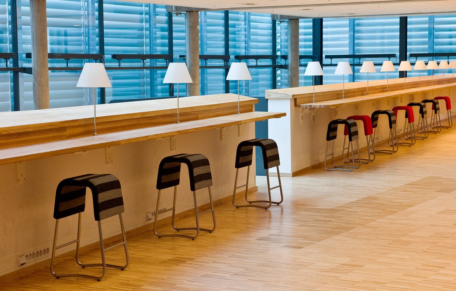 The eastern façade is characterized by large glass sections that make the most out of the daylight and give a stunning atmosphere inside the building.