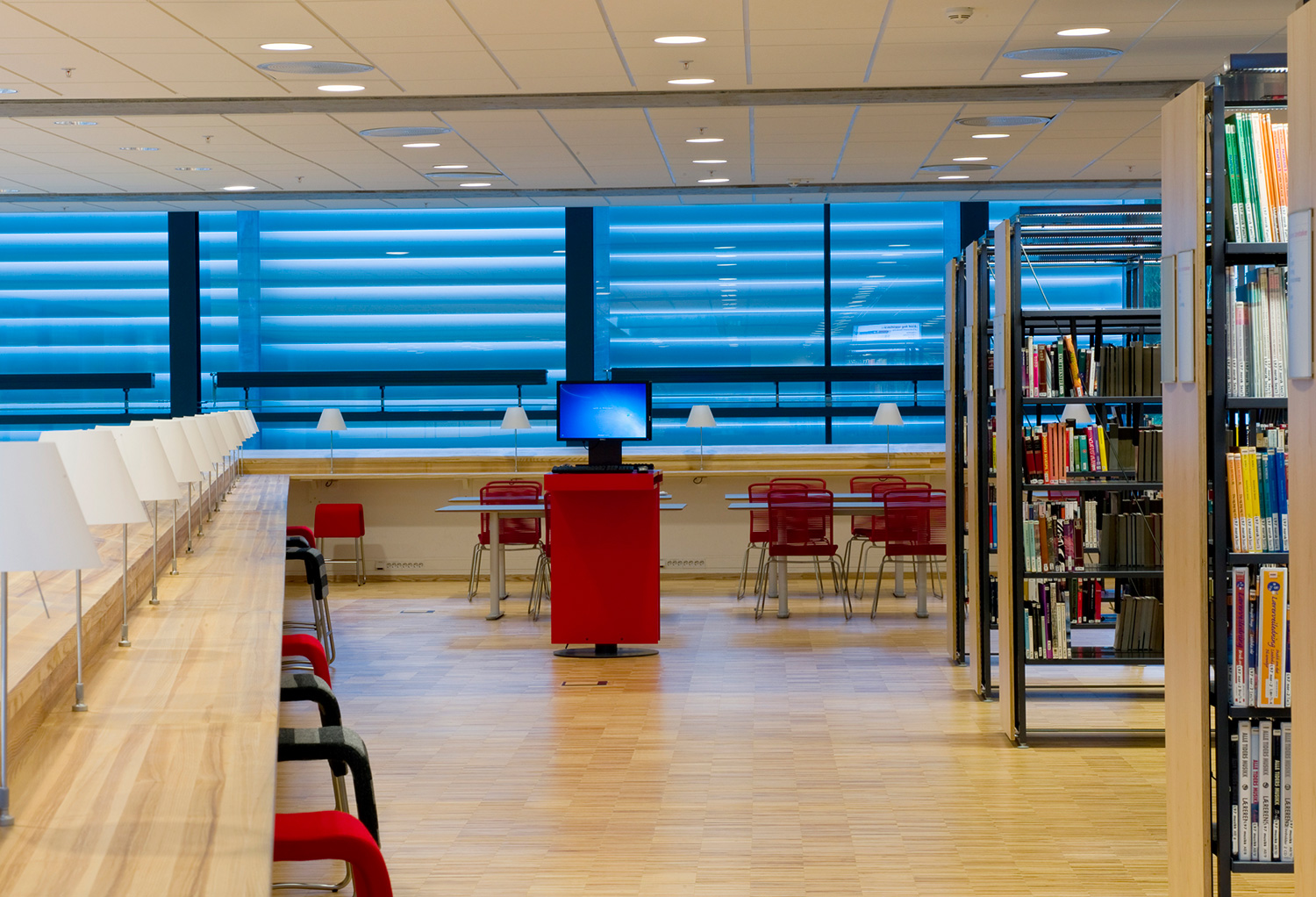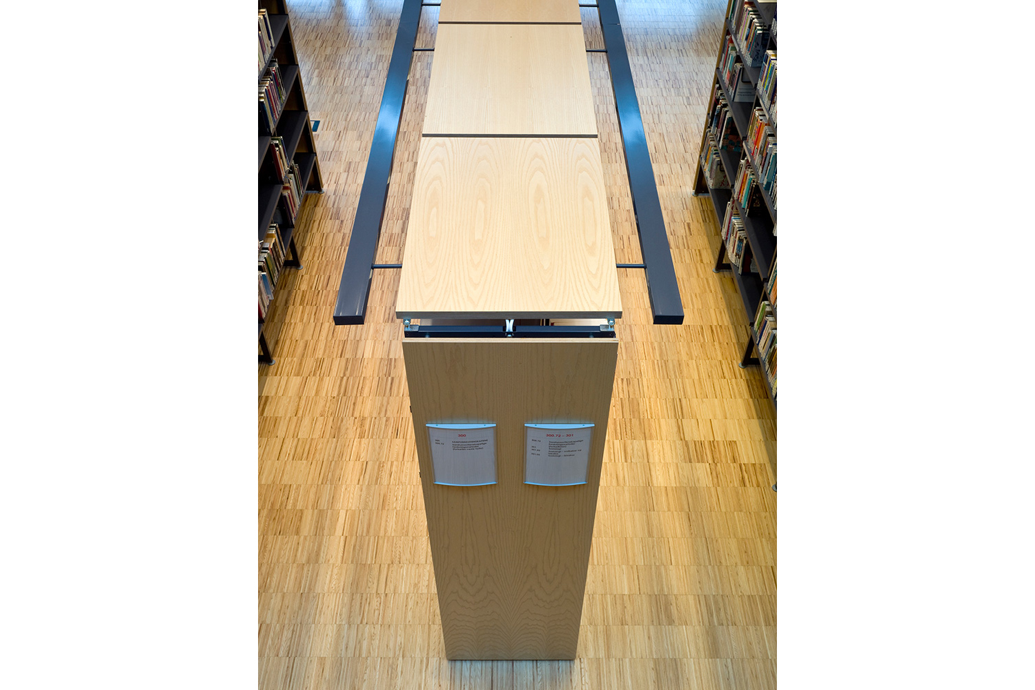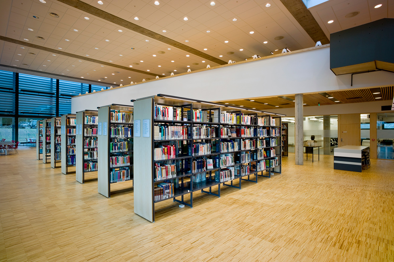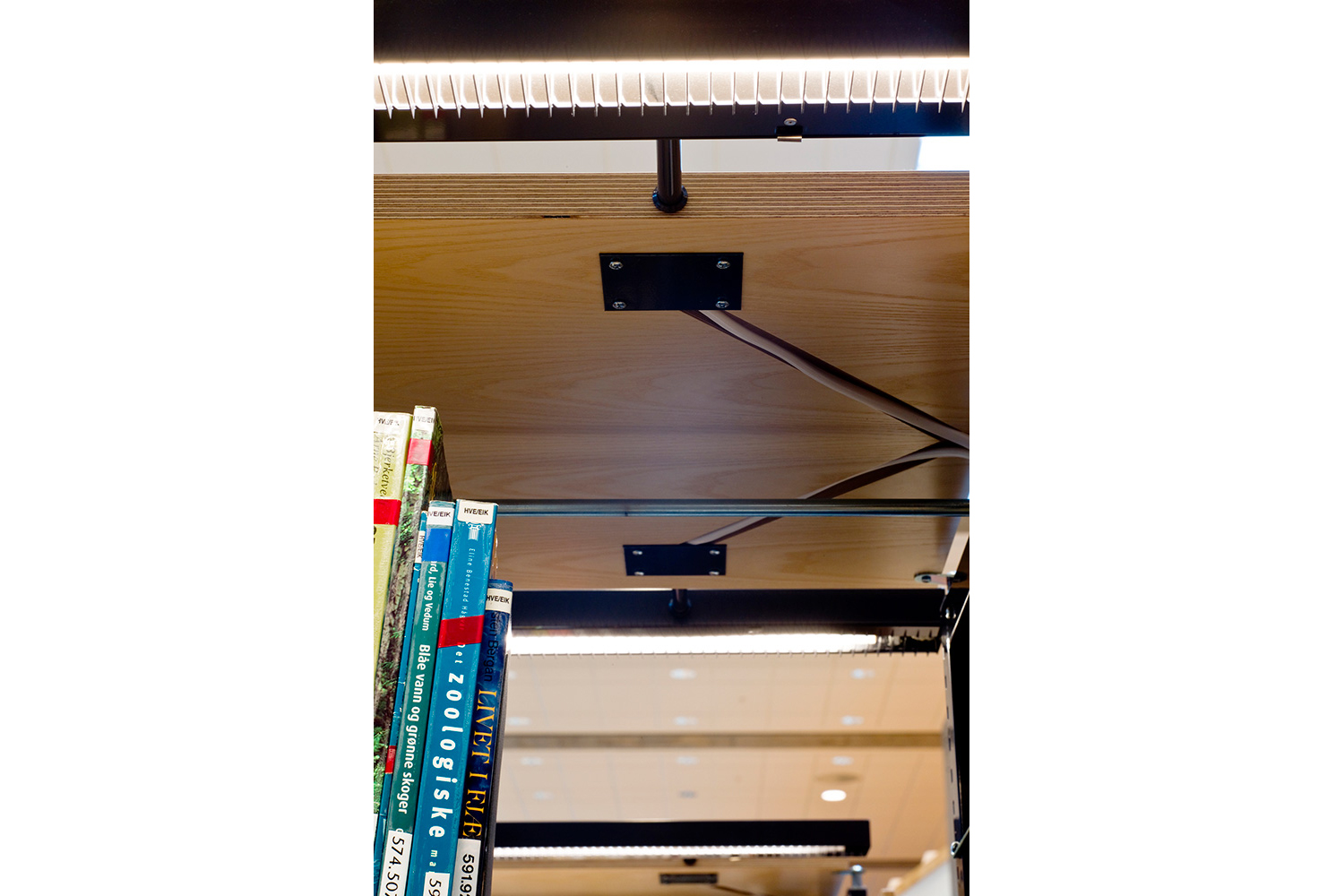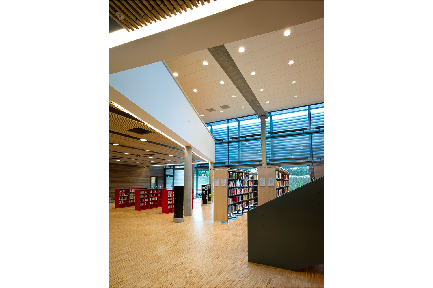 The library furniture consists of a charcoal coloured Opal Shelving System with Book Big lighting, andend-panels and canopy of ash-tree.