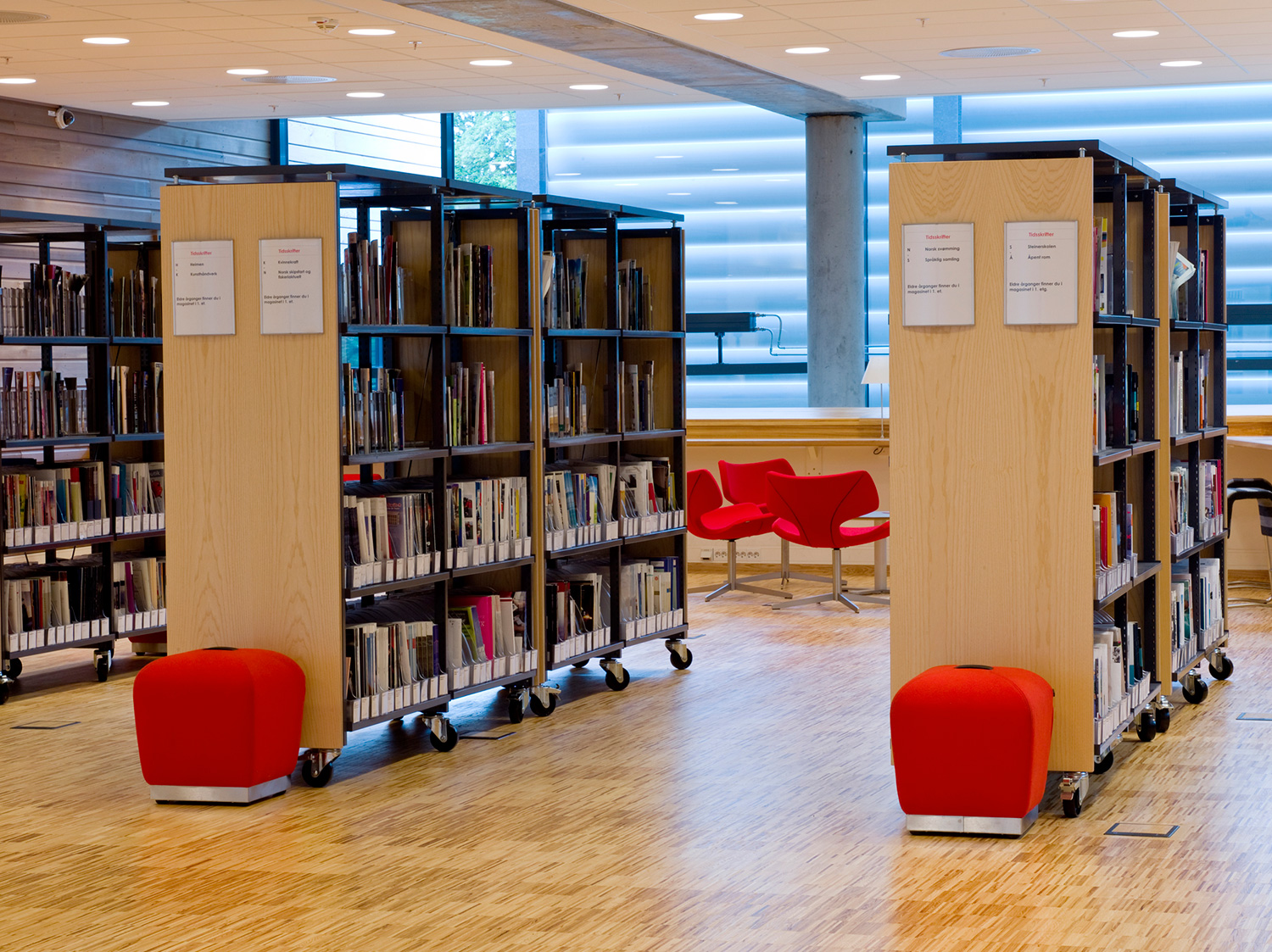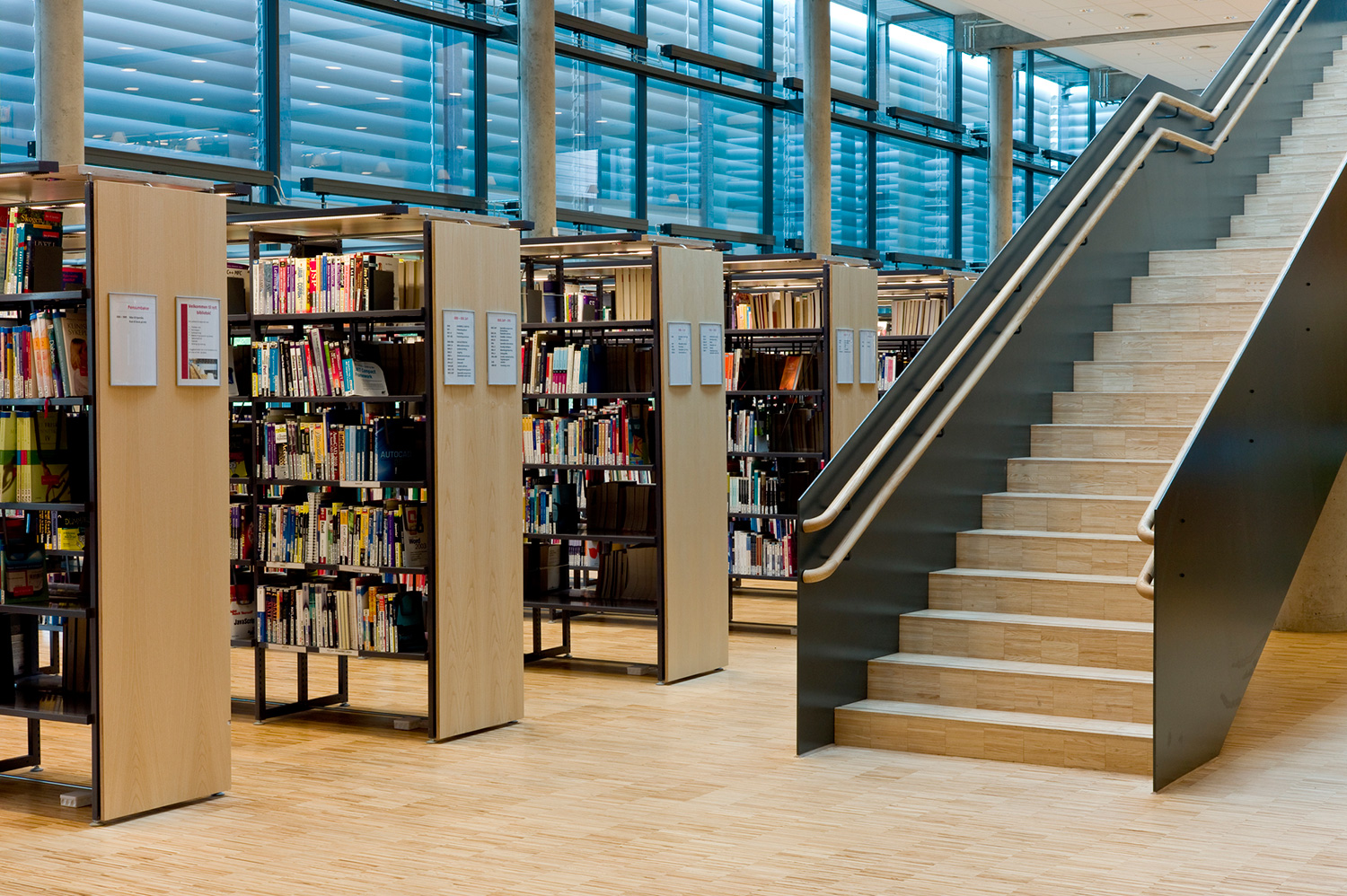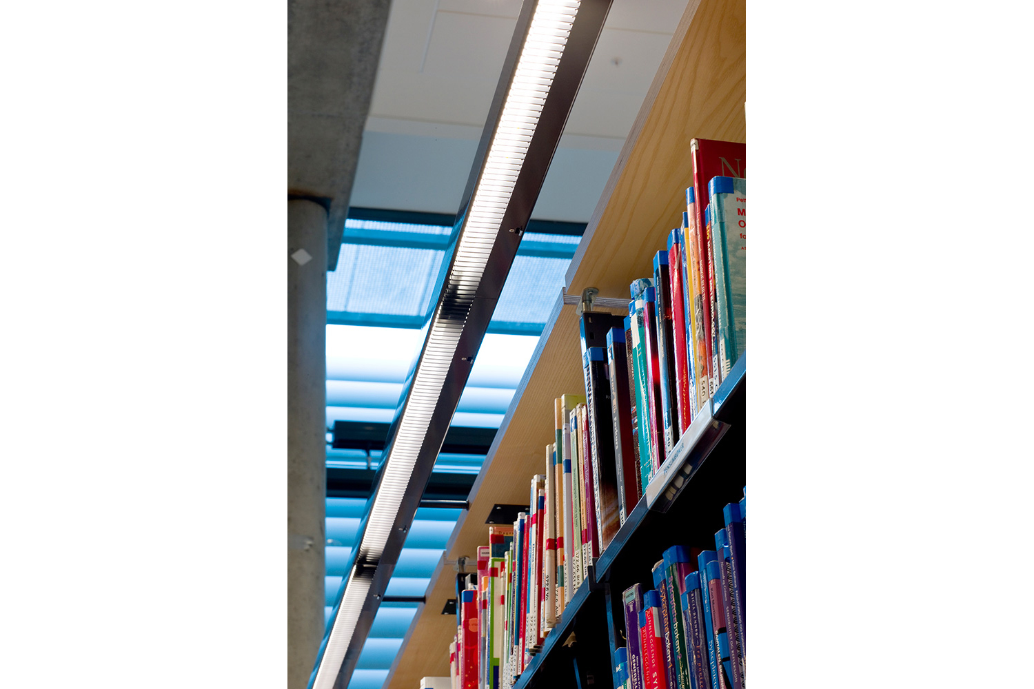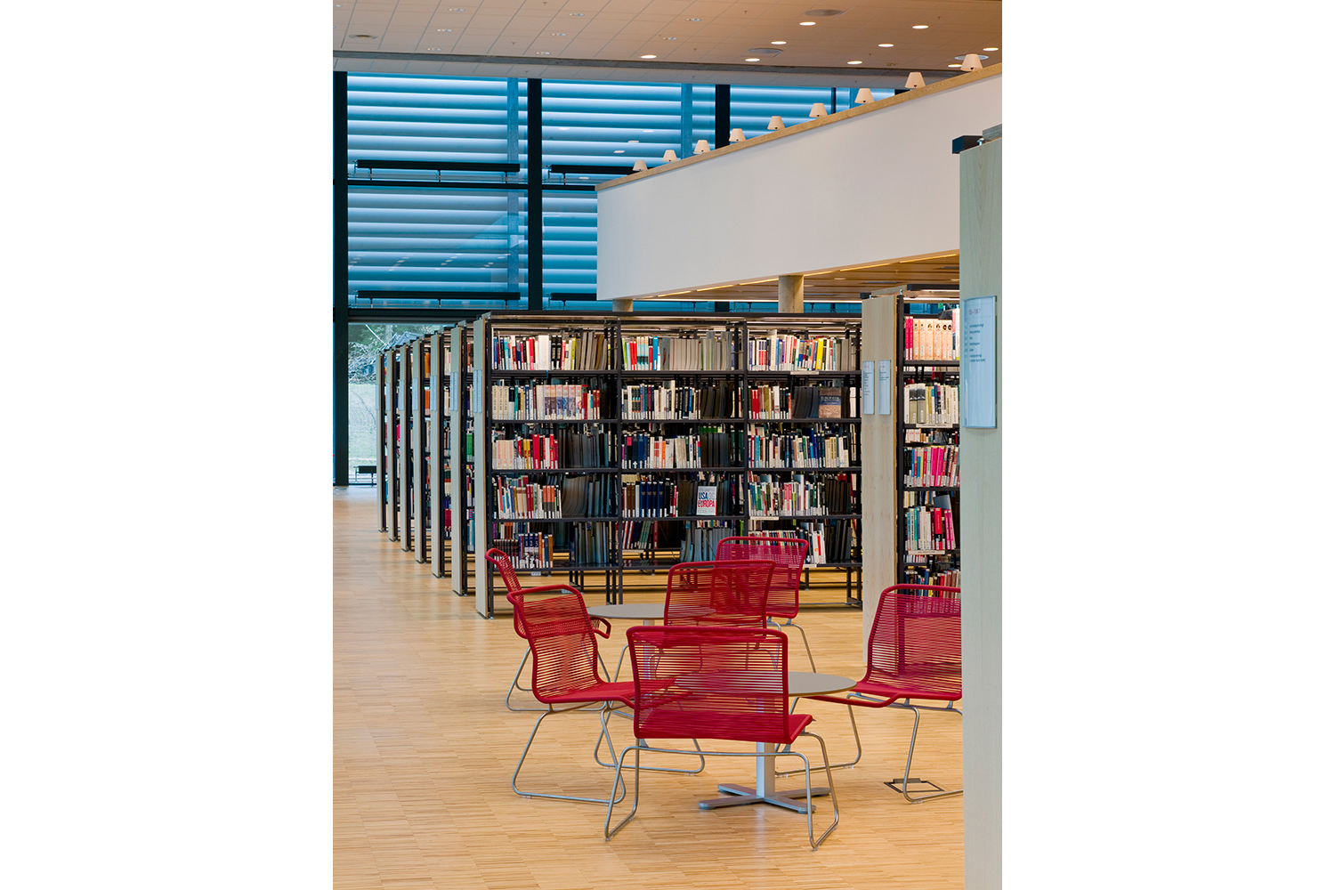 The library furniture consists of a charcoal coloured Opal Shelving System with Book Big lighting, andend-panels and canopy of ash-tree.