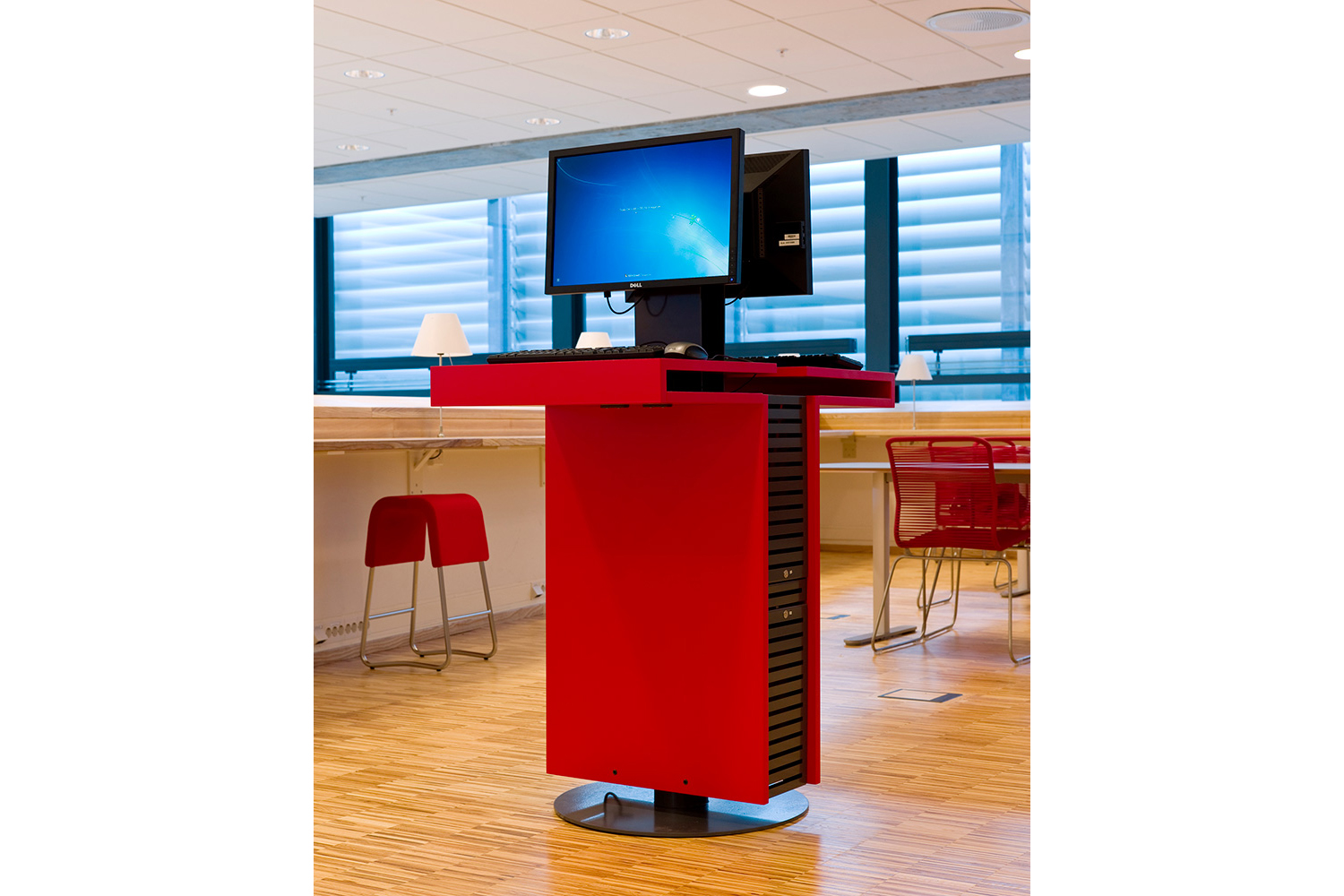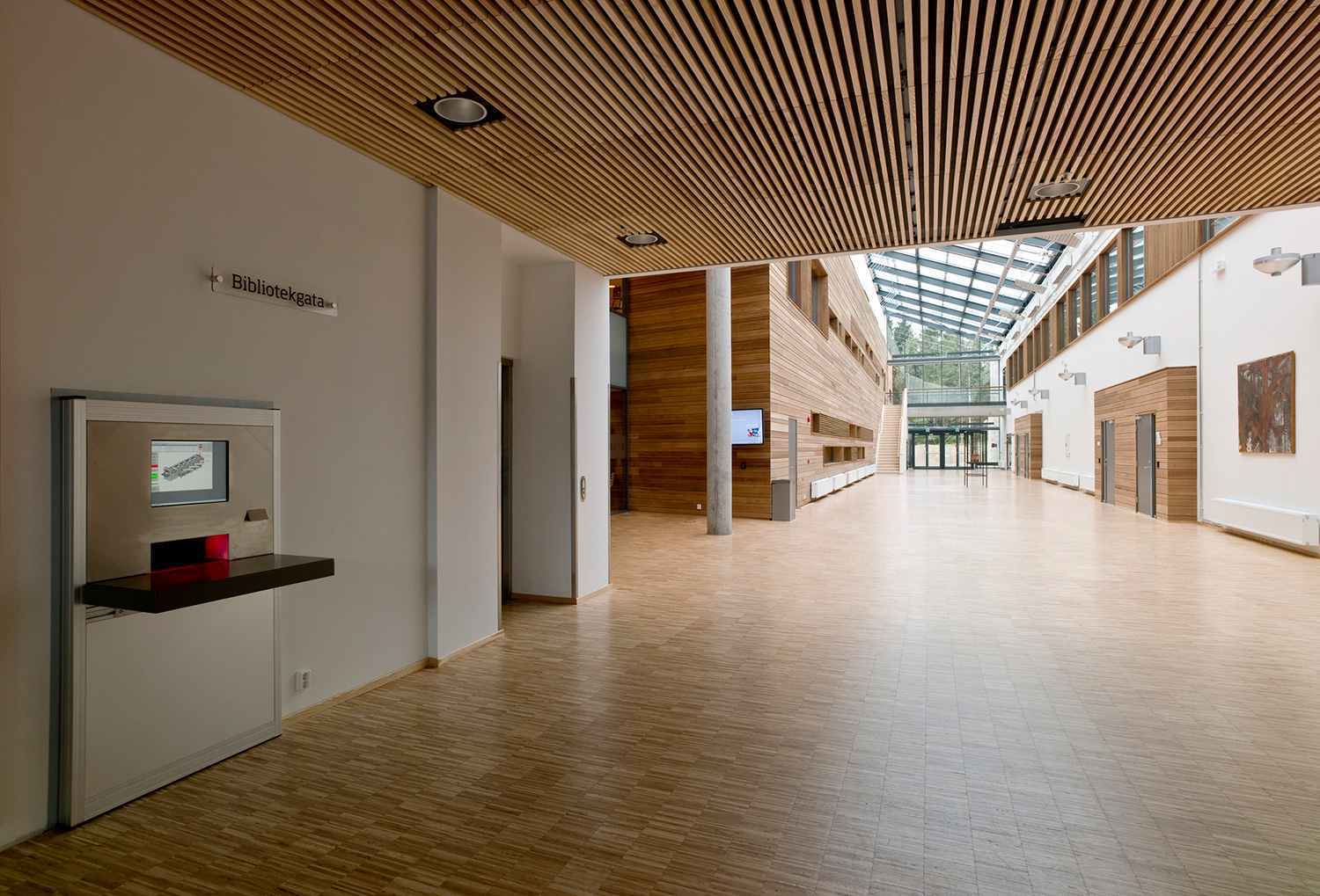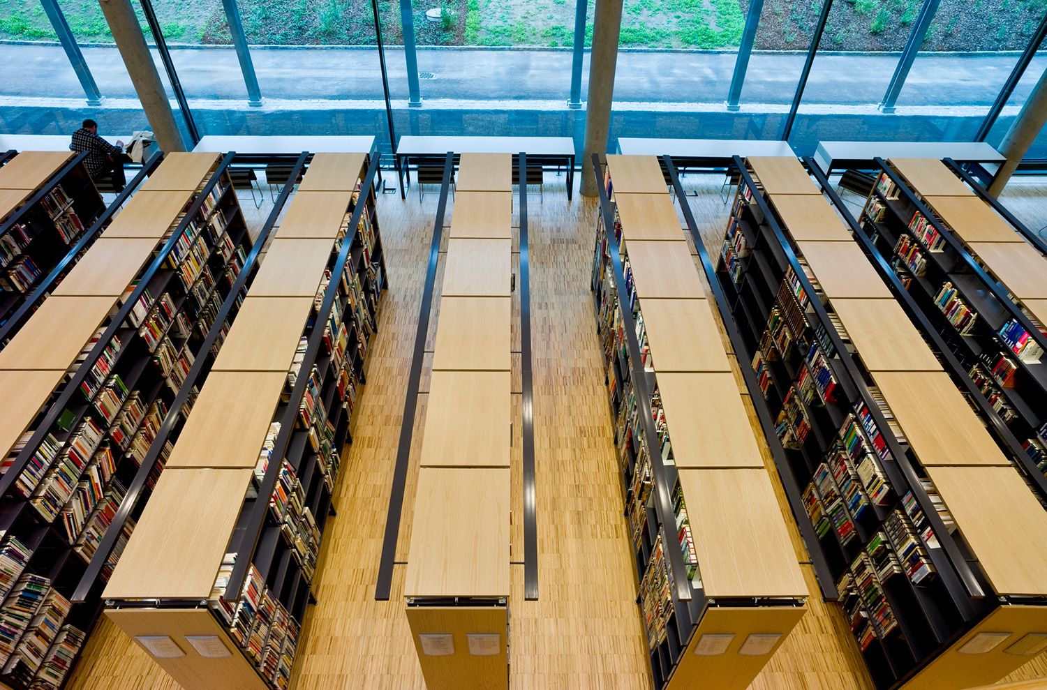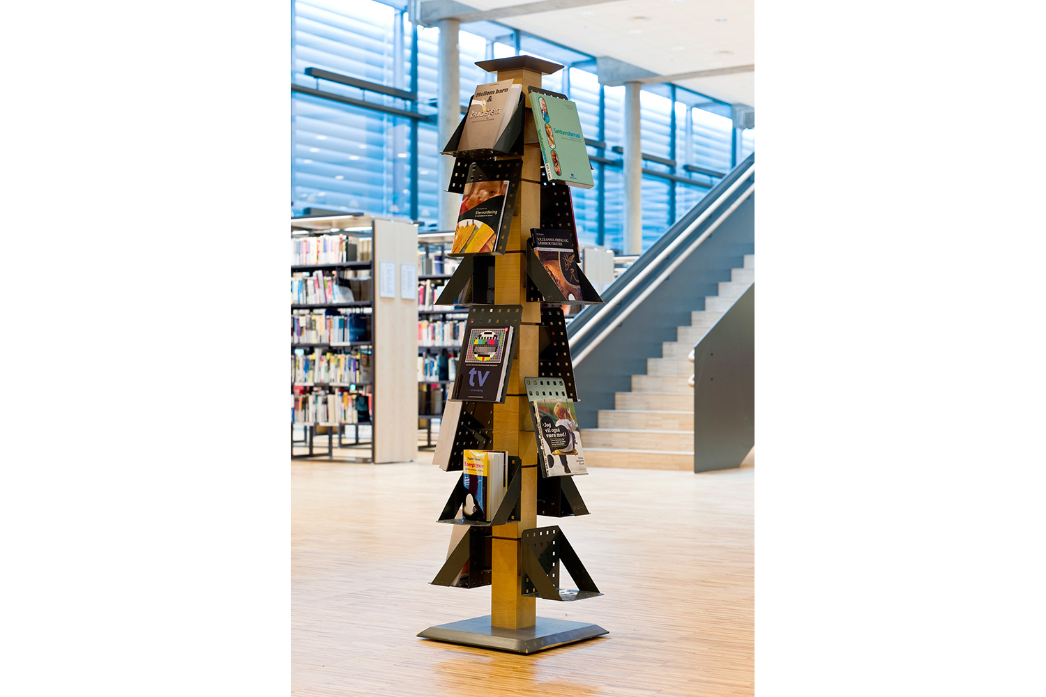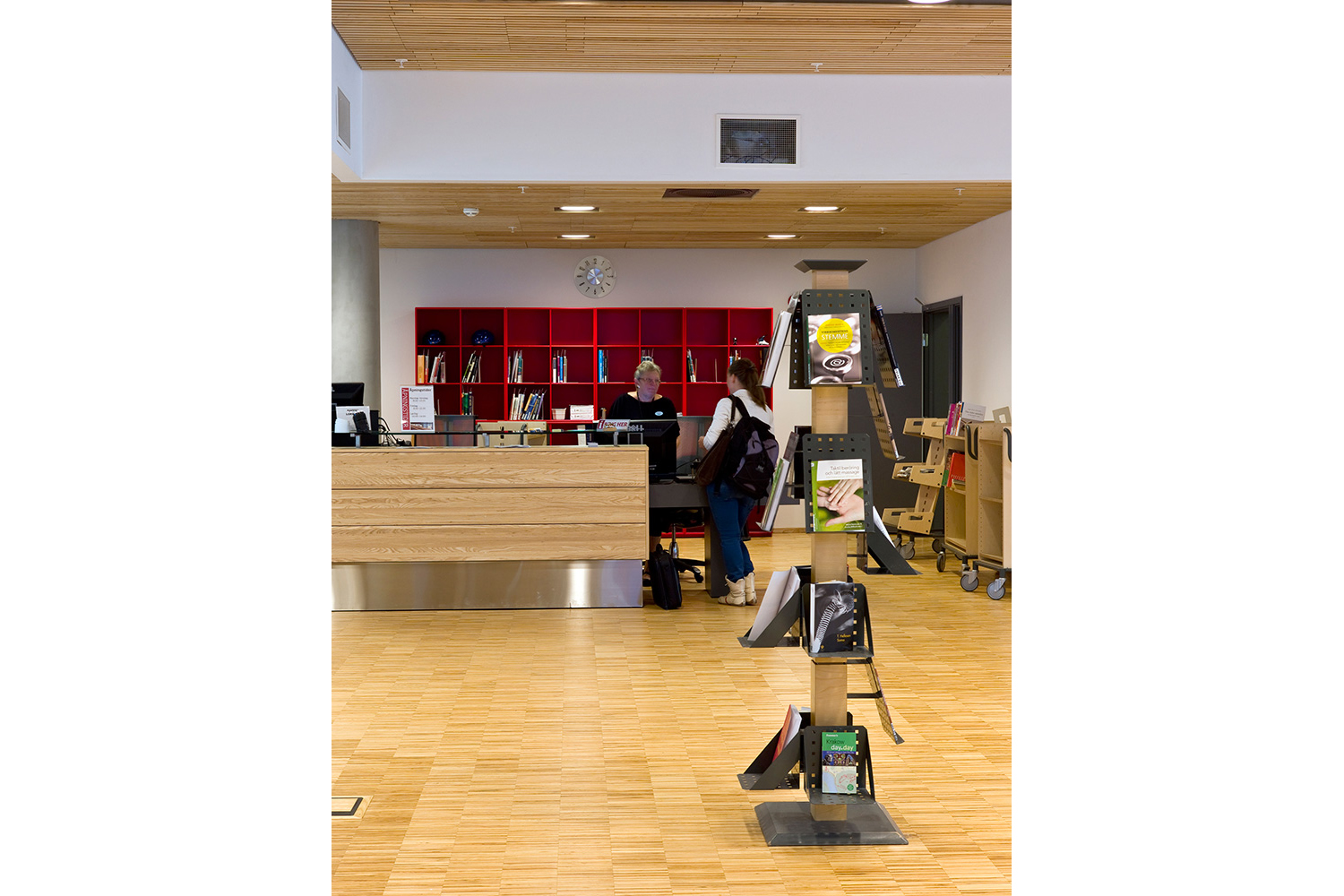 The library furniture consists of a charcoal coloured Opal Shelving System with Book Big lighting, andend-panels and canopy of ash-tree.