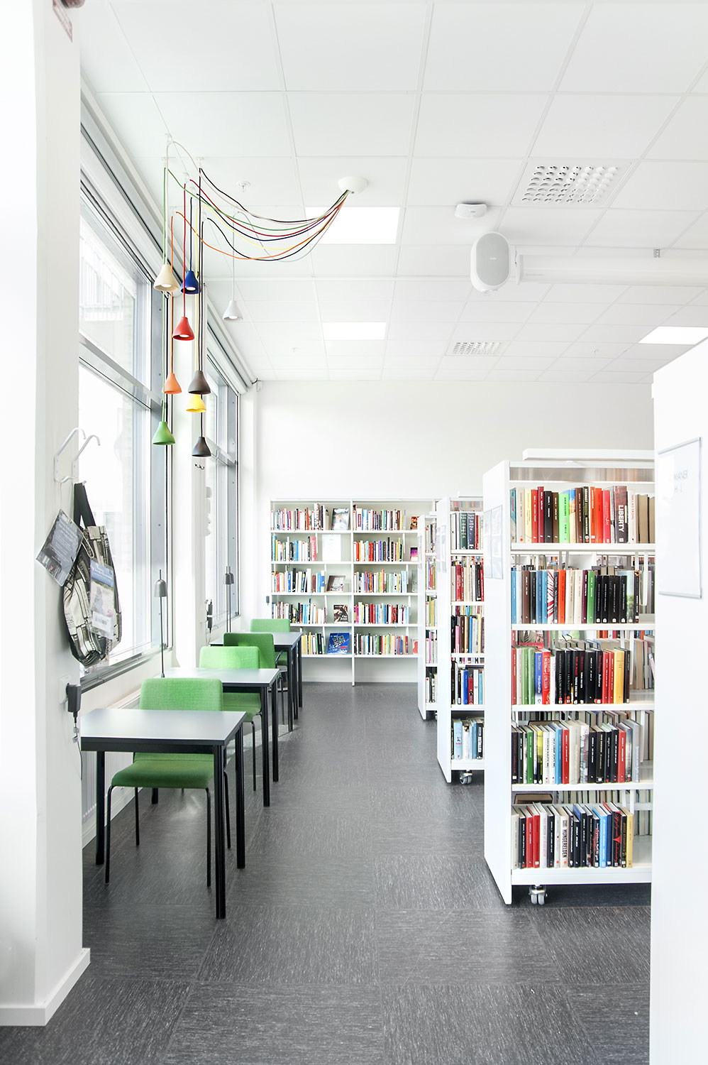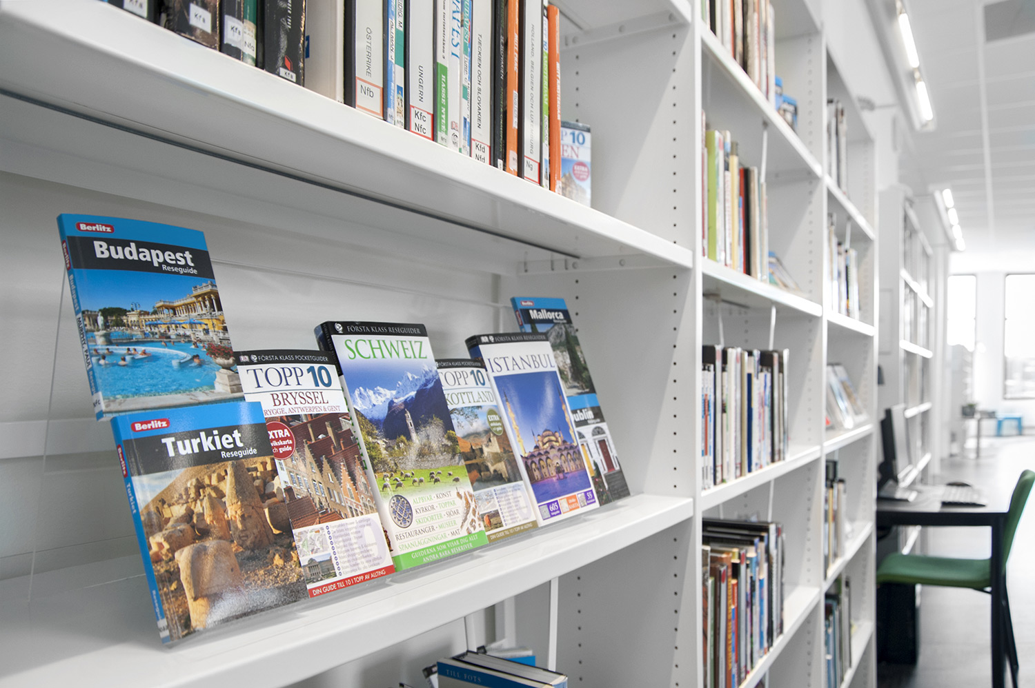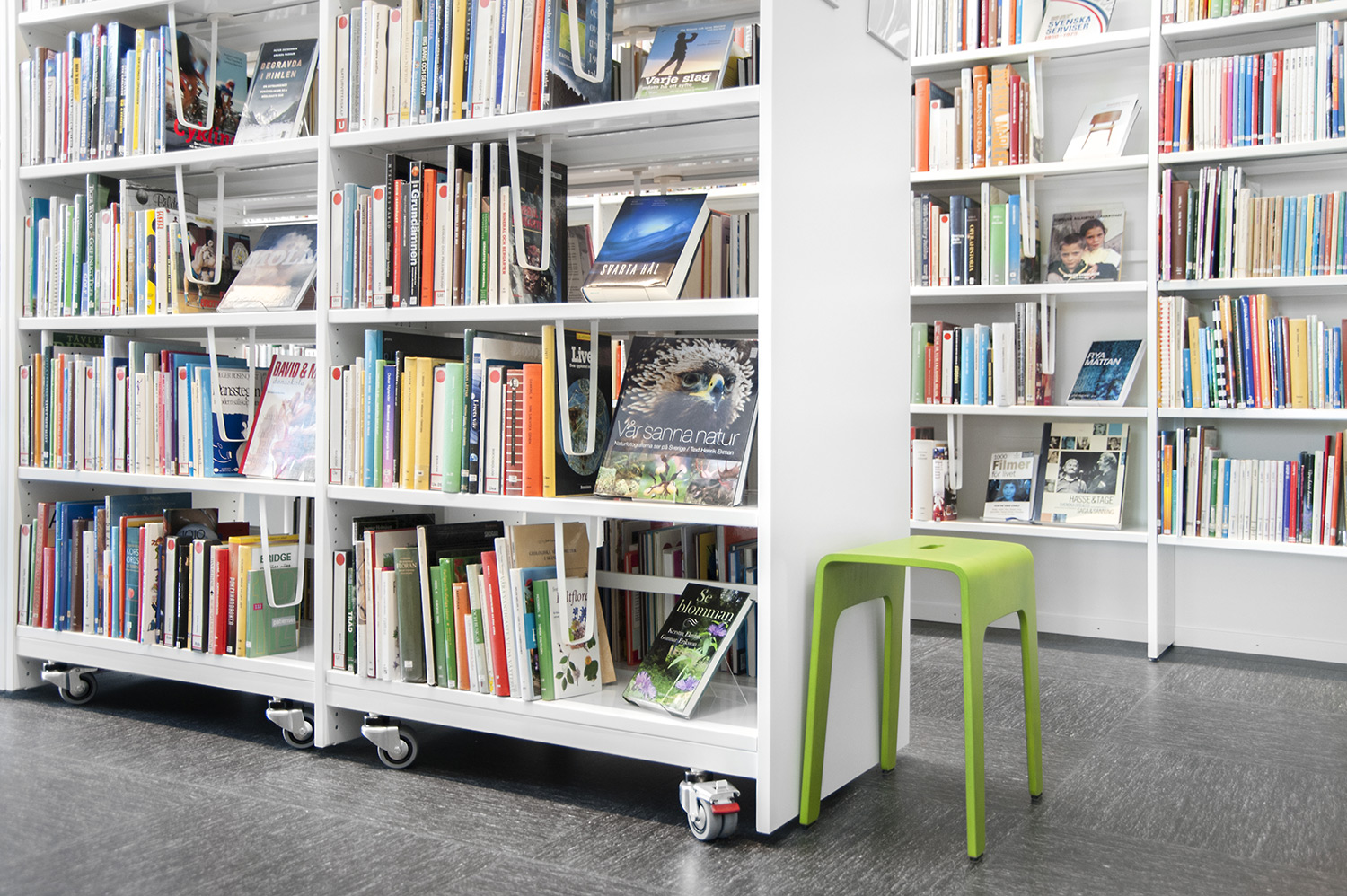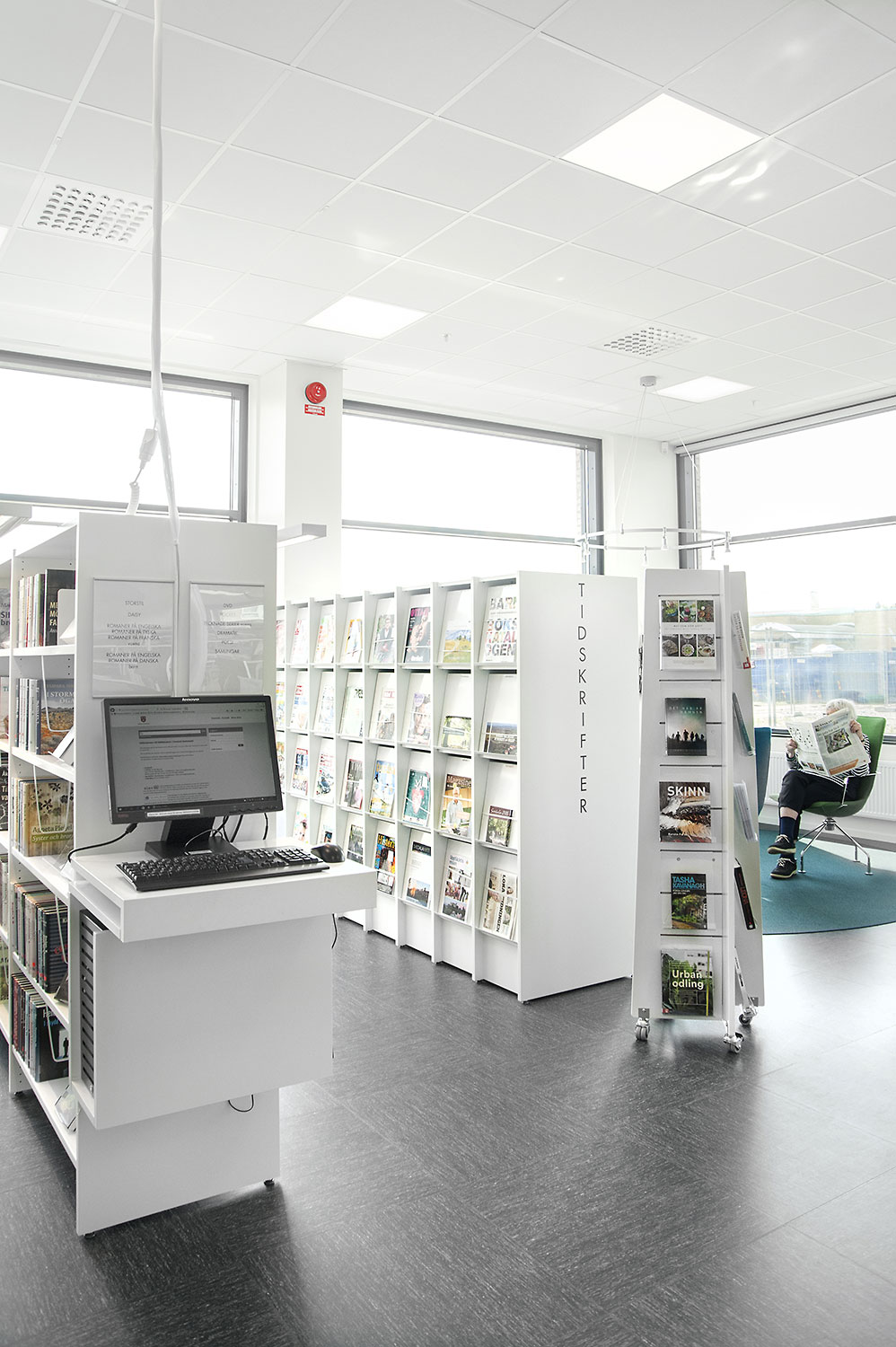 The library is equipped with white Frontline shelving system supplied with different functions such as magazine storage and display shelves. The shelving system is placed so that it is accessible no matter where in the room you are.