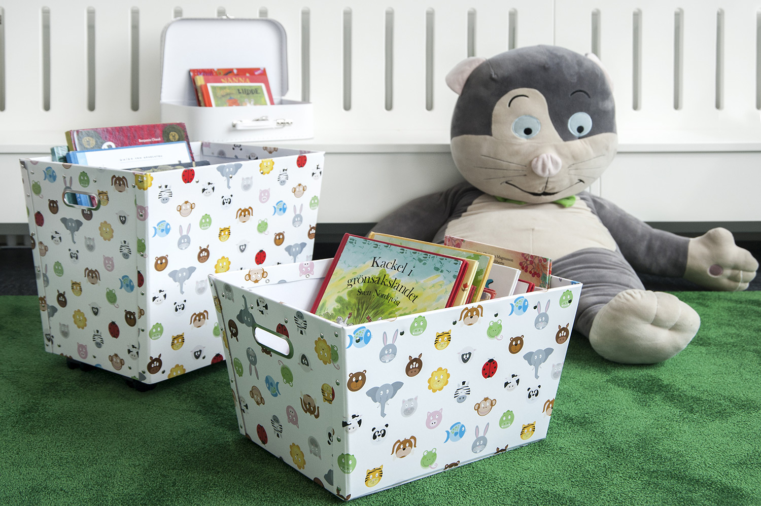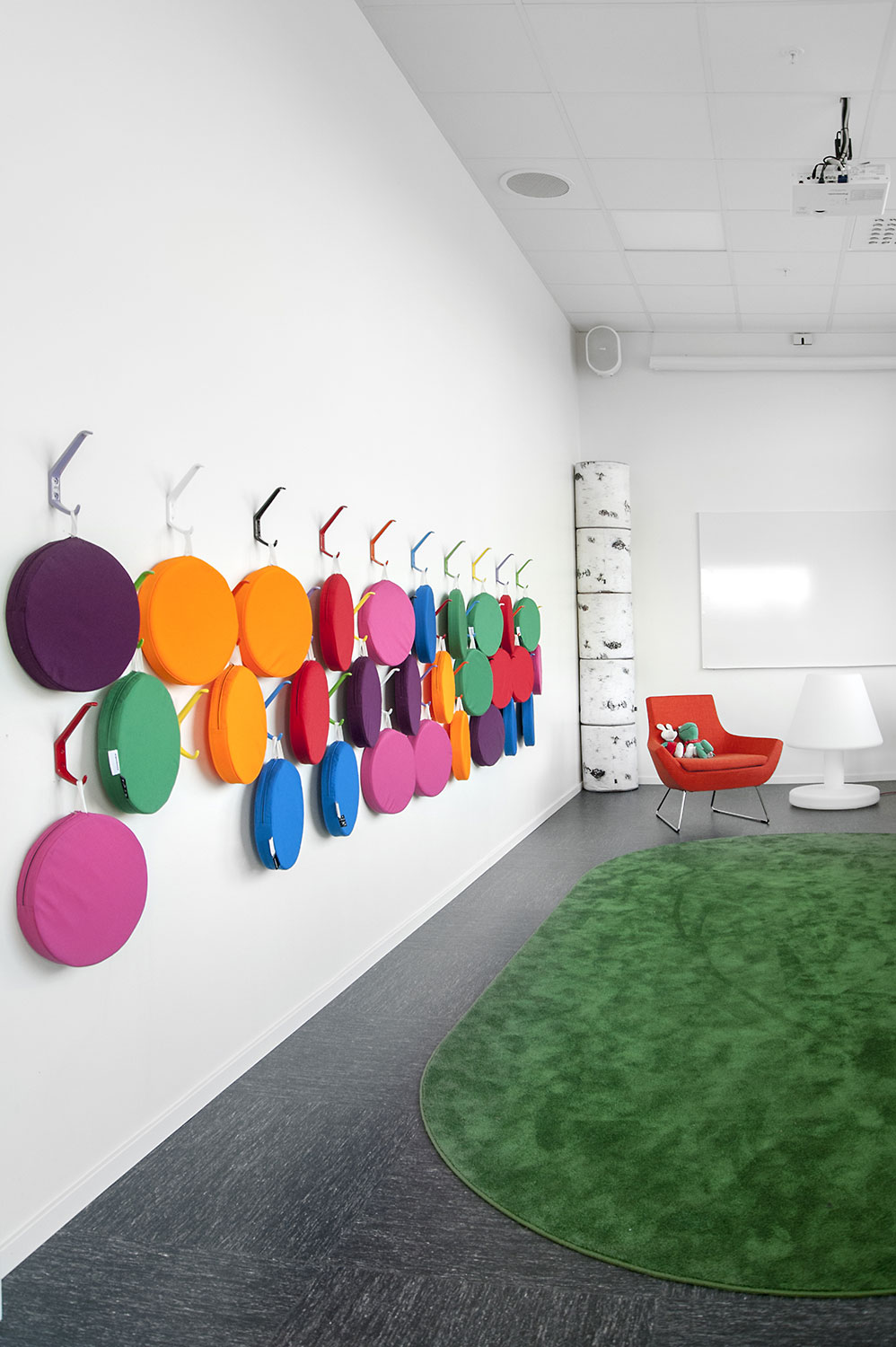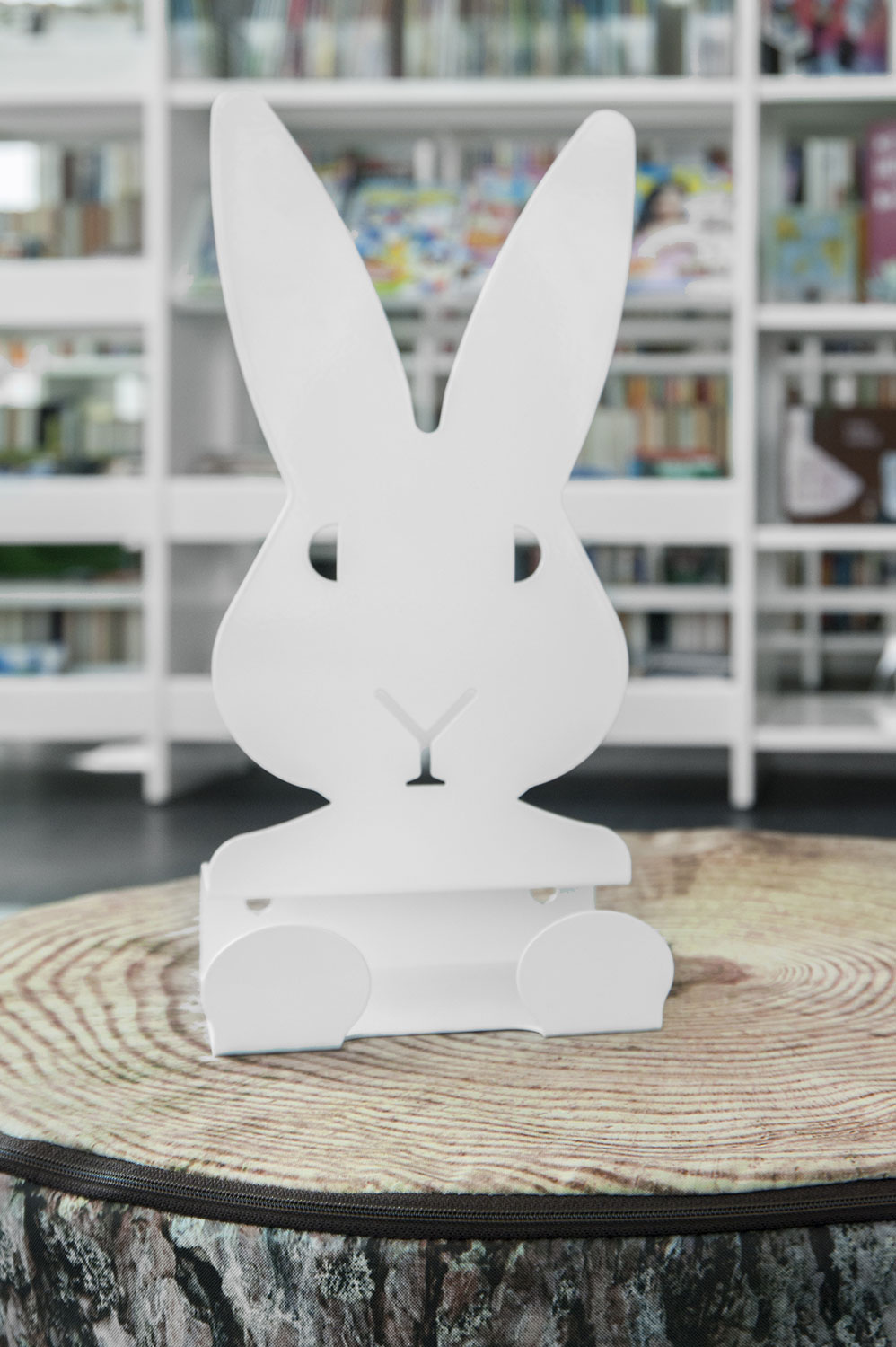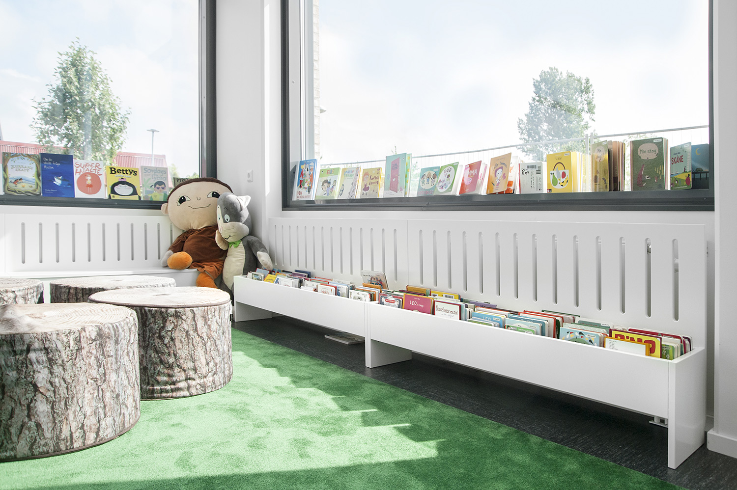 The library is equipped with white Frontline shelving system supplied with different functions such as magazine storage and display shelves. The shelving system is placed so that it is accessible no matter where in the room you are.