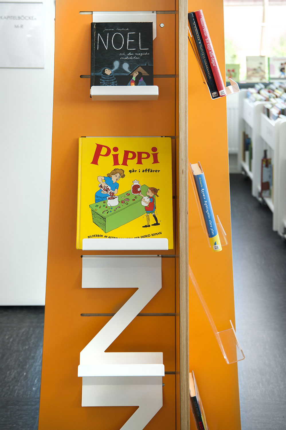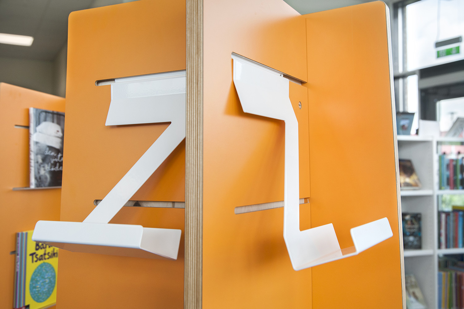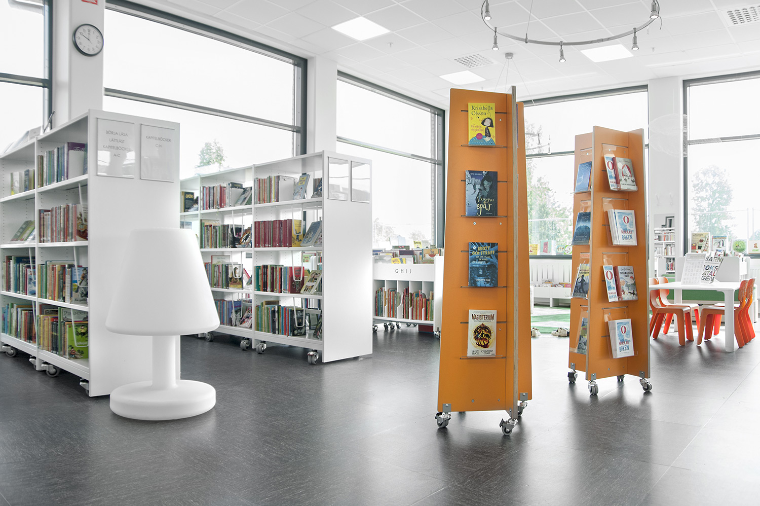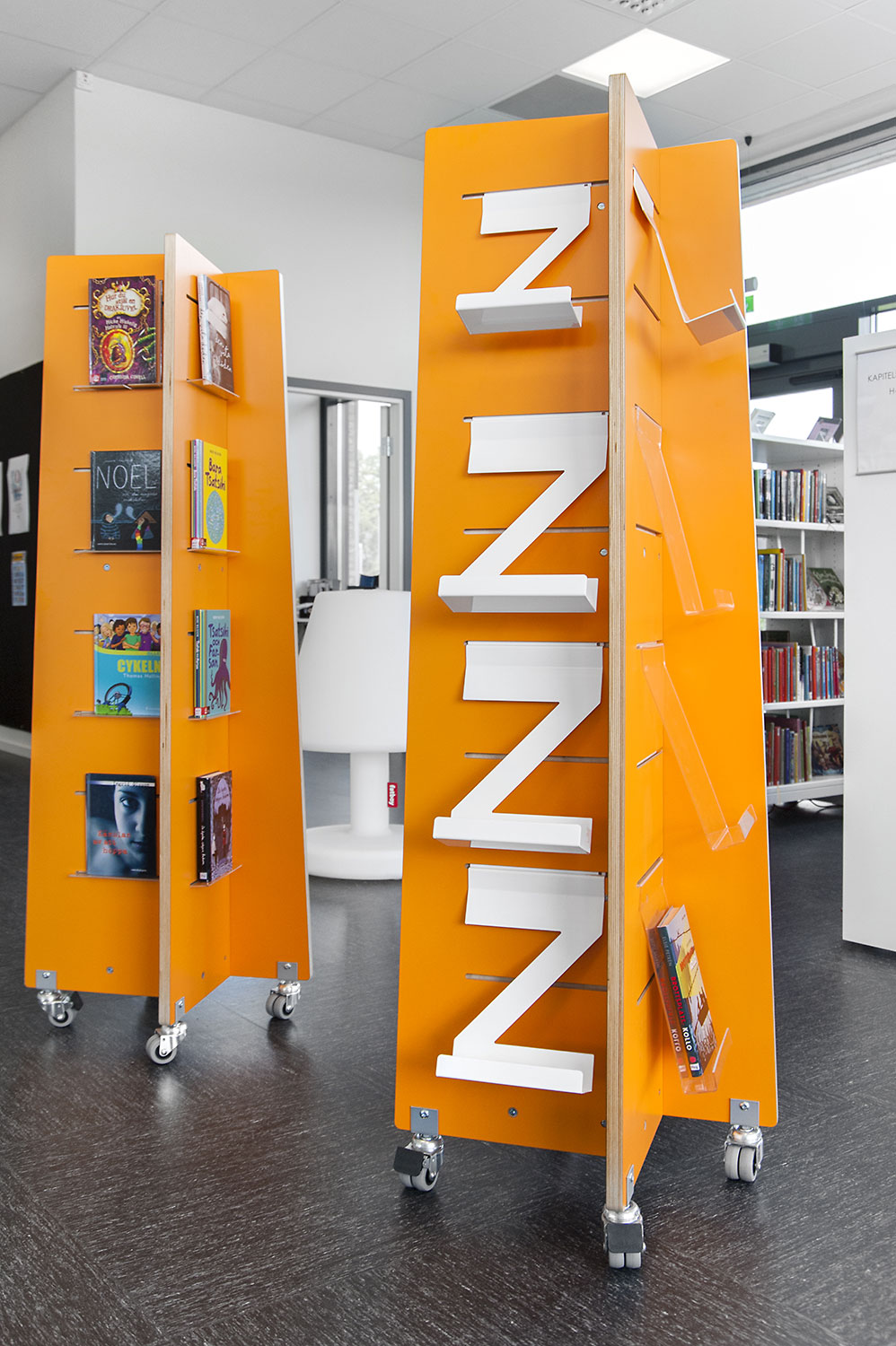 The shelving system partly needed to be with castors and moveable for increased flexibility and possibility to use parts of the room for different events. In some places end panels are used for Eureka search station, other places they are used as signage. To display news, themes and create interest, Quattro display towers in white and orange are used in two different heights.